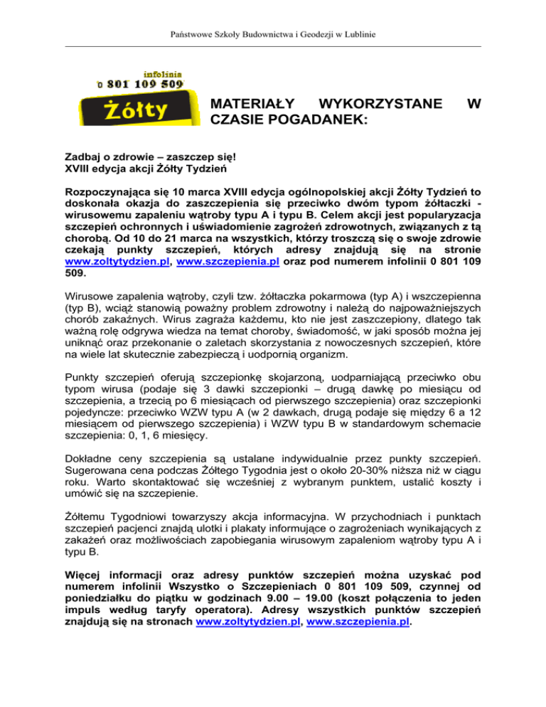 Państwowe Szkoły Budownictwa i Geodezji w Lublinie MATERIAŁY WYKORZYSTANE CZASIE POGADANEK: W Zadbaj o zdrowie – zaszczep się! XVIII edycja akcji Żółty Tydzień Rozpoczynająca się 10 marca XVIII edycja ogólnopolskiej akcji Żółty Tydzień to doskonała okazja do zaszczepienia się przeciwko dwóm typom żółtaczki wirusowemu zapaleniu wątroby typu A i typu B. Celem akcji jest popularyzacja szczepień ochronnych i uświadomienie zagrożeń zdrowotnych, związanych z tą chorobą. Od 10 do 21 marca na wszystkich, którzy troszczą się o swoje zdrowie czekają punkty szczepień, których adresy znajdują się na stronie www.zoltytydzien.pl, www.szczepienia.pl oraz pod numerem infolinii 0 801 109 509. Wirusowe zapalenia wątroby, czyli tzw. żółtaczka pokarmowa (typ A) i wszczepienna (typ B), wciąż stanowią poważny problem zdrowotny i należą do najpoważniejszych chorób zakaźnych. Wirus zagraża każdemu, kto nie jest zaszczepiony, dlatego tak ważną rolę odgrywa wiedza na temat choroby, świadomość, w jaki sposób można jej uniknąć oraz przekonanie o zaletach skorzystania z nowoczesnych szczepień, które na wiele lat skutecznie zabezpieczą i uodpornią organizm. Punkty szczepień oferują szczepionkę skojarzoną, uodparniającą przeciwko obu typom wirusa (podaje się 3 dawki szczepionki – drugą dawkę po miesiącu od szczepienia, a trzecią po 6 miesiącach od pierwszego szczepienia) oraz szczepionki pojedyncze: przeciwko WZW typu A (w 2 dawkach, drugą podaje się między 6 a 12 miesiącem od pierwszego szczepienia) i WZW typu B w standardowym schemacie szczepienia: 0, 1, 6 miesięcy. Dokładne ceny szczepienia są ustalane indywidualnie przez punkty szczepień. Sugerowana cena podczas Żółtego Tygodnia jest o około 20-30% niższa niż w ciągu roku. Warto skontaktować się wcześniej z wybranym punktem, ustalić koszty i umówić się na szczepienie. Żółtemu Tygodniowi towarzyszy akcja informacyjna. W przychodniach i punktach szczepień pacjenci znajdą ulotki i plakaty informujące o zagrożeniach wynikających z zakażeń oraz możliwościach zapobiegania wirusowym zapaleniom wątroby typu A i typu B. Więcej informacji oraz adresy punktów szczepień można uzyskać pod numerem infolinii Wszystko o Szczepieniach 0 801 109 509, czynnej od poniedziałku do piątku w godzinach 9.00 – 19.00 (koszt połączenia to jeden impuls według taryfy operatora). Adresy wszystkich punktów szczepień znajdują się na stronach www.zoltytydzien.pl, www.szczepienia.pl. Państwowe Szkoły Budownictwa i Geodezji w Lublinie WZW typu A Wirusowe zapalenie wątroby typu A (wzw typu A), tzw. "żółtaczka pokarmowa" Jak dochodzi do zakażenia? Zakażenie następuje poprzez spożycie zanieczyszczonej wirusami wody pitnej, oraz surowych pokarmów w niej mytych. Zachorowaniu sprzyja bliski kontakt z osobami zakażonymi we wczesnym, bezobjawowym okresie choroby, gdy zakażony nie jest jeszcze świadomy infekcji. Czy wzw typu A jest poważną chorobą? Tak, wzw typu A może być poważną chorobą - zwłaszcza u dorosłych. Ponad 40% pacjentów w wieku powyżej 40 roku życia wymaga hospitalizacji. U około 10-20% pacjentów, po początkowej poprawie obserwuje się nawrót choroby. Objawy choroby mogą utrzymywać się, nawet do 6 miesięcy. Osoby z ostrym wzw typu A i współistniejącym przewlekłym schorzeniem wątroby mają większe ryzyko wystąpienia ciężkiego, zagrażającego życiu uszkodzenia wątroby. Czy można zabezpieczyć się przed zachorowaniem na wzw typu A? Tak, przeciwko wirusowemu zapaleniu wątroby typu A dostępna jest szczepionka. Aby ochrona przed infekcją była długotrwała - wymagane są dwie dawki szczepionki podane w schemacie 0, 6 - 12 miesięcy. Szczepienia przeciwko wirusowemu zapaleniu wątroby typu A są szczególnie zalecane: • • • • • • • osobom z przewlekłymi chorobami wątroby, dzieciom i młodzieży w wieku szkoły podstawowej, osobom wyjeżdżającym do krajów o wysokim ryzyku zachorowania na wzw typu A, pracownikom służby zdrowia, pracownikom służb miejskich, pracującym przy dystrybucji żywności i przygotowującym posiłki, mieszkańcom terenów przed spodziewanym wybuchem epidemii wzw typu A oraz terenów gdzie epidemia znajduje się w początkowej fazie rozwoju. Szczepienia przeciwko "żółtaczce pokarmowej" są zalecane przez Głównego Inspektora Sanitarnego. Państwowe Szkoły Budownictwa i Geodezji w Lublinie WZW typu B Czym jest wirusowe zapalenie wątroby typu B? Wirusowe zapalenie wątroby (WZW) typu B, zwane potocznie żółtaczką wszczepienną, czy też żółtaczką typu B jest jedną z najpoważniejszych i najgroźniejszych chorób zakaźnych. Wirusem WZW typu B zakażamy się o wiele łatwiej niż wirusem HIV. Ryzykuje każdy, kto nie jest zaszczepiony. Wirus zapalenia wątroby typu B rozwijając się w organizmie zakażonego może prowadzić do wielu powikłań – marskości i niewydolności wątroby, a w konsekwencji nawet do raka pierwotnego tego narządu i zgonu. Na świecie ponad 350 mln ludzi jest przewlekłymi nosicielami tego wirusa, a 25% pozornie bezobjawowych nosicieli umiera z powodu przewlekłego zapalenia wątroby typu B. Czasem zakażenie przybiera tzw. piorunującą postać, gdy wirus rozwija się w ciągu kilku godzin od zakażenia i sieje w organizmie nieodwracalne spustoszenie. Stąd tak ważna jest profilaktyka i szczepienia ochronne. Polska jest krajem, który osiągnął ogromny sukces w walce z WZW typu B, głównie dzięki programom szczepień i akcjom edukacyjnym, z których najbardziej popularną jest „Żółty Tydzień”. Do niedawna z powodu żółtaczki wszczepiennej umierało od 240 do 330 osób rocznie. W ciągu 8 lat liczba zachorowań zmalała o ponad 80%, a zapadalność z 34,6 do 6,2 na 100 tys. mieszkańców. Mimo to, co roku notuje się około 2000 nowych zachorowań. Według szacunków ok. 500 tys. Polaków jest nosicielami wirusa zapalenia w