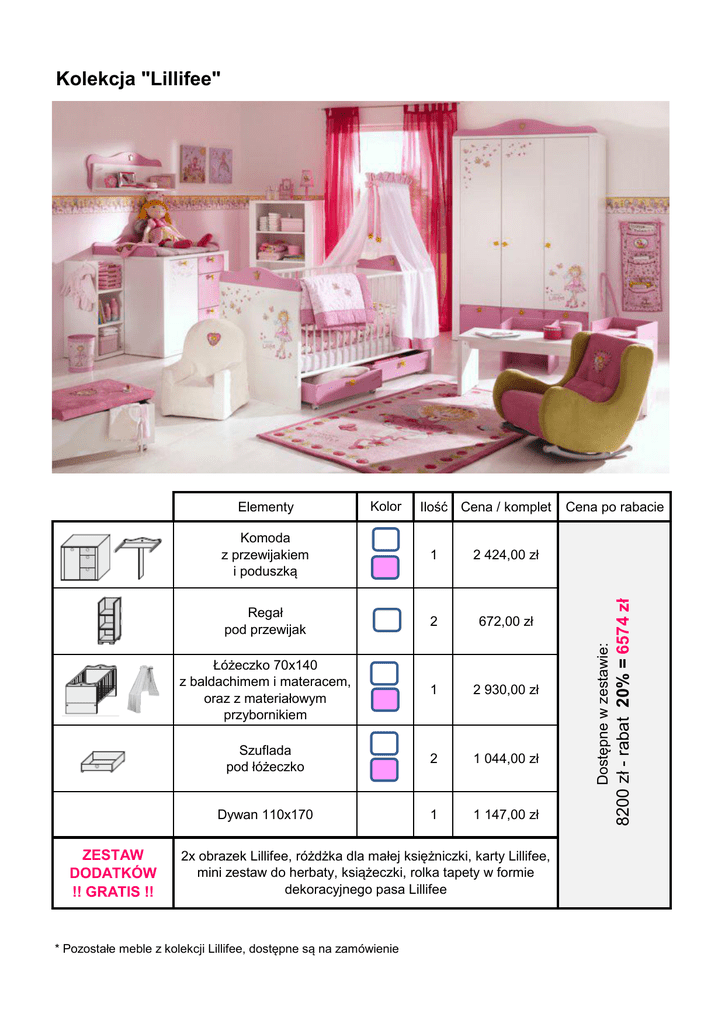 Kolekcja "Lillifee" ZESTAW DODATKÓW !! GRATIS !! Ilość Cena / komplet Komoda z przewijakiem i poduszką 1 2 424,00 zł Regał pod przewijak 2 672,00 zł Łóżeczko 70x140 z baldachimem i materacem, oraz z materiałowym przybornikiem 1 2 930,00 zł Szuflada pod łóżeczko 2 1 044,00 zł Dywan 110x170 1 1 147,00 zł 2x obrazek Lillifee, różdżka dla małej księżniczki, karty Lillifee, mini zestaw do herbaty, książeczki, rolka tapety w formie dekoracyjnego pasa Lillifee * Pozostałe meble z kolekcji Lillifee, dostępne są na zamówienie Cena po rabacie 8200 zł - rabat 20% = 6574 zł Kolor Dostępne w zestawie: Elementy