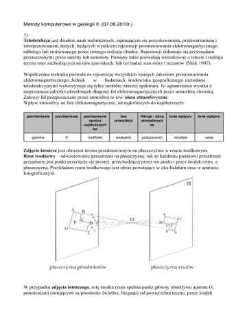Metody komputerowe w geologii II (07.06.2010r.) 1) Teledetekcja jest działem nauk technicznych, zajmującym się pozyskiwaniem, przetwarzaniem i interpretowaniem danych, będących wynikiem rejestracji promieniowania elektromagnetycznego odbitego lub emitowanego przez różnego rodzaju obiekty. Rejestracji dokonuje się przyrządami przenoszonymi przez satelity lub samoloty. Pomiary takie pozwalają wnioskować o istocie i rodzaju terenu oraz zachodzących na nim zjawiskach, lub też badać stan mórz i oceanów (Sitek 1997). Współczesna technika pozwala na rejestrację wszystkich znanych zakresów promieniowania elektromagnetycznego. Jednak w badaniach środowiska geograficznego metodami teledetekcyjnymi wykorzystuje się tylko niektóre zakresy spektrum. To ograniczenie wynika z nieprzepuszczalności określonych długości fal elektromagnetycznych przez atmosferę ziemską. Zakresy fal przepuszczane przez atmosferę to tzw. okna atmosferyczne. Wpływ atmosfery na fale elektromagnetyczne, od najkrótszych do najdłuższych: pochłanianie pochłanianie pochłanianie oprócz najdłuższych fal bez przeszkód filtruje - okna atmosferycz ne brak wpływu brak wpływu gamma X nadfiolet widzialne podczerwień mirofale radar Zdjęcie lotnicze jest obrazem terenu przedstawionym na płaszczyźnie w rzucie środkowym. Rzut środkowy – odwzorowanie przestrzeni na płaszczyznę, tak że każdemu punktowi przestrzeni przypisany jest punkt przecięcia się prostej, przechodzącej przez ten punkt i przez środek rzutu, z płaszczyzną. Przykładem rzutu środkowego jest obraz powstający w oku ludzkim oraz w aparacie fotograficznym. W przypadku zdjęcia lotniczego, rolę środka rzutu spełnia punkt główny obiektywu aparatu O, promieniami rzutującymi są promienie świetlne, biegnące od powierzchni terenu, przez środek rzutów O, do płaszczyzny zdjęcia. Płaszczyzna zdjęcia znajduje się w stałej odległości od środka rzutów O (głównego punktu obiektywu). Ortofotomapa – zdjęcie fotograficzne terenu pozbawione zniekształceń położenia punktów wywołanych deniwelacją. Powstaje w wyniku przetworzenia rzutu środkowego, w jakim wykonane zostały zdjęcia, na rzut ortogonalny, w którym wykonuje się mapy wielkoskalowe. Proces wykonania ortofotomapy to ortorektyfikacja. Zdjęcia lotnicze wykonuje się zwykle podczas tzw. nalotów fotogrametrycznych w zespołach po kilka lub kilkanaście szeregów równoległych o wzajemnym pokryciu poprzecznym i podłużnym. Pokrycie podłużne/poprzeczne zdjęcia – stosunek powierzchni dwukrotnie sfotografowanej do powierzchni pojedynczego zdjęcia [%]. Dzięki pokryciu poprzecznemu możliwa jest obserwacja stereoskopowa zdjęć. 2) Zobrazowania satelitarne Cechy elektronicznych systemów obrazowania satelitarnego: ●" dostarczają obraz drogą radiową w czasie rzeczywistym, tj. w momencie obrazowania; ma to zasadnicze znaczenie dla śledzenia z kosmosu procesów szybkozmiennych (np. pokrywy chmur dla meteorologii); ●" mogą dostarczać obrazy w zakresach spektralnych niedostępnych dla fotografii (podczerwień średnia, podczerwień termalna, mikrofale); ●" satelity umieszczone na orbitach bliskobiegunowych dostarczają obrazy praktycznie z powierzchni całego globu; ●" żywotność satelitów liczona jest w latach, a skanery umieszczone na ich pokładzie permanentnie dostarczają obrazy Ziemi, pokrywające obrazami co kilka-kilkanaście dni cały glob; Pozwala to monitorować dynamikę procesów zachodzących na powierzchni Ziemi. Rozdzielczość geometryczna (przestrzenna) – rzeczywista długość odcinka w terenie, odpowiadająca długości boku piksela obrazu: ●" skanery satelitów meteorologicznych: ~1000 m, ●" skanery satelitów środowiskowych: ~1-30 m, ●" satelity wysokorozdzielcze: < 1 m. Zdolność rozdzielcza obrazów w zakresie wielospektralnym jest gorsza niż w zakresie panchromatycznym. Piksele w zakresie wielospektralnym są zwykle 4 razy większe niż w zakresie panchromatycznym. Dzięki połączeniu obrazów multispektralnych z panchromatycznym otrzymujemy obraz barwny, "wyostrzony" (ang. pan-sharpened). Kolory tego obrazu są nieco zmienione, ale wielkość piksela odpowiada obrazowi panchromatycznemu. Rozdzielczość spektralna – ilość kanałów spektralnych rejestrowanego promieniowania elektromagnetycznego (np. R, G, B, NIR). Rozdzielczość radiometryczna – ilość poziomów, na które jest podzielony zakres promieniowania odbieranego przez czujnik (np. rozdzielczość 8 bit to 256 możliwych poziomów promieniowania). Teledetekcja satelitarna jest dziś głównym źródłem danych w naukach zajmujących się badaniami na skalę globalną, a więc przede wszystkim w meteorologii i fizyce atmosfery, w klimatologii i oceanografii, geologii planetarnej, geofizyce i kartografii. Dostarcza także wielu informacji z zakresu innych dyscyplin nauki (np. geografii, leśnictwa czy rolnictwa). Informacje pozyskane za pomocą satelitów znajdują coraz większe zastosowanie w gospodarce i ochronie środowiska. Obraz drzew liściastych i iglastych w podczerwieni Różnice w budowie wewnętrznej liści i igieł są przyczyną zróżnicowania obrazu fotograficznego drzewostanów liściastych i iglastych na zdjęciach wykonanych w podczerwieni. Zdrowe, zielone rośliny mają mniejsze współczynniki odbicia wzakresie promieniowania niebieskiego i czerwonego, większe zaś w zakresie promieniowania zielonego (ok. 550 nm). Jest to tłumaczone obecnością chlorofilu. Powyżej 680 nm (bliska podczerwień) następuje gwałtowny wzrost odbicia promieniowania. Chlorofil jest dla tego zakresu promieniowania całkowicie przeźroczysty, a wzrost odbicia jest spowodowany dużą ilością powietrza znajdującego się wprzestrzeniach międzykomórkowych tkanek liścia. Drzewa iglaste, oodmiennej budowie igieł, nie wykazują zwiększenia odbicia promieniowania podczerwonego. Na zdjęciach w podczerwieni bardzo dobrze widoczne