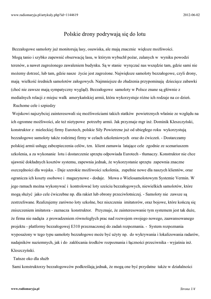 www.radiomaryja.pl/artykuly.php?id=1144619 2012-06-02 Polskie drony podrywają się do lotu Bezzałogowe samoloty już monitorują lasy, osuwiska, ale mają znacznie większe możliwości. Mogą tanio i szybko zapewnić obserwację lasu, w którym wybuchł pożar, zalanych w wyniku powodzi terenów, a nawet zagrożonego zawaleniem budynku. Są w stanie wyręczać nas wszędzie tam, gdzie sami nie możemy dotrzeć, lub tam, gdzie nasze życie jest zagrożone. Największe samoloty bezzałogowe, czyli drony, mają wielkość średnich samolotów załogowych. Najmniejsze do złudzenia przypominają dziecięce zabawki (choć nie zawsze mają sympatyczny wygląd). Bezzałogowe samoloty w Polsce znane są głównie z medialnych relacji z miejsc walk amerykańskiej armii, która wykorzystuje różne ich rodzaje na co dzień. Ruchome cele i szpiedzy Wojskowi najszybciej zainteresowali się możliwościami takich statków powietrznych właśnie ze względu na ich ogromne możliwości, ale też nietypowe potrzeby armii. Jak przyznaje mgr inż. Dominik Kleszczyński, konstruktor z mieleckiej firmy Eurotech, polskie Siły Powietrzne już od ubiegłego roku wykorzystują bezzałogowe samoloty także rodzimej firmy w celach szkoleniowych oraz do ćwiczeń. - Dostarczamy polskiej armii usługę zabezpieczenia celów, tzn. klient zamawia latające cele zgodnie ze scenariuszem szkolenia, a za wykonanie lotu i dostarczenie sprzętu odpowiada Eurotech - tłumaczy. Konstruktor nie chce ujawnić dokładnych kosztów systemu, zapewnia jednak, że wykorzystanie sprzętu zapewnia znaczne oszczędności dla wojska. - Daje szerokie możliwości szkolenia, zupełnie nowe dla naszych klientów, oraz ogranicza ich koszty osobowe i magazynowe - dodaje. Mowa o Wielosamolotowym Systemie Vermin. W jego ramach można wykonywać i kontrolować loty sześciu bezzałogowych, niewielkich samolotów, które mogą służyć jako cele ćwiczebne np. dla rakiet lub obrony przeciwlotniczej. - Samoloty nie zawsze są zestrzeliwane. Realizujemy zarówno loty szkolne, bez niszczenia imitatorów, oraz bojowe, które kończą się zniszczeniem imitatora - zaznacza konstruktor. Przyznaje, że zainteresowanie tym systemem jest tak duże, że firma nie nadąża z prowadzeniem równoległych prac nad rozwojem swojego nowego, zaawansowanego projektu - platformy bezzałogowej E310 przeznaczonej do zadań rozpoznania. - System rozpoznania wyposażony w tego typu samoloty bezzałogowe może być użyty np. do wykrywania i lokalizowania radarów, nadajników naziemnych, jak i do zakłócania środków rozpoznania i łączności przeciwnika - wyjaśnia inż. Kleszczyński. Tańsze oko dla służb Sami konstruktorzy bezzałogowców podkreślają jednak, że mogą one być przydatne także w działalności www.radiomaryja.pl Strona 1/4 innych służb, również ratowniczych. - To jest samolot bezpilotowy NEO. Ma wymienny zasobnik, który może zawierać bądź głowicę obserwacyjną, bądź aparat fotograficzny do zadań fotometrycznych, ale może też przenosić inne, mniejsze bezpilotowce. Wówczas wynosi je nad badany rejon, wypuszcza w celu wykonania misji, a sam przekazuje na ziemię zbierane przezeń dane - tłumaczy dr inż. Marcin Szender, dyrektor firmy MSP z Drogomyśla k. Cieszyna, wskazując na płatowiec z długimi skrzydłami. Do czego może się przydać? Szender jednym tchem wymienia zastosowania bezzałogowca - wykorzystanie przez straż pożarną lub inne służby ratunkowe np. do obserwacji terenów objętych pożarami, w tym leśnych, czy zalanych w wyniku powodzi. Podkreśla, że takie samoloty, wyposażone w kamery termowizyjne, o wiele szybciej i skuteczniej niż nawet najlepsi ratownicy mogłyby poszukiwać nocą zaginionych ludzi. Z kolei wyposażone w odpowiednie kamery i aparaty fotograficzne mogłyby posłużyć do monitorowania przez firmy energetyczne stanu rurociągów lub napowietrznych linii energetycznych, zwłaszcza w okresach zimowych opadów śniegu, pod ciężarem którego często łamią się gałęzie drzew i uszkadzają przewody elektryczne. Myślę, że takie bezzałogowce byłyby przydatne także w pracy Straży Granicznej czy straży pożarnej, ale też policji - zaznacza. Opisując wykorzystanie takich statków dla tej służby, Szender wskazuje na inny model zaprezentowany przez jego firmę - pomniejszoną wersję załogowego samolotu patrolowego Osa, konstruowanego właśnie dla policji. Przygotowuje go konsorcjum z udziałem Wojskowej Akademii Technicznej, Wojskowych Zakładów Technicznych nr 2 w Bydgoszczy i firmy AMT. MSP jest jednym z konsorcjantów. - Odpowiadamy za część płatowca i próby aerodynamiczne. Na takim pomniejszonym modelu badamy jego charakterystyki lotne, tzn. zanim powstanie prototyp załogowy, na takim modelu sprawdzamy, jak wersja załogowa będzie latać. Dzięki temu jesteśmy w stanie wcześniej i taniej wskazać ewentualne usterki konstrukcyjne - wyjaśnia. Mapowanie z góry Bezzałogowcami zainteresowane są również inne polskie służby, m.in. Lasy Państwowe. Wieńczysław Plutecki, dyrektor Wydziału Systemów Informacji Przestrzennej w firmie Taxus SI, przyznaje, że firma wykonywała już na obszarach leśnych zdjęcia i ortofotomapy różnych powierzchni - pohuraganowych i po tzw. okiści, czyli na terenach, na których powstały szkody z powodu nagłych i obfitych opadów śniegu, łamiącego gałęzie i korony drzew. Taxus na wystawie prezentował bezzałogowy system fotogrametryczny do robienia ortofotomap. Choć firma sama nie wykonuje bezzałogowców, to jednak korzysta z usług producentów takich statków, w tym wypadku MSP. - Zainteresowanie naszymi usługami jest duże. Możemy zapewnić obserwacje małych obszarów stosunkowo szybko i w sposób powtarzalny, co pozwala na okresowy monitoring pewnych terenów. Dla takich powierzchni jesteśmy alternatywą dla systemów opartych o samoloty załogowe, które z racji wysokich kosztów nie znajdowały w tyc