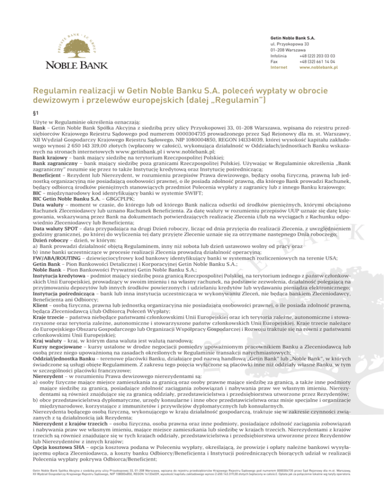 Getin Noble Bank S.A. ul. Przyokopowa 33 01-208 Warszawa Infolinia +48 (22) 203 03 03 Fax +48 (32) 661 14 04 Internetwww.noblebank.pl Regulamin realizacji w Getin Noble Banku S.A. poleceń wypłaty w obrocie dewizowym i przelewów europejskich (dalej „Regulamin”) §1 Użyte w Regulaminie określenia oznaczają: Bank – Getin Noble Bank Spółka Akcyjna z siedzibą przy ulicy Przyokopowej 33, 01–208 Warszawa, wpisana do rejestru przedsiębiorców Krajowego Rejestru Sądowego pod numerem 0000304735 prowadzonego przez Sąd Rejonowy dla m. st. Warszawy, XII Wydział Gospodarczy Krajowego Rejestru Sądowego, NIP 1080004850, REGON 141334039, której wysokość kapitału zakładowego wynosi 2 650 143 319,00 złotych (wpłacony w całości), wykonująca działalność w Oddziałach/jednostkach Banku wskazanych na stronach internetowych www.getinbank.pl i www.noblebank.pl; Bank krajowy – bank mający siedzibę na terytorium Rzeczpospolitej Polskiej; Bank zagraniczny – bank mający siedzibę poza granicami Rzeczpospolitej Polskiej. Używając w Regulaminie określenia „Bank zagraniczny” rozumie się przez to także Instytucję kredytową oraz Instytucję pośredniczącą; Beneficjent – Rezydent lub Nierezydent, w rozumieniu przepisów Prawa dewizowego, będący osobą fizyczną, prawną lub jednostką organizacyjną nie posiadającą osobowości prawnej, o ile posiada zdolność prawną, dla którego Bank prowadzi Rachunek, będący odbiorcą środków pieniężnych stanowiących przedmiot Polecenia wypłaty z zagranicy lub z innego Banku krajowego; BIC – międzynarodowy kod identyfikujący banki w systemie SWIFT; BIC Getin Noble Banku S.A. – GBGCPLPK; Data waluty – moment w czasie, do którego lub od którego Bank nalicza odsetki od środków pieniężnych, którymi obciążono Rachunek Zleceniodawcy lub uznano Rachunek Beneficjenta. Za datę waluty w rozumieniu przepisów UUP uznaje się datę księgowania, wskazywaną przez Bank na dokumentach potwierdzających realizację Zlecenia i/lub na wyciągach z Rachunku odpowiednio Zleceniodawcy lub Beneficjenta; Data waluty SPOT – data przypadająca na drugi Dzień roboczy, licząc od dnia przyjęcia do realizacji Zlecenia, z uwzględnieniem godziny granicznej, po której do wyliczenia tej daty przyjęte Zlecenie uznaje się za otrzymane następnego Dnia roboczego; Dzień roboczy – dzień, w którym: a) Bank prowadzi działalność objętą Regulaminem, inny niż sobota lub dzień ustawowo wolny od pracy oraz b)inne banki uczestniczące w procesie realizacji Zlecenia prowadzą działalność operacyjną; FW/ABA/ROUTING – dziewięciocyfrowy kod bankowy identyfikujący banki w systemach rozliczeniowych na terenie USA; Getin Bank – Pion Bankowości Detalicznej i Korporacyjnej Getin Noble Banku S.A.; Noble Bank – Pion Bankowości Prywatnej Getin Noble Banku S.A.; Instytucja kredytowa – podmiot mający siedzibę poza granicą Rzeczpospolitej Polskiej, na terytorium jednego z państw członkowskich Unii Europejskiej, prowadzący w swoim imieniu i na własny rachunek, na podstawie zezwolenia, działalność polegającą na przyjmowaniu depozytów lub innych środków powierzonych i udzielaniu kredytów lub wydawaniu pieniądza elektronicznego; Instytucja pośrednicząca – bank lub inna instytucja uczestnicząca w wykonywaniu Zleceń, nie będąca bankiem Zleceniodawcy, Beneficjenta ani Odbiorcy; Klient – osobą fizyczna, prawna lub jednostką organizacyjna nie posiadająca osobowości prawnej, o ile posiada zdolność prawną, będąca Zleceniodawcą i/lub Odbiorcą Poleceń Wypłaty; Kraje trzecie – państwa niebędące państwami członkowskimi Unii Europejskiej oraz ich terytoria zależne, autonomiczne i stowarzyszone oraz terytoria zależne, autonomiczne i stowarzyszone państw członkowskich Unii Europejskiej. Kraje trzecie należące do Europejskiego Obszaru Gospodarczego lub Organizacji Współpracy Gospodarczej i Rozwoju traktuje się na równi z państwami członkowskimi Unii Europejskiej; Kraj waluty – kraj, w którym dana waluta jest walutą narodową; Kursy negocjowane – kursy ustalone w drodze negocjacji pomiędzy upoważnionym pracownikiem Banku a Zleceniodawcą lub osobą przez niego upoważnioną na zasadach określonych w Regulaminie transakcji natychmiastowych; Oddział/jednostka Banku – terenowe placówki Banku, działające pod nazwą handlową „Getin Bank” lub „Noble Bank”, w których świadczone są usługi objęte Regulaminem. Z zakresu tego pojęcia wyłączone są placówki inne niż oddziały własne Banku, w tym w szczególności placówki franczyzowe; Nierezydent – w rozumieniu Prawa dewizowego nierezydentami są: a) osoby fizyczne mające miejsce zamieszkania za granicą oraz osoby prawne mające siedzibę za granicą, a także inne podmioty mające siedzibę za granicą, posiadające zdolność zaciągania zobowiązań i nabywania praw we własnym imieniu. Nierezydentami są również znajdujące się za granicą oddziały, przedstawicielstwa i przedsiębiorstwa utworzone przez Rezydentów; b)obce przedstawicielstwa dyplomatyczne, urzędy konsularne i inne obce przedstawicielstwa oraz misje specjalne i organizacje międzynarodowe, korzystające z immunitetów i przywilejów dyplomatycznych lub konsularnych. Nierezydenta będącego osobą fizyczną, wykonującego w kraju działalność gospodarczą, traktuje się w zakresie czynności związanych z tą działalnością jak Rezydenta; Nierezydent z krajów trzecich – osoba fizyczna, osoba prawna oraz inne podmioty, posiadające zdolność zaciągania zobowiązań i nabywania praw we własnym imieniu, mające miejsce zamieszkania lub siedzibę w krajach trzecich. Nierezydentami z krajów trzecich są również znajdujące się w tych krajach oddziały, przedstawicielstwa i przedsiębiorstwa utworzone przez Rezydentów lub Nierezydentów z innych krajów; Opcja kosztowa SHA – opcja kosztowa podana w Poleceniu wypłaty, okr