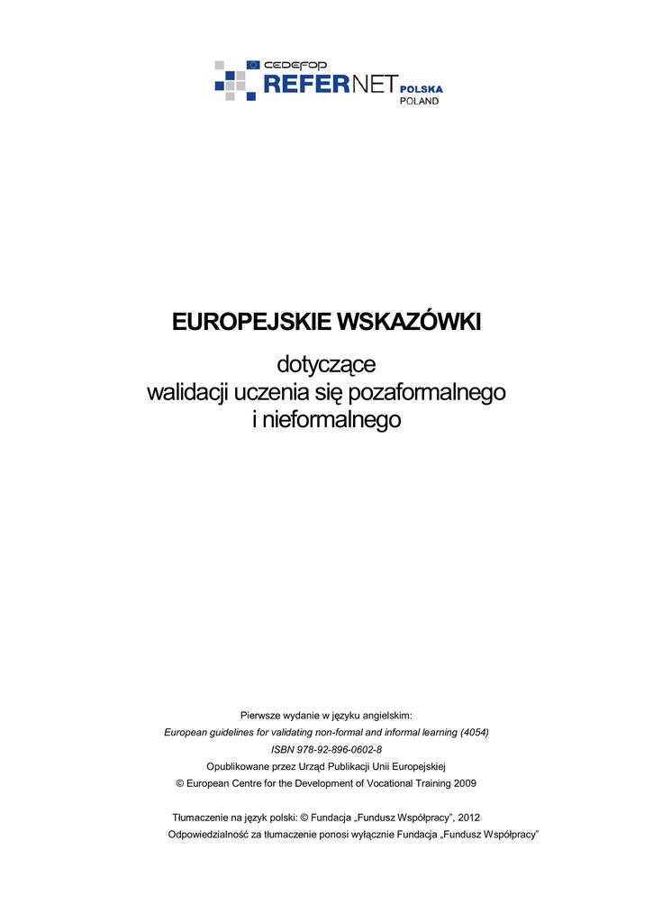 EUROPEJSKIE WSKAZÓWKI dotyczące walidacji uczenia się pozaformalnego i nieformalnego Pierwsze wydanie w języku angielskim: European guidelines for validating non-formal and informal learning (4054) ISBN 978-92-896-0602-8 Opublikowane przez Urząd Publikacji Unii Europejskiej © European Centre for the Development of Vocational Training 2009 Tłumaczenie na język polski: © Fundacja „Fundusz Współpracy”, 2012 Odpowiedzialność za tłumaczenie ponosi wyłącznie Fundacja „Fundusz Współpracy” Podziękowania Niniejsza publikacja powstała dzięki współpracy osób z wielu krajów i różnych instytucji: Członków klastra zajmującego się uznawaniem efektów uczenia się, którzy poprzez aktywne i konstruktywne dyskusje, określili główne kwestie jakie należy uwzględnić w niniejszej publikacji i jak na nie reagować (patrz załącznik 3 zawierający przegląd uczestniczących krajów); uczestników działań peer learning w Belgii (styczeń 2007), Francji (Lipiec 2007) i Islandii (luty 2009), którzy przyczynili się do wyjaśnienia problemów i podzielili się swoimi spostrzeżeniami; Komisji Europejskiej, Dyrekcji Generalnej ds. Edukacji i Kultury i Cedefop za zapewnienie niezbędnego wsparcia finansowego, organizacyjnego oraz analitycznego do pracy w klastrze i PLAs; Cedefop, Jens Bjørnåvold i QCA, Mike Coles, którzy przygotowali tekst; GHK, Daniela Ulicna, która wniosła istotny wkład w ustrukturyzowane tekstu oraz listy sprawdzającej dla decydentów i praktyków; Christine Nychas Cedefop – odpowiedzialnej za techniczne przygotowanie niniejszego tekstu. 2 Przedmowa Niniejsza publikacja przedstawia wnioski z ponad dwuletniej, intensywnej wymiany doświadczeń – z udziałem przedstawicieli ponad 20 krajów europejskich – w zakresie walidacji uczenia się pozaformalnego i nieformalnego. Głównym jej celem jest udostępnienie efektów tego procesu wspólnego uczenia się szerszym kręgom odbiorców i wspieranie w ten sposób dalszego rozwoju walidacji uczenia się pozaformalnego i nieformalnego na poziomie europejskim, krajowym i lokalnym. Niniejsze wskazówki – choć zostały zainspirowane europejskimi zasadami identyfikacji i walidacji uczenia się pozaformalnego i nieformalnego, które Rada Europejska przyjęła w 2004 r. – nie wyznaczają ram polityki zatwierdzonych przez organ ustawodawczy: stanowią one praktyczne narzędzie oferujące fachowe porady, które mogą być stosowane jedynie na czysto dobrowolnej zasadzie. Ich oddziaływanie zależy wyłącznie od tego, czy okażą się adekwatne i będą stanowić wartość dodaną na poziomie krajowym i lokalnym. Wskazówki są adresowane do szerokiego grona decydentów i praktyków zajmujących się opracowywaniem i wdrażaniem rozwiązań w zakresie walidacji na różnych poziomach. Należy zauważyć, że walidacja nie jest jedynie przedmiotem zainteresowania placówek edukacyjnych i szkoleniowych; dotyczy ona także przedsiębiorstw, sektorów gospodarki, organizacji pozarządowych itp. W tekście starano się uwzględnić istnienie bardzo różnych interesariuszy, szczególnie w „liście pytań kontrolnych” dla praktyków, oferując zaangażowanym instytucjom i osobom praktyczne narzędzie do oceny postępów. Niniejsze wskazówki są w dużej mierze efektem międzynarodowej współpracy i wspólnego uczenia się w ramach tzw. klastra ds. uznawania efektów uczenia się, utworzonego w 2006 r. w kontekście programu pracy „Edukacja i szkolenia 2010”. W klastrze tym – wspieranym finansowo, organizacyjnie i na płaszczyźnie analitycznej przez Komisję Europejską i Cedefop – znaleźli się przedstawiciele krajów szczególnie zainteresowanych problematyką walidacji. O znaczeniu tej problematyki świadczy to, że liczba uczestniczących krajów wzrosła z 21 w 2006 r. do 26 w 2009 r. Prace klastra nad walidacją ilustrują potencjał wymiany polegającej na wzajemnym uczeniu się od siebie uczestników (ang. peer learning). Trzy spotkania typu peer learning poświęcone walidacji, które zostały zorganizowane przez klaster od 2006 r. (w Belgii, Francji i Islandii), umożliwiły zidentyfikowanie najważniejszych problemów i omówienie ewentualnych rozwiązań z udziałem ekspertów i decydentów. Najważniejsze jest to, że publikacja niniejszych wskazówek świadczy o tym, iż walidację uczenia się pozaformalnego i nieformalnego postrzega się coraz częściej jako sposób ulepszania uczenia się przez całe życie i uczenia się w różnych miejscach i formach. Szybko wzrasta liczba krajów, w których podkreśla się, jak istotne znaczenie ma uwidacznianie i docenianie uczenia się odbywającego się poza placówkami prowadzącymi kształcenie i szkolenie formalne, w pracy, w domu i w ramach zajęć w czasie wolnym. Niniejszy tekst należy traktować jako pierwszy wkład w zbiór europejskich wskazówek w zakresie walidacji. W nadchodzących latach konieczne są oczywiście dalsze prace nad jego rozszerzeniem i pogłębieniem, które powinny być prowadzone poprzez kontynuowanie współpracy i wspólnego uczenia się, jakie wspomniany wyżej klaster umożliwia od 2006 r. 3 Europejskie wskazówki w zakresie walidacji uczenia się pozaformalnego i nieformalnego odzwierciedlają konstruktywną współpracę pomiędzy Dyrekcją Generalną ds. Edukacji i Kultury Komisji Europejskiej a Cedefop w zakresie koordynacji prac klastra i zajęć typu peer learning w tej dziedzinie. Tę współpracę chcemy dalej rozwijać i wzmacniać w nadchodzących latach. Aviana Bulgarelli Gordon Clark Dyrektor Cedefop Kierownik Wydziału Uczenie się przez całe życie: wkład w Proces Lizboński Dyrekcja Generalna ds. Edukacji i Kultury Komisja Europejska 4 Spis treści Podziękowania ........................................................................................................................2 Przedmowa .......................................................................................