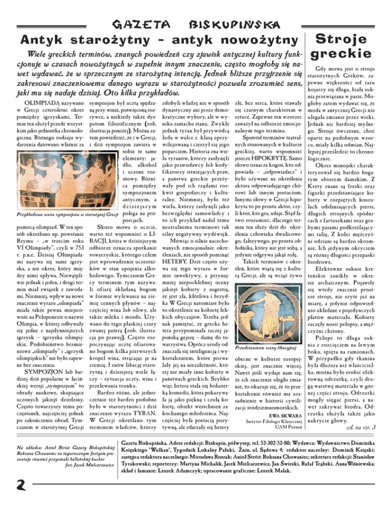Antyk starożytny – antyk nowożytny Wiele greckich terminów, znanych powiedzeń czy zjawisk antycznej kultury funkcjonuje w czasach nowożytnych w zupełnie innym znaczeniu, często mogłoby się nawet wydawać, że w sprzecznym ze starożytną intencją. Jednak bliższe przyjrzenie się zakresowi znaczeniowemu danego wyrazu w starożytności pozwala zrozumieć sens, jaki mu się nadaje dzisiaj. Oto kilka przykładów. OLIMPIADĄ nazywano w Grecji czteroletni okres pomiędzy igrzyskami. Termin ten służył przede wszystkim jako jednostka chronologiczna. Różnego rodzaju wydarzenia datowano właśnie za sympozjon był ucztą spędzaną przy winie, poświęconą rozrywce, a niekiedy także dysputom filozoficznym (zob. ilustracja poniżej). Można zatem powiedzieć, że i w Grecji, i dziś sympozjon zawiera w sobie te same elementy: jadło, alkohol i uczone rozmowy. Różnica pomiędzy sympozjonem antycznym, a dzisiejszym Przykładowa scena sympozjonu w starożynej Grecji polega na proporcjach. pomocą olimpiad. W ten spoSkoro mowa o uczcie, sób określono np. powstanie warto też wspomnieć o LIRzymu – „w trzecim roku BACJI, która w dzisiejszym VI Olimpiady”, czyli w 753 odbiorze oznacza spotkanie r. p.n.e. Dzisiaj Olimpiada- towarzyskie, którego celem mi nazywa się same igrzy- jest wprowadzenie uczestniska, a nie okres, który mię- ków w stan upojenia alkodzy nimi upływa. Niewątpli- holowego. Tymczasem Grewie jednak i jeden, i drugi ter- cy terminem tym nazywamin miał związek z zawoda- li ofiarę składaną bogom mi. Niemniej, wpływ na nowe w formie wylewania na zieznaczenie wyrazu „olimpiada” mię cennych płynów – najmiała także pewna miejsco- częściej wina lub oliwy, ale wość na Peloponezie o nazwie także mleka i miodu. UżyOlimpia, w której odbywały wano do tego płaskiej czary się jedne z najsłynniejszych zwanej paterą (zob. ilustraigrzysk – igrzyska olimpij- cja po prawej). Często rozskie. Podobieństwo brzmie- poczynając ucztę ofiarowaniowe „olimpiady” i „igrzysk no bogom kilka pierwszych olimpijskich” nie było zapew- kropel wina, strącając je na ne bez znaczenia. ziemię. I znów libację staroSYMPOZJON lub bar- żytną i dzisiejszą wiele łądziej dziś popularne w łaciń- czy – sytuacja uczty, wina i skiej wersji „sympozjum” to przelewania trunku. obrady naukowe, skupiające Bardzo różne, ale jednouczonych jakiejś dziedziny. cześnie też bardzo podobne Często towarzyszy temu po- było w starożytności i dziś częstunek, najczęściej jednak znaczenie wyrazu TYRAN. po zakończeniu obrad. Tym- W Grecji określano tym czasem w starożytnej Grecji terminem władców, którzy Na okładce: Anioł Stróż Gazety Biskupińskiej Roksana Chowaniec na tegorocznym festynie prezentuje również przysmaki helleńskiej kuchni fot. Jacek Mielcarzewicz zdobyli władzę nie w sposób dynastyczny ani przez demokratyczne wybory, ale w wyniku zamachu stanu. Zwykle jednak tyran był przywódcą ludu w walce z klasą uprzywilejowaną i cieszył się jego poparciem. Historia zna wielu tyranów, którzy zasłynęli jako prawodawcy lub kodyfikatorzy istniejących praw, a państwa greckie przeżywały pod ich rządami rozkwit gospodarczy i kulturalny. Niemniej, było też wielu, którzy zasłynęli jako bezwzględni samowładcy i to ich przykład nadał temu neutralnemu terminowi tak silny negatywny wydźwięk. Mówiąc o silnie nacechowanych emocjonalnie określeniach, nie sposób pominąć HETERY. Dziś często używa się tego wyrazu w formie inwektywy, a przynajmniej niepochlebnej oceny jakiejś kobiety z sugestią, że jest zła, kłótliwa i brzydka W Grecji natomiast było to określenie na kobietę lekkich obyczajów. Trzeba jednak pamiętać, że grecka hetera przypominała raczej japońską gejszę – damę do towarzystwa. Oprócz urody odznaczała się inteligencją i wykształceniem, które pozwalały jej na niezależność, której nie miały inne kobiety w państwach greckich. Szybko więc hetera stała się bohaterką komedii, która pokazywała ją jako piękną i czułą kobietę, obiekt westchnień zakochanego młodzieńca. Najczęściej była postacią pozytywną, ale zdarzały się hetery złe, bez serca, które stawały się czarnym charakterem w sztuce. Zapewne ten wzorzec zaważył na odbiorze emocjonalnym tego terminu. Spośród terminów teatralnych stosowanych w kulturze greckiej, warto wspomnieć jeszcze HIPOKRYTĘ. Samo słowo oznacza kogoś, kto odpowiada – „odpowiadacz” i było używane na określenia aktora odpowiadającego chórowi lub innym postaciom. Innymi słowy w Grecji hipokryta to po prostu aktor, czyli ktoś, kto gra, udaje. Stąd łatwo zrozumieć, dlaczego termin ten służy dziś do określenia człowieka dwulicowego, fałszywego, po prostu obłudnika, który nie jest sobą, a jedynie odgrywa jakąś rolę. Takich terminów i określeń, które wiążą się z kulturą Grecji, ale są wciąż żywo Przedstawienie sceny libacyjnej obecne w kulturze europejskiej, jest znacznie więcej. Nawet jeśli wydaje nam się, że ich znaczenie uległo zmianie, to okazuje się, że to przekształcenie również ma uzasadnienie w historii cywilizacji śródziemnomorskich. EWA SKWARA Instytut Filologii Klasycznej UAM Poznań Stroje greckie Gdy mowa jest o stroju starożytnych Greków, zapewne większości od razu kojarzy się długa, biała suknia przewiązana w pasie. Mogłoby zatem wydawać się, że moda w antycznej Grecji nie ulegała zmianie przez wieki. Jednak nic bardziej mylnego. Stroje ówczesne, choć oparte na podobnym wzorcu, miały kilka odmian. Najlepiej prześledzić to chronologicznie. Okres minojski charakteryzował się bardzo bogatym ubiorem damskim. Z Krety znane są freski oraz figurki przedstawiające kobiety w rozpiętych koszulach odsłaniających piersi, długich strojnych spódnicach z fartuszkami oraz grubymi pasami podkreślającymi talię. Z kolei mężczyźni odziani są