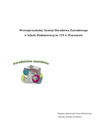Wewnątrzszkolny System Doradztwa Zawodowego w Szkole Podstawowej nr 119 w Warszawie Program opracowała Iwona Wiśniewska Szkolny doradca zawodowy Podstawa prawna: Ustawa z dnia 7 września 1991 o systemie oświaty Rozporządzenie ministra Edukacji Narodowej z dnia 30 kwietnia 2013 r. w sprawie zasad udzielania i organizacji pomocy psychologiczno-pedagogicznej w publicznych przedszkolach, szkołach i placówkach. Ogólne założenia wewnątrzszkolnego systemu doradztwa zawodowego System doradztwa zawodowego obejmuje ogół działań podejmowanych przez szkołę w celu przygotowania uczniów do wyboru zawodu, poziomu i kierunku kształcenia. Pomaga uczniom w samopoznaniu własnych predyspozycji zawodowych (osobowości, potrzeb, uzdolnień, zainteresowań, możliwości). Obejmuje całokształt zadań związanych z udzielaniem uczniom pomocy w planowaniu przyszłej kariery zawodowej. Wewnątrzszkolny System Doradztwa Zawodowego zakłada, że: wybór zawodu jest procesem rozwojowym i stanowiącym sekwencję decyzji podejmowanych na przestrzeni wielu lat życia; na wybór zawodu składają się: wiedza na temat siebie, wiedza na temat zawodów, ścieżek edukacyjnych i rynku pracy; na wybór zawodu wpływają głównie cechy osobowościowe jednostki (temperament, charakter, poziom inteligencji, zainteresowania, zdolności), umiejętności, doświadczenia, wyznawane wartości i normy, czynniki emocjonalne, zdrowotne, rodzaj i poziom wykształcenia, wpływ rodziny , aktywność własna jednostki; preferencje zawodowe wywodzą się z doświadczeń dzieciństwa i rozwijają się w toku życia człowieka; działania w ramach WSDZ muszą być systematyczne, zaplanowane i realizowane wg harmonogramu pracy szkoły; WSDZ obejmuje indywidualną i grupową pracę z uczniami, rodzicami i nauczycielami (Radą Pedagogiczną); WSDZ ma charakter planowych działań ogółu nauczycieli i koordynowany jest przez szkolnego doradcę zawodowego, dzięki czemu wszelkie działania szkoły mają spójny charakter. Cele ogólne i zadania wewnątrzszkolnego systemu doradztwa zawodowego Pomaganie uczniom w określeniu ich predyspozycji zawodowych Udzielanie uczniom indywidualnych porad zawodowych na podstawie zebranych informacji Rozwijanie aktywności poznawczej uczniów w kierunku właściwej samooceny swoich możliwości Prowadzenie zajęć grupowych mających na celu lepsze samopoznanie, kształtowanie aktywnych postaw Stała współpraca z poradnią psychologiczno0pedagogiczną Pomoc nauczycielom w realizacji w ramach lekcji przedmiotowych tematów związanych z wyborem zawodu Cele szczegółowe Uczniowie : rozwijają umiejętności pracy zespołowej oraz kształtowania właściwych relacji społecznych; wiedzą jak się uczyć i rozwijać swoje zainteresowania, pasje i talenty; posiadają informacje o zawodach z najbliższego otoczenia; ; Nauczyciele: potrafią diagnozować potrzeby i zasoby uczniów; rozwijają talenty, zainteresowania, zdolności, predyspozycje; wspierają rodziców w procesie doradczym, udzielają informacji, lub kierują do specjalistów; znają ścieżki edukacyjne, ofertę szkół, zasady rekrutacji; Rodzice: znają swoje dziecko; są zaangażowani i przygotowani do pełnienia roli „doradców”; znają czynniki ważne przy wyborze szkoły i zawodu; znają ścieżki edukacyjne, ofertę szkół, zasady rekrutacji; wiedzą gdzie szukać pomocy dla swoich dzieci w sytuacjach trudnych; angażują się w pracę doradczą szkoły (np. prezentują swoje zawody, zakłady pracy). Formy realizacji programu doradztwa zawodowego Zajęcia grupowe -lekcje wychowawcze i przedmiotowe. Indywidualne porady. Badania diagnostyczne- kwestionariusze, ankiety, testy, Badanie zapotrzebowania na działania doradcze prowadzone w szkole. Metody realizacji programu doradztwa zawodowego Zajęcia warsztatowe o Grupowe- służące rozbudzeniu świadomości konieczności planowania własnego rozwoju i kariery zawodowej, umożliwiające poznanie siebie i swoich predyspozycji zawodowych. o Warsztaty doskonalące umiejętności w zakresie komunikacji interpersonalnej i współdziałania w grupie, radzenie sobie ze stresem. Mini wykłady, konsultacje, pogadanki Spotkania z przedstawicielami zawodów Spotkania dla rodziców Udział w targach konkursach Udostępnianie informacji o zawodach, szkołach Prowadzenie kółek zainteresowań dla uczniów Organizowanie wycieczek Podstawowe pojęcia z zakresu orientacji i poradnictwa zawodowego Poradnictwo zawodowe - Długofalowe i wieloetapowe działania wychowawcze, towarzyszące jednostce w trakcie jej rozwoju zawodowego. Obejmuje ono udzielanie pomocy uczniom i dorosłym w planowaniu, tworzeniu i rozwoju kariery zawodowej, przynoszącej jednostce satysfakcję i zawodowy sukces. (Ogólne zasady funkcjonowania poradnictwa zawodowego w systemie urzędów pracy). Orientacja zawodowa - Działania wychowawcze szkoły, rodziców, i innych osób, grup i instytucji - mające na celu przygotowanie młodzieży do planowania kariery zawodowej, których ważnym elementem jest podejmowanie kolejnych decyzji wyboru zawodu i szkoły. (K. Lelińska) Doradztwo zawodowe - Świadczenie pomocy w dokonywaniu kolejnych decyzji wyboru zawodu lub pracy w formie indywidualnej porady zawodowej, poprzez analizę pola problemowego jednostki i udzielenie jej informacji zawodowych, podawanie wskazówek, sugestii oraz instrukcji. (K. Lelińska) Doradca zawodowy - Osoba udzielająca pomocy, w formie grupowych i indywidualnych porad zawodowych, młodzieży i osobom dorosłym w wyborze zawodu, kierunku kształcenia i szkolenia, uwzględniając ich możliwości psychofizyczne i sytuację życiową a także potrzeby rynku pracy oraz możliwości systemu edukacyjnego, współpracując z rodzicami i nauczycielami w procesie orientacji zawodowej uczniów oraz wykorzystując w tym celu wiedzę o zawodach, znajomość psychologicznych i pedagogicznych technik, diagnozę rynku pracy oraz techniczne środki przekazywania i