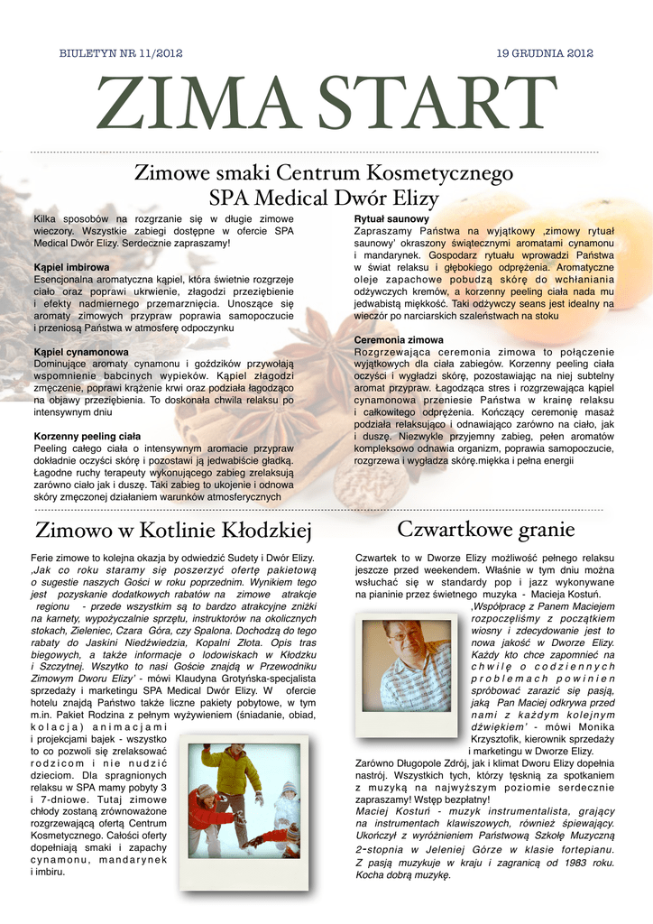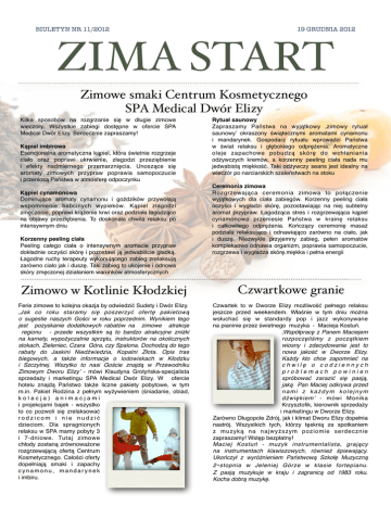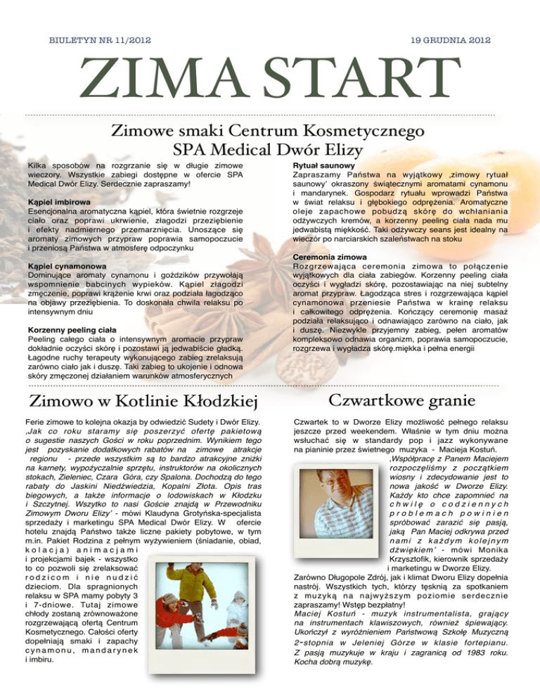 BIULETYN NR 11/2012 19 GRUDNIA 2012 ZIMA START Zimowe smaki Centrum Kosmetycznego SPA Medical Dwór Elizy Kilka sposobów na rozgrzanie się w długie zimowe wieczory. Wszystkie zabiegi dostępne w ofercie SPA Medical Dwór Elizy. Serdecznie zapraszamy! Kąpiel imbirowa Esencjonalna aromatyczna kąpiel, która świetnie rozgrzeje ciało oraz poprawi ukrwienie, złagodzi przeziębienie i efekty nadmiernego przemarznięcia. Unoszące się aromaty zimowych przypraw poprawia samopoczucie i przeniosą Państwa w atmosferę odpoczynku Kąpiel cynamonowa Dominujące aromaty cynamonu i goździków przywołają wspomnienie babcinych wypieków. Kąpiel złagodzi zmęczenie, poprawi krążenie krwi oraz podziała łagodząco na objawy przeziębienia. To doskonała chwila relaksu po intensywnym dniu Korzenny peeling ciała Peeling całego ciała o intensywnym aromacie przypraw dokładnie oczyści skórę i pozostawi ją jedwabiście gładką. Łagodne ruchy terapeuty wykonującego zabieg zrelaksują zarówno ciało jak i duszę. Taki zabieg to ukojenie i odnowa skóry zmęczonej działaniem warunków atmosferycznych Rytuał saunowy Zapraszamy Państwa na wyjątkowy ‚zimowy rytuał saunowy’ okraszony świątecznymi aromatami cynamonu i mandarynek. Gospodarz rytuału wprowadzi Państwa w świat relaksu i głębokiego odprężenia. Aromatyczne oleje zapachowe pobudzą skórę do wchłaniania odżywczych kremów, a korzenny peeling ciała nada mu jedwabistą miękkość. Taki odżywczy seans jest idealny na wieczór po narciarskich szaleństwach na stoku Ceremonia zimowa Rozgrzewająca ceremonia zimowa to połączenie wyjątkowych dla ciała zabiegów. Korzenny peeling ciała oczyści i wygładzi skórę, pozostawiając na niej subtelny aromat przypraw. Łagodząca stres i rozgrzewająca kąpiel cynamonowa przeniesie Państwa w krainę relaksu i całkowitego odprężenia. Kończący ceremonię masaż podziała relaksująco i odnawiająco zarówno na ciało, jak i duszę. Niezwykle przyjemny zabieg, pełen aromatów kompleksowo odnawia organizm, poprawia samopoczucie, rozgrzewa i wygładza skórę.miękka i pełna energii Zimowo w Kotlinie Kłodzkiej Czwartkowe granie Ferie zimowe to kolejna okazja by odwiedzić Sudety i Dwór Elizy. ‚Jak co roku staramy się poszerzyć ofertę pakietową o sugestie naszych Gości w roku poprzednim. Wynikiem tego jest pozyskanie dodatkowych rabatów na zimowe atrakcje regionu - przede wszystkim są to bardzo atrakcyjne zniżki na karnety, wypożyczalnie sprzętu, instruktorów na okolicznych stokach, Zieleniec, Czara Góra, czy Spalona. Dochodzą do tego rabaty do Jaskini Niedźwiedzia, Kopalni Złota. Opis tras biegowych, a także informacje o lodowiskach w Kłodzku i Szczytnej. Wszytko to nasi Goście znajdą w Przewodniku Zimowym Dworu Elizy’ - mówi Klaudyna Grotyńska-specjalista sprzedaży i marketingu SPA Medical Dwór Elizy. W ofercie hotelu znajdą Państwo także liczne pakiety pobytowe, w tym m.in. Pakiet Rodzina z pełnym wyżywieniem (śniadanie, obiad, kolacja) animacjami i projekcjami bajek - wszystko to co pozwoli się zrelaksować rodzicom i nie nudzić dzieciom. Dla spragnionych relaksu w SPA mamy pobyty 3 i 7-dniowe. Tutaj zimowe chłody zostaną zrównoważone rozgrzewającą ofertą Centrum Kosmetycznego. Całości oferty dopełniają smaki i zapachy cynamonu, mandarynek i imbiru. Czwartek to w Dworze Elizy możliwość pełnego relaksu jeszcze przed weekendem. Właśnie w tym dniu można wsłuchać się w standardy pop i jazz wykonywane na pianinie przez świetnego muzyka - Macieja Kostuń. ‚Współpracę z Panem Maciejem rozpoczęliśmy z początkiem wiosny i zdecydowanie jest to nowa jakość w Dworze Elizy. Każdy kto chce zapomnieć na chwilę o codziennych problemach powinien spróbować zarazić się pasją, jaką Pan Maciej odkrywa przed n a m i z k a ż d y m k o l e j n y m dźwiękiem’ - mówi Monika Krzysztofik, kierownik sprzedaży i marketingu w Dworze Elizy. Zarówno Długopole Zdrój, jak i klimat Dworu Elizy dopełnia nastrój. Wszystkich tych, którzy tęsknią za spotkaniem z muzyką na najwyższym poziomie serdecznie zapraszamy! Wstęp bezpłatny! Maciej Kostuń - muzyk instrumentalista, grający na instrumentach klawiszowych, również śpiewający. Ukończył z wyróżnieniem Państwową Szkołę Muzyczną 2 - stopnia w Jeleniej Górze w klasie fortepianu. Z pasją muzykuje w kraju i zagranicą od 1983 roku. Kocha dobrą muzykę.