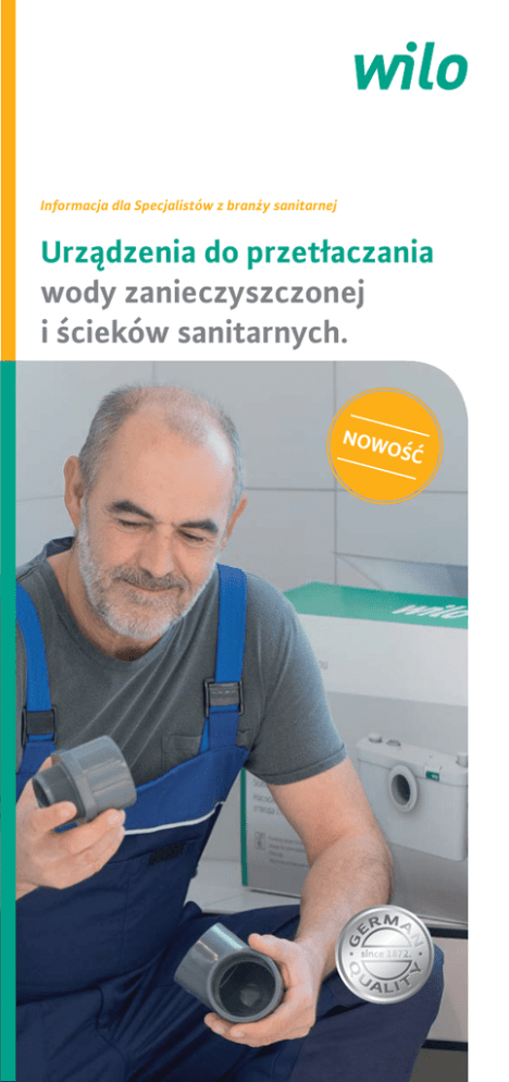 Informacja dla Specjalistów z branży sanitarnej Urządzenia do przetłaczania wody zanieczyszczonej i ścieków sanitarnych. NOW OŚĆ Urządzenia do przetłaczania wody zanieczyszczonej i ścieków sanitarnych Wykonaj w dowolnym miejscu nowe pomieszczenia bez brudnych i kosztownych prac remontowych. Wygodniejsze życie i większa wartość domu poprzez dodanie pomieszczeń takich jak WC, łazienka, pralnia czy aneks kuchenny. Adaptacja niewykorzystanych przestrzeni od piwnicy po strych bez burzenia ścian i zmiany instalacji sanitarno-kanalizacyjnej jest teraz możliwa dzięki nowej serii urządzeń do odprowadzania wody brudnej i ścieków, która zapewnia: ƒ niezawodność: 2 lata gwarancji, serwis w całej Polsce, ƒ komfort użytkowania: cicha praca, brak wydobywania się nieprzyjemnych zapachów, ƒ łatwość instalacji: kompaktowa budowa, estetyczny wygląd. Poniższa tabela przedstawia kilka wariantów od dodatkowego WC, do kompletnej łazienki czy aneksu kuchennego, w zależności od ilości i rodzaju przyłączeń. Wilo-HiDrainlift 3-24 Wilo-HiDrainlift 3-35 Wilo-HiDrainlift 3-37 Wilo-HiSewlift 3-15 Wilo-HiSewlift 3-35 Wilo-HiSewlift 3-l35 Nazwa Nr art. Dopływy szt. Poj. l Temp. °C Maks. wys. tłoczenia w pionie w poziomie HiSewlift 3-15 4191675 1 + WC 24 35 5m 90 m HiSewlift 3-l35 4191674 3 + WC 17 35 5m 90 m 90 m HiSewlift 3-35 4191677 3 + WC 24 35 5m HiDrainlift 3-24 4191678 2 9 35 4m 40 m HiDrainlift 3-35 4191679 3 24 60* 5m 50 m HiDrainlift 3-37 4191680 3 24 75* 7m 70 m * Krótkotrwale do 5 min Urządzenia do przetłaczania wody zanieczyszczonej i ścieków sanitarnych Wilo-HiSewlift Odprowadzanie wody zanieczyszczonej i ścieków sanitarnych. N OW OŚĆ W pełni automatyczne urządzenia, zaprojektowane do gromadzenia i odprowadzania ścieków sanitarnych z pojedynczych toalet, wody odpływowej z umywalek, kabin prysznicowych lub bidetów. Jego kompaktowa budowa oraz 3 wersje wykonania pozwalają na montaż bezpośrednio za toaletą bądź podtynkowo. Cechy szczególne i zalety produktu ƒ Ergonomiczna, kompaktowa konstrukcja oraz szeroki zakres zastosowań do montażu bezpośrednio za misą ustępową (wersja 3-15 oraz 3-35) lub podtynkowo (wersja 3-I35). ƒ Hermetyczna budowa gwarantuje cichą pracę (<57 dB), a zintegrowany filtr z węglem aktywnym zapewniają zabezpieczenie przed uwalnianiem się nieprzyjemnych zapachów. ƒ W pełni gotowe do podłączenia urządzenie dostarczane wraz elementami montażowymi. ƒ Zintegrowane zabezpieczenie przez przepływem zwrotnym. ƒ Pokrywa rewizyjna pozwalająca na usunięcie awarii bez konieczności demontażu całego agregatu. ƒ Dopuszczalny zakres temp. medium +5 ... +35°C. 508 243 H/m 8 Wilo-HiSewlift 3 3-1 7 6 348 353 262 5, 3 -35 5 , 3- I 35 4 3 186 HiSewlift 3-15 2 1 0 243 622 0 1 2 3 maks. 20m 348 353 262 5m 186 512 maks. 40m 4m HiSewlift 3-35 maks. 60m 3m maks. 80m 2m 149 maks. 90m 379 369 370 378 283 1m Ø32/28/22 470 HiSewlift 3l-35 5 Q/m³/h 4 Urządzenia do przetłaczania wody zanieczyszczonej i ścieków sanitarnych Wilo-HiDrainlift Odprowadzanie wody zanieczyszczonej. N OW OŚĆ Małe i w pełni automatyczne urządzenia, zaprojektowane do gromadzenia i odprowadzania wody zanieczyszczonej (z wyjątkiem toalet), z kabin prysznicowych, umywalek, pralek czy zmywarek. Wyposażone w od 1 do 3 dopływów w zależności od typu. Jego kompaktowa budowa pozwala na montaż zarówno nad podłogą jak i zabudowę w szafce pod umywalką. Cechy szczególne i zalety produktu ƒ Ergonomiczna, kompaktowa konstrukcja oraz szeroki zakres zastosowań do montażu w kuchni lub łazience. ƒ Szczególnie kompaktowe wykonanie wersji HiDrainlift 3-24 pozwala na montaż nawet pod kabiną prysznicową. ƒ Hermetyczna budowa gwarantuje cichą pracę (<54 dB), a zintegrowany filtr z węglem aktywnym zapewniają zabezpieczenie przed uwalnianiem się nieprzyjemnych zapachów. ƒ W pełni gotowe do podłączenia urządzenie dostarczane wraz z elementami montażowymi. ƒ Zintegrowane zabezpieczenie przez przepływem zwrotnym. ƒ Odporność na gorącą wodę (do 75°C) pozwala na przyłączenie zmywarki lub pralki. 508 348 353 262 161 188 177 622 372 HiDrainlift 3-24 H/m 8 Wilo-HiDrainlift 3 7m 7 6m 6 maks. 10m maks. 20m 5 4 maks. 30m 5m 3 2 maks. 40m 4m 1 0 0 3-24 1 186 HiDrainlift 3-35 2 3 3-35 4 5 3-37 6 Q/m³/h maks. 50m 3m maks. 60m 2m maks. 70m 1m Ø32 Urządzenia do przetłaczania wody zanieczyszczonej i ścieków sanitarnych Wilo-DrainLift Con Odprowadzanie kondensatu i skroplin. q Kompaktowy agregat do przetłaczania zanieczyszczonego kondensatu (pH ≥ 2,4), charakteryzujący się ergonomiczną budową, pozwalającą na montaż w ciężko dostępnych miejscach. Urządzenie wyposażone zostało w styki alarmowe, sygnalizujące stan przepełnienia, zawór zwrotny oraz przezroczysty wąż ciśnieniowy, pozwalający na monitorowanie stanu zanieczyszczenia instalacji. Cechy szczególne i zalety produktu ƒ Wyjątkowo cicha praca: 47 dB(A). ƒ Maks. wydajność 600 l/h oraz 5,4 m wysokości podnoszenia. ƒ Dopuszczalny zakres temp. medium +5 ... +50 °C. ƒ Podłączenie do sieci 1~230 V, 50 Hz. ƒ Pojemność zbiornika 1,2 l. ƒ Kompletny agregat z wężem ciśnieniowym oraz z zaworem zwrotnym. ƒ Seryjnie wyposażone w styk alarmowy do sygnalizacji przepełnienia. ƒ Bardzo niski pobór mocy: max 60W. H[m ] ƒ Łatwy montaż dzięki zmiennym dopływom/odpływom i możliwości obrotu jednostki Wilo-DrainLift o-DrainLift Con Wilo-DrainLift Con silnika o 180°. 6 ƒ Możliwość montażu wolnostojącego lub montażu na ścianie za pomocą dwóch otworów mocujących. 5 4 3 2 1 0 0 82,5 169,5 21 Ø 12 195 50 100 150 200 250 300 350 [l /h] Urządzenia do przetłaczania wody zanieczyszczonej i ścieków sanitarnych Wilo-DrainLift Box Odprowadzanie wody zanieczyszczonej. · rurociąg odpowietrzający (ponad dach) rurociąg tłoczny Druckleitung R ys. 9 dopływ W pełni automatyczne urządzenie, zaprojektowane do gromadzenia i odprowadzania w