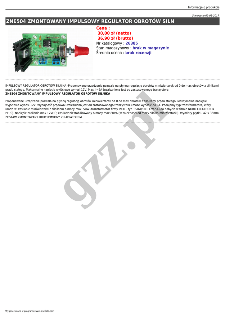 Informacje o produkcie Utworzono 02-03-2017 ZNE504 ZMONTOWANY IMPULSOWY REGULATOR OBROTÓW SILN Cena : 30,00 zł (netto) 36,90 zł (brutto) Nr katalogowy : 26385 Stan magazynowy : brak w magazynie Średnia ocena : brak recenzji IMPULSOWY REGULATOR OBROTÓW SILNIKA -Proponowane urządzenie pozwala na płynną regulację obrotów miniwiertarek od 0 do max obrotów z silnikami prądu stałego. Maksymalne napięcie wyjściowe wynosi 12V. Max. I=6A (uzależniona jest od zastosowanego tranzystora ZNE504 ZMONTOWANY IMPULSOWY REGULATOR OBROTÓW SILNIKA gz z .p l Proponowane urządzenie pozwala na płynną regulację obrotów miniwiertarek od 0 do max obrotów z silnikami prądu stałego. Maksymalne napięcie wyjściowe wynosi 12V. Wydajność prądowa uzależniona jest od zastosowanego tranzystora i może wynosić do 6A. Podajemy typ transformatora, który umożliwi zasilanie miniwiertarki z silnikiem o mocy max. 50W -transformator firmy INDEL typ TST60/001 12V-5A (do nabycia w firmie NORD ELEKTRONIK PLUS). Napięcie zasilania max 17VDC; zasilacz niestabilizowany o mocy max 80VA (w zależności od mocy silnika miniwiertarki). Wymiary płytki - 42 x 36mm. ZESTAW ZMONTOWANY URUCHOMIONY Z RADIATOREM Wygenerowano w programie www.oscGold.com