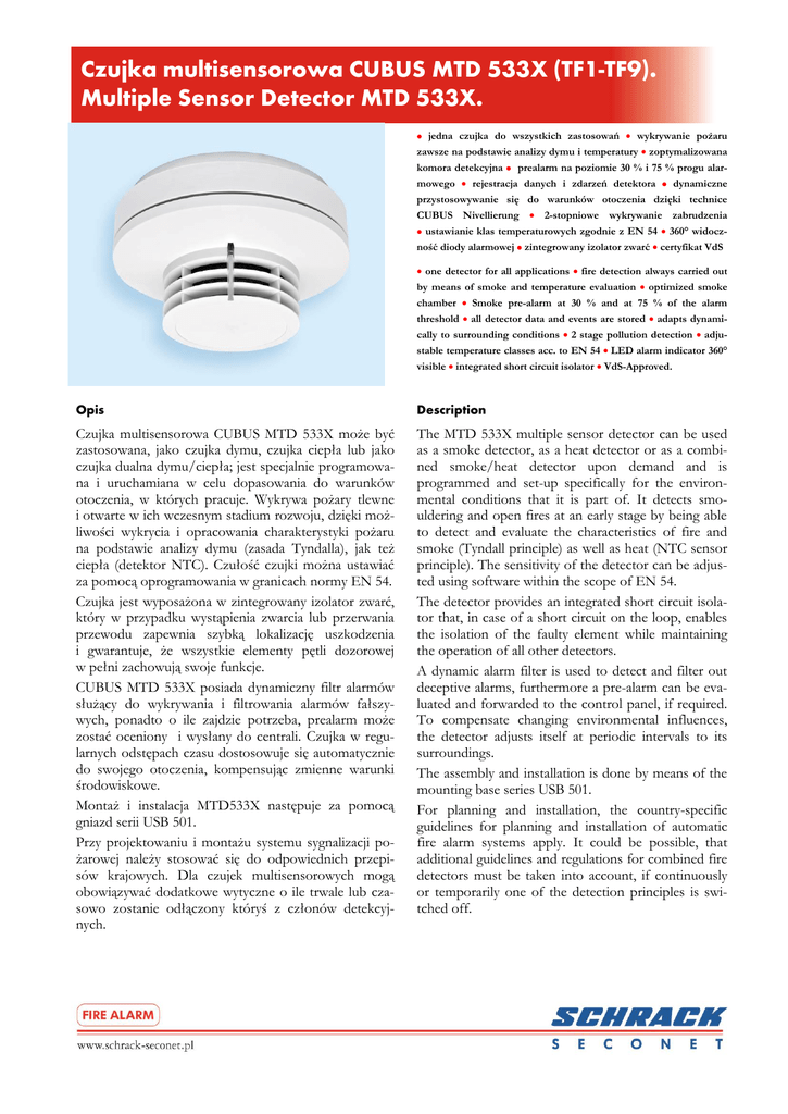 Czujka multisensorowa CUBUS MTD 533X (TF1-TF9). Multiple Sensor Detector MTD 533X. jedna czujka do wszystkich zastosowań wykrywanie pożaru . zawsze na podstawie analizy dymu i temperatury zoptymalizowana komora detekcyjna prealarm na poziomie 30 % i 75 % progu alarmowego rejestracja danych i zdarzeń detektora dynamiczne przystosowywanie się do warunków otoczenia dzięki technice CUBUS Nivellierung 2-stopniowe wykrywanie zabrudzenia ustawianie klas temperaturowych zgodnie z EN 54 360° widoczność diody alarmowej zintegrowany izolator zwarć certyfikat VdS one detector for all applications fire detection always carried out by means of smoke and temperature evaluation optimized smoke chamber Smoke pre-alarm at 30 % and at 75 % of the alarm threshold all detector data and events are stored adapts dynamically to surrounding conditions 2 stage pollution detection adjustable temperature classes acc. to EN 54 LED alarm indicator 360° visible integrated short circuit isolator VdS-Approved. Opis Description Czujka multisensorowa CUBUS MTD 533X może być zastosowana, jako czujka dymu, czujka ciepła lub jako czujka dualna dymu/ciepła; jest specjalnie programowana i uruchamiana w celu dopasowania do warunków otoczenia, w których pracuje. Wykrywa pożary tlewne i otwarte w ich wczesnym stadium rozwoju, dzięki możliwości wykrycia i opracowania charakterystyki pożaru na podstawie analizy dymu (zasada Tyndalla), jak też ciepła (detektor NTC). Czułość czujki można ustawiać za pomocą oprogramowania w granicach normy EN 54. Czujka jest wyposażona w zintegrowany izolator zwarć, który w przypadku wystąpienia zwarcia lub przerwania przewodu zapewnia szybką lokalizację uszkodzenia i gwarantuje, że wszystkie elementy pętli dozorowej w pełni zachowują swoje funkcje. CUBUS MTD 533X posiada dynamiczny filtr alarmów służący do wykrywania i filtrowania alarmów fałszywych, ponadto o ile zajdzie potrzeba, prealarm może zostać oceniony i wysłany do centrali. Czujka w regularnych odstępach czasu dostosowuje się automatycznie do swojego otoczenia, kompensując zmienne warunki środowiskowe. Montaż i instalacja MTD533X następuje za pomocą gniazd serii USB 501. Przy projektowaniu i montażu systemu sygnalizacji pożarowej należy stosować się do odpowiednich przepisów krajowych. Dla czujek multisensorowych mogą obowiązywać dodatkowe wytyczne o ile trwale lub czasowo zostanie odłączony któryś z członów detekcyjnych. The MTD 533X multiple sensor detector can be used as a smoke detector, as a heat detector or as a combined smoke/heat detector upon demand and is programmed and set-up specifically for the environmental conditions that it is part of. It detects smouldering and open fires at an early stage by being able to detect and evaluate the characteristics of fire and smoke (Tyndall principle) as well as heat (NTC sensor principle). The sensitivity of the detector can be adjusted using software within the scope of EN 54. The detector provides an integrated short circuit isolator that, in case of a short circuit on the loop, enables the isolation of the faulty element while maintaining the operation of all other detectors. A dynamic alarm filter is used to detect and filter out deceptive alarms, furthermore a pre-alarm can be evaluated and forwarded to the control panel, if required. To compensate changing environmental influences, the detector adjusts itself at periodic intervals to its surroundings. The assembly and installation is done by means of the mounting base series USB 501. For planning and installation, the country-specific guidelines for planning and installation of automatic fire alarm systems apply. It could be possible, that additional guidelines and regulations for combined fire detectors must be taken into account, if continuously or temporarily one of the detection principles is switched off. Technical data Napięcie robocze: Prąd dozorowania: Wyjścia alarmowe: Operating voltage: Quiescent current: Alarm output: 12 do 30 VDC 120 µA typ. 3 programowalne poziomy 0,1 mA/1 mA/5 mA Wskaźnik LED aktywny: 1,6 mA Prąd alarmowy: min. 0,5 mA, max. 10 mA Wyjście napięciowe: programowalne X-LINE: 5V technika pętlowa: 6,3 V Gniazdo: USB 501-x Zasada działania: dualna czujka dymu /ciepła (efekt Tyndalla/czujnik NTC ) Transmisja sygnału: szeregowa transmisja danych, technika dwuprzewodowa Czułość: cz. dymu zgodnie z EN 54-7, cz. ciepła zgodnie z EN 54-5, klasa A1,A2 i B (indeks S i R) Stopień ochrony: IP 44 (z gniazdem USB 501-1) Temperatura otoczenia: -20° do +60°C Wilgotność względna: ciągła bez kondensacji: przy ≤ 34 °C: 10 ... 95 % rel/F przy > 34 °C: maks. 35 g/m³ min. 10 % rel/F Prędkość powietrza: maks. 20 m/s Wymiary: zobacz rysunek powyżej Kolor obudowy: biały podobny do RAL 9003 na zamówienie wszystkie kolory RAL Materiał obudowy: ABS/PC Waga: 125 g Certyfikat zgodności: 0786-CPD-20993 Dopuszczenie VdS: G210115 12 to 30 VDC 120 µA typ 3 levels programmable 0,1 mA/1 mA/5 mA Alarm-LED active: 1,6 mA Alarm current: min. 0,5 mA, max. 10 mA Output current: programmable X-LINE: 5V Loop technology: 6,3 V Detector base: USB 501-x Principle of function: Combined smoke/heat detector (Tyndall effect and/or NTC sensor) Signal transmission: serial biphase data transmission, 2-wire -technology Sensitivity: smoke acc. to EN 54-7 heat acc. to EN 54-5; (classes A1, A2 and B (Index S and R) Protection class: IP 44 (with base USB 501-1) Ambient temperature: -20° to +60°C Rel. humidity: permanent, without condensation: at ≤ 34 °C: 10 ... 95 % rel/F at > 34 °C: max. 35 g/m³ min. 10 % rel/F Air velocity: max. 20 m/s Dimensions: see drawing above Case colour: white similar to RAL 9003 all RAL colours upon request Case material: Weight: CPD-Approval: VdS-Approval: ABS/PC 125 g 0786-CPD-20993 G210115 © Schrack Productions - B-DB-0094PL-EN – V2.0 Zmiany techniczne zastrzeżone - subject to technical modifications Dane techniczne Dod