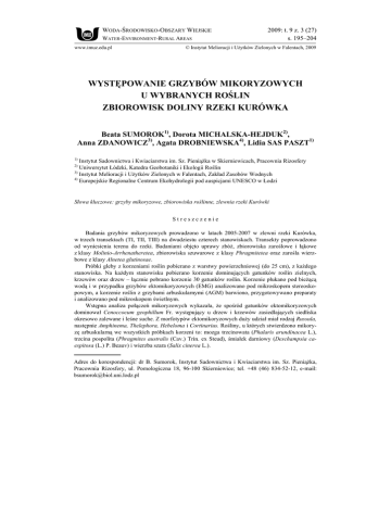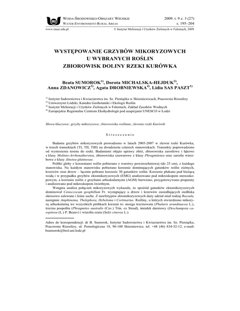 WODA-ŚRODOWISKO-OBSZARY WIEJSKIE WATER-ENVIRONMENT-RURAL AREAS www.imuz.edu.pl 2009: t. 9 z. 3 (27) s. 195–204 © Instytut Melioracji i Użytków Zielonych w Falentach, 2009 WYSTĘPOWANIE GRZYBÓW MIKORYZOWYCH U WYBRANYCH ROŚLIN ZBIOROWISK DOLINY RZEKI KURÓWKA Beata SUMOROK1), Dorota MICHALSKA-HEJDUK2), Anna ZDANOWICZ3), Agata DROBNIEWSKA4), Lidia SAS PASZT1) 1) Instytut Sadownictwa i Kwiaciarstwa im. Sz. Pieniążka w Skierniewicach, Pracownia Rizosfery Uniwersytet Łódzki, Katedra Geobotaniki i Ekologii Roślin 3) Instytut Melioracji i Użytków Zielonych w Falentach, Zakład Zasobów Wodnych 4) Europejskie Regionalne Centrum Ekohydrologii pod auspicjami UNESCO w Łodzi 2) Słowa kluczowe: grzyby mikoryzowe, zbiorowiska roślinne, zlewnia rzeki Kurówki Streszczenie Badania grzybów mikoryzowych prowadzono w latach 2005-2007 w zlewni rzeki Kurówka, w trzech transektach (TI, TII, TIII) na dwudziestu czterech stanowiskach. Transekty poprowadzono od wyniesienia terenu do rzeki. Badaniami objęto uprawy zbóż, zbiorowiska zaroślowe i łąkowe z klasy Molinio-Arrhenatheretea, zbiorowiska szuwarowe z klasy Phragmitetea oraz zarośla wierz bowe z klasy Alnetea glutinosae. Próbki gleby z korzeniami roślin pobierano z warstwy powierzchniowej (do 25 cm), z każdego stanowiska. Na każdym stanowisku pobierano korzenie dominujących gatunków roślin zielnych, krzewów oraz drzew – łącznie pobrano korzenie 30 gatunków roślin. Korzenie płukano pod bieżącą wodą i w przypadku grzybów ektomikoryzowych (EMG) analizowano pod mikroskopem stereosko powym, a korzenie roślin z grzybami arbuskularnymi (AGM) barwiono, przygotowywano preparaty i analizowano pod mikroskopem świetlnym. Wstępna analiza połączeń mikoryzowych wykazała, że spośród gatunków ektomikoryzowych dominował Cenoccocum geophillum Fr. występujący u drzew i krzewów zasiedlających siedliska okresowo zalewane i leśne suche. Z morfotypów ektomikoryzowych duży udział miał rodzaj Russula, następnie Amphinema, Thelephora, Hebeloma i Cortinarius. Rośliny, u których stwierdzono mikory zę arbuskularną we wszystkich próbkach korzeni to: mozga trzcinowata (Phalaris arundinacea L.), trzcina pospolita (Phragmites australis (Cav.) Trin. ex Steud), śmiałek darniowy (Deschampsia ca espitosa (L.) P. Beauv) i wierzba szara (Salix cinerea L.). Adres do korespondencji: dr B. Sumorok, Instytut Sadownictwa i Kwiaciarstwa im. Sz. Pieniążka, Pracownia Rizosfery, ul. Pomologiczna 18, 96-100 Skierniewice; tel. +48 (46) 834-52-12, e-mail: [email protected] 196 Woda-Środowisko-Obszary Wiejskie t. 9 z. 3 (27) WSTĘP W ekosystemach naturalnych symbiotyczne grzyby mikoryzowe kolonizują ko rzenie 90% gatunków roślin naczyniowych [READ, 1991]. Mikoryza występuje w różnych siedliskach – w zbiorowiskach leśnych umiarkowanej strefy klimatycz nej występują grzyby ektomikoryzowe (EMG), zaś w zbiorowiskach roślin klimatu tropikalnego oraz w zbiorowiskach nieleśnych klimatu umiarkowanego przeważa mikoryza arbuskularna (AGM). W pierwszym przypadku strzępki grzyba nie wni kają do komórek kortykalnych korzenia, ale tworzą między nimi sieć Hartiga, a na powierzchni gęsto splecioną mufkę. W przypadku mikoryzy arbuskularnej (endo mikoryza) grzybnia wnika do komórek kortykalnych korzenia, a mufka nie wystę puje. W komórkach korzenia tworzą się arbuskule – miejsca wymiany składników pokarmowych między partnerami – rośliną i grzybem [ALLEN, 1991]. Grzyby mikoryzowe są ważnym komponentem ryzosfery – grzybnia przerasta podłoże, wiąże ziarna piasku w agregaty lub/i wydziela substancje sklejające czą steczki gleby (m.in. glomalinę) [WRIGHT, UPADHYAYA, 1998; 1999]. Dzięki grzybni zwiększa się powierzchnia chłonna korzenia rośliny i do komórek roślin są dostarczane substancje biogeniczne, głównie fosfor i azot. Aktywność mikroorga nizmów ryzosfery jest czynnikiem warunkującym wzrost rośliny oraz jej odpor ność na patogeny [AZCÓN-AGUILAR, BAREA, 1992]. Występowanie grzybów mikoryzowych w korzeniach roślin świadczy o natu ralności ekosystemu. Grzyby mikoryzowe mają wpływ na kształtowanie się zespo łów roślinnych [ALLEN, 1991; READ, 1991]. Występowanie grzybów mikoryzo wych u roślin zależy od: wilgotności podłoża, dostępności tlenu, okresu zalewania, temperatury, odczynu (pH) gleby i dostępności pierwiastków biogenicznych [EN TRY i in., 2002; TURNER, FRIESE, 1998]. Obecność grzybów symbiotycznych w zbiorowiskach mokradłowych jest limitowana przez okres stagnacji wody i in tensywność zalewania. Badania nad grzybami mikoryzowymi terenów okresowo zalewanych są podejmowane coraz częściej [m.in. CLAYTON, BAGYARAJ, 1984; MILLER, SHARITZ, 2000; WETZEL, VAN DER VALK, 1996]. Celem badań podjętych w sezonach wegetacyjnych lat 2005–2007 było okre ślenie statusu mikoryzowego roślin w zbiorowiskach roślinnych doliny rzeki Ku rówka (otulina Narwiańskiego Parku Narodowego). TEREN I METODY BADAŃ Badania mikoryz prowadzono w zlewni rzeki Kurówka, która jest lewobrzeż nym dopływem Narwi i płynie przez obszar otuliny Narwiańskiego Parku Narodo wego (rys. 1). Gleby na badanym terenie są wyraźnie zróżnicowane w zależności od ukształ towania terenu. Na terasie nadzalewowym (ok. 125 m n.p.m.) występują gleby piaszczyste, na jego stokach – piaszczysto-gliniaste oraz organiczne, natomiast na B. Sumorok i in.: Występowanie grzybów mikoryzowych u wybranych roślin… 197 NARWIANSKI TIII TII TI Rzeka Kurówka Rys. 1. Teren badań (TI, TII, TIII – transekty) [SUMOROK, ZDANOWICZ, 2006, zmienione] Fig. 1. Study area (TI, TII, TIII – transects) [SUMOROK, ZDANOWICZ 2006, changed] terasie zalewowym rzeki Kurówka (ok. 110 m n.p.m.) przeważają gleby torfiaste. Podczas wezbrań gleby te są silnie nawodnione. Zawartość materii organicznej w glebach wykształconych na stokach zajętych pod uprawy zbóż wynosi 2–10%, natomiast w pobliżu rzeki 
