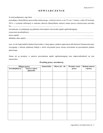 Załącznik Nr 1 OŚWIADCZENIE Ja niżej podpisana/y mgr farm. ………………………………………………………………..…................... posiadający identyfikator pracownika medycznego, o którym mowa w art.17c ust. 5 ustawy z dnia 28 kwietnia 2011r. o systemie informacji w ochronie zdrowia (identyfikator stanowi numer prawa wykonywania zawodu) Nr ............................................................................................................ oświadczam, że podejmuję się pełnienia obowiązków kierownika apteki ogólnodostępnej: oznaczenie przedsiębiorcy ..………………………………………………………………..................................... nazwa apteki……………….………………………………………………………………………….................... dokładny adres apteki………………..……………………………………………………..................................... oraz, że nie będę pełnił/a funkcji kierownika w innej aptece, punkcie aptecznym lub hurtowni farmaceutycznej/ zrezygnuję z obecnie pełnionej funkcji z chwil otrzymania przez stronę zezwolenia na prowadzenie punktu aptecznego Znane mi są przepisy w sprawie prowadzenia apteki ogólnodostępnej oraz odpowiedzialność na tym stanowisku. Przebieg pracy zawodowej Miejsce pracy Przedsiębiorca Nazwa i adres placówki Stanowisko Okres od – do Wymiar czasu pracy Rodzaj umowy o pracę ciąg dalszy oświadczenia str. 2 Przebieg pracy zawodowej Miejsce pracy Przedsiębiorca Nazwa i adres placówki Stanowisko Okres od – do Wymiar czasu pracy Rodzaj umowy o pracę Jestem świadomy/a odpowiedzialności karnej za złożenie fałszywego oświadczenia. ………………………………………. (data) ………………………………………... (podpis) W załączeniu: - dyplom ukończenia studiów - prawo wykonywania zawodu aptekarza/farmaceuty, - dokumenty potwierdzające posiadanie odpowiedniego stażu pracy w aptece oraz ewentualnej specjalizacji z zakresu farmacji aptecznej (dyplom specjalizacji) Uwaga: dokumenty (dyplom, prawo wykonywania zawodu, dokumenty potwierdzające posiadanie odpowiedniego stażu pracy w aptece oraz ewentualnej specjalizacji z zakresu farmacji aptecznej), winny być uwierzytelnionymi kopiami, zgodnie z art.76a §2 Kpa.