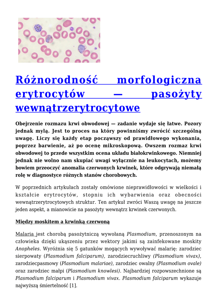 Różnorodność morfologiczna erytrocytów — pasożyty wewnątrzerytrocytowe Obejrzenie rozmazu krwi obwodowej — zadanie wydaje się łatwe. Pozory jednak mylą. Jest to proces na który powinniśmy zwrócić szczególną uwagę. Liczy się każdy etap począwszy od prawidłowego wykonania, poprzez barwienie, aż po ocenę mikroskopową. Owszem rozmaz krwi obwodowej to przede wszystkim ocena układu białokrwinkowego. Niemniej jednak nie wolno nam skupiać uwagi wyłącznie na leukocytach, możemy bowiem przeoczyć anomalia czerwonych krwinek, które odgrywają niemałą rolę w diagnostyce różnych stanów chorobowych. W poprzednich artykułach zostały omówione nieprawidłowości w wielkości i kształcie erytrocytów, stopniu ich wybarwienia oraz obecności wewnątrzerytrocytowych struktur. Ten artykuł zwróci Waszą uwagę na jeszcze jeden aspekt, a mianowicie na pasożyty wewnątrz krwinek czerwonych. Między moskitem a krwinką czerwoną Malaria jest chorobą pasożytniczą wywołaną Plasmodium, przenoszonym na człowieka dzięki ukąszeniu przez wektory jakimi są zainfekowane moskity Anopheles. Wyróżnia się 5 gatunków mogących wywoływać malarię: zarodziec sierpowaty (Plasmodium falciparum), zarodziecruchliwy (Plasmodium vivax), zarodziecpasmowy (Plasmodium malariae), zarodziec owalny (Plasmodium ovale) oraz zarodziec małpi (Plasmodium knowlesi). Najbardziej rozpowszechnione są Plasmodium falciparum i Plasmodium vivax. Plasmodium falciparum wykazuje najwyższą śmiertelność [1]. Symptomami choroby jest gorączka, dreszcze, ból głowy i wymioty, objawiające się zwykle po 10 do 15 dni od zakażenia. Malaria jest uleczalna i można skutecznie zapobiegać jej rozwojowi. Brak leczenia może szybko doprowadzić do dysfunkcji ważnych dla życia organów wewnętrznych. Zatrważającym jest fakt, iż w wielu częściach świata pasożyty wytworzyły oporność na leki przeciwmalaryczne. Ryzyko zarażenia i rozwoju malarii dotyczy połowy populacji ludzkiej. Co roku WHO odnotowuje 250 milionów przypadków malarii i niemalże milion zgonów, przeważnie wśród afrykańskich dzieci. Szacuje się, że w Afryce z powodu malarii w każdej minucie umiera kolejne dziecko. Tam właśnie choroba jest przyczyną 77% zgonów wieku dziecięcego [2]. Cykl rozwojowy Plasmodium jest związany ze zmianami w obrębie erytrocytów. Pasożyty rozwijają się w jelicie samic z rodzaju Anopheles, będących ich żywicielem pośrednim. W wyniku ukąszenia zarodźce przenoszone są ze śliną do żywiciela ostatecznego – człowieka. Wraz z krwią sporozoity trafiają do hepatocytów, gdzie ulegają namnażaniu. Sporozoity zmieniają swój kształt, kształtują się schizonty. Schizonty dzielą się, przekształcają i pękają uwalniając tysiące merozoitów, uwalnianych do krwi. W zależności od gatunku zarodźca proces ten trwa od 5 do 21 dni. Merozoity atakują erytrocyty. W krwinkach czerwonych ponownie ulegają podziałom, ostatecznie niszcząc komórki. Po powstaniu pewnej liczby pokoleń merozoity zamiast przekształcić się w sporozoity, tworzą gamety. Możliwość zapłodnienia pojawia się dopiero w momencie znalezienia się ich w jelicie komara – po wyssaniu krwi człowieka chorego na malarię. Zygoty dzielą się w przewodzie pokarmowym moskita tworząc nowe sporozoity. Wędrują one do jego ślinianek, gdzie czekają na okazję do zarażenia kolejnej ofiary [1]. Cechy mikroskopowe zarodźców malarii Pod mikroskopem wiele form pasożytniczych wygląda podobnie. W przypadku Plasmodium falciparum we krwi widoczne są tylko wczesne trofozoity i gametocyty. Bardzo rzadko widuje się dojrzałe trofozoity czy schizonty (izolowane raczej z tkanek). Wewnątrz krwinek czerwonych obserwuje się dość duże ilości pasożytów. Wielkością erytrocyty zarażone pasożytem nie różnią się od zdrowych. Czasami na krwince są widoczne słabe, okrągłe, czerwone plamki zwane ‘Mauer’s dots’ (szczeliny Maurera – widoczne po specjalnym barwieniu). Charakterystyczne jest występowanie gametocytów w kształcie księżycowatym. Erytrocyty zarażone gatunkiem Plasmodium vivax są bladoróżowe i nawet do dwóch razy większe od zdrowych krwinek. Na powierzchni zainfekowanych komórek pojawiają się ‘Schueffner’s dots’ (plamki Schüffnera). Wewnątrz erytrocytów pojawia się pasożyt o ameboidalnym kształcie. Schizonty mają tutaj do 20 merozoitów, które z kolei przyłączają się tylko do retykulocytów. Ze względu na tą cechę trudno jest zobaczyć duże ilości zarażonych krwinek krążących w krwioobiegu. Trudności w diagnostyce różnicowej Plasmodium vivax i Plasmodium ovale wynikają z podobieństwa obrazu mikroskopowego obu gatunków (przy małej liczbie pasożytów w krwince). Plasmodium ovale powoduje pojawienie się ‘James’s dots’ – nieco ciemniejszych i większych niż ‘Scueffner’s dots’. Około 20% zainfekowanych erytrocytów ma kształt okrągły, czasami nierówne, jakby postrzępione krawędzie. Dojrzałe schizonty posiadają mniej niż 12 jąder, co jest doskonałą cechą diagnostyczną [1]. Erytrocyty zainfekowane Plasmodium malariae raczej nie wykazują powiększenia, czasami nawet wydają się być mniejsze niż normalne krwinki. Brak jest wybarwienia cytoplazmy i plamek na powierzchni krwinki (w specjalnym barwieniu pojawia się kropkowanie Ziemanna). Pasożyt jest upakowany. Charakterystyczne dla tego gatunku są formy pasmowe pod postacią grubych pasów przebiegających przez całą szerokość zarażonego erytrocytu [3]. Diagnostyka malarii opiera się głównie na wykonaniu rozmazu krwi obwodowej. Wykorzystuje się ponadto szybkie testy diagnostyczne z przeciwciałami monoklonalnymi (BinaxNOW) oraz metody molekularne. Między kleszczem a krwinką czerwoną Babeszjoza to niezwykle groźna choroba przenoszona przez kleszcze Dermacentor reticulatus, atakująca przede wszystkim nasze pupile – psy i koty, a także owce