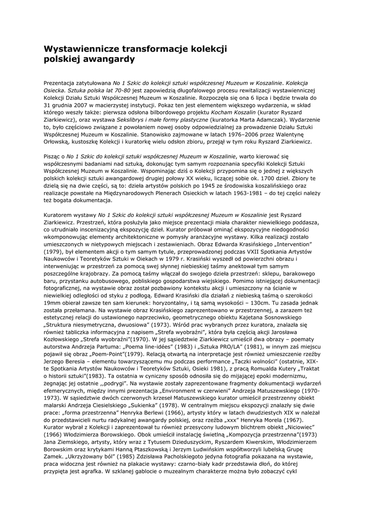 Wystawiennicze transformacje kolekcji polskiej awangardy Prezentacja zatytułowana No 1 Szkic do kolekcji sztuki współczesnej Muzeum w Koszalinie. Kolekcja Osiecka. Sztuka polska lat 70-80 jest zapowiedzią długofalowego procesu rewitalizacji wystawienniczej Kolekcji Działu Sztuki Współczesnej Muzeum w Koszalinie. Rozpoczęła się ona 6 lipca i będzie trwała do 31 grudnia 2007 w macierzystej instytucji. Pokaz ten jest elementem większego wydarzenia, w skład którego weszły także: pierwsza odsłona bilbordowego projektu Kocham Koszalin (kurator Ryszard Ziarkiewicz), oraz wystawa Sekslibrys i małe formy plastyczne (kuratorka Marta Adamczak). Wydarzenie to, było częściowo związane z powołaniem nowej osoby odpowiedzialnej za prowadzenie Działu Sztuki Współczesnej Muzeum w Koszalinie. Stanowisko zajmowane w latach 1976–2006 przez Walentynę Orłowską, kustoszkę Kolekcji i kuratorkę wielu odsłon zbioru, przejął w tym roku Ryszard Ziarkiewicz. Pisząc o No 1 Szkic do kolekcji sztuki współczesnej Muzeum w Koszalinie, warto kierować się współczesnymi badaniami nad sztuką, dokonując tym samym rozpoznania specyfiki Kolekcji Sztuki Współczesnej Muzeum w Koszalinie. Wspominając dziś o Kolekcji przypomina się o jednej z większych polskich kolekcji sztuki awangardowej drugiej połowy XX wieku, liczącej sobie ok. 1700 dzieł. Zbiory te dzielą się na dwie części, są to: dzieła artystów polskich po 1945 ze środowiska koszalińskiego oraz realizacje powstałe na Międzynarodowych Plenerach Osieckich w latach 1963-1981 – do tej części należy też bogata dokumentacja. Kuratorem wystawy No 1 Szkic do kolekcji sztuki współczesnej Muzeum w Koszalinie jest Ryszard Ziarkiewicz. Przestrzeń, która posłużyła jako miejsce prezentacji miała charakter niewielkiego poddasza, co utrudniało inscenizacyjną ekspozycję dzieł. Kurator próbował ominąć ekspozycyjne niedogodności wkomponowując elementy architektoniczne w pomysły aranżacyjne wystawy. Kilka realizacji zostało umieszczonych w nietypowych miejscach i zestawieniach. Obraz Edwarda Krasińskiego „Intervention” (1979), był elementem akcji o tym samym tytule, przeprowadzonej podczas VXII Spotkania Artystów Naukowców i Teoretyków Sztuki w Oiekach w 1979 r. Krasiński wyszedł od powierzchni obrazu i interweniując w przestrzeń za pomocą swej słynnej niebieskiej taśmy anektował tym samym poszczególne krajobrazy. Za pomocą taśmy włączał do swojego dzieła przestrzeń: sklepu, barakowego baru, przystanku autobusowego, pobliskiego gospodarstwa wiejskiego. Pomimo istniejącej dokumentacji fotograficznej, na wystawie obraz został pozbawiony kontekstu akcji i umieszczony na ścianie w niewielkiej odległości od styku z podłogą. Edward Krasiński dla działań z niebieską taśmą o szerokości 19mm obierał zawsze ten sam kierunek: horyzontalny, i tą samą wysokości – 130cm. Tu zasada jednak została przełamana. Na wystawie obraz Krasińskiego zaprezentowano w przestrzennej, a zarazem też estetycznej relacji do ustawionego naprzeciwko, geometrycznego obiektu Kajetana Sosnowskiego „Struktura niesymetryczna, dwuosiowa” (1973). Wśród prac wybranych przez kuratora, znalazła się również tabliczka informacyjna z napisem „Strefa wyobraźni”, która była częścią akcji Jarosława Kozłowskiego „Strefa wyobraźni”(1970). W jej sąsiedztwie Ziarkiewicz umieścił dwa obrazy – poematy autorstwa Andrzeja Partuma: „Poema line-idées” (1983) i „Sztuka PRO/LA” (1981), w innym zaś miejscu pojawił się obraz „Poem-Point”(1979). Relacją otwartą na interpretacje jest również umieszczenie rzeźby Jerzego Beresia – elementu towarzyszącemu mu podczas performance „Taczki wolności” (ostatnie, XIXte Spotkania Artystów Naukowców i Teoretyków Sztuki, Osieki 1981), z pracą Romualda Kutery „Traktat o historii sztuki”(1983). Ta ostatnia w cyniczny sposób odnosiła się do mijającej epoki modernizmu, żegnając jej ostatnie ,,podrygi”. Na wystawie zostały zaprezentowane fragmenty dokumentacji wydarzeń efemerycznych, między innymi prezentacja „Environment w czerwieni” Andrzeja Matuszewskiego (19701973). W sąsiedztwie dwóch czerwonych krzeseł Matuszewskiego kurator umieścił przestrzenny obiekt malarski Andrzeja Ciesielskiego „Sukienka” (1978). W centralnym miejscu ekspozycji znalazły się dwie prace: „forma przestrzenna” Henryka Berlewi (1966), artysty który w latach dwudziestych XIX w należał do przedstawicieli nurtu radykalnej awangardy polskiej, oraz rzeźba „xxx” Henryka Morela (1967). Kurator wybrał z Kolekcji i zaprezentował tu również przesycony ludowym blichtrem obiekt „Niciowiec” (1966) Włodzimierza Borowskiego. Obok umieścił instalację świetlną „Kompozycja przestrzenna”(1973) Jana Ziemskiego, artysty, który wraz z Tytusem Dzieduszyckim, Ryszardem Kiwerskim, Włodzimierzem Borowskim oraz krytykami Hanną Ptaszkowską i Jerzym Ludwińskim współtworzyli lubelską Grupę Zamek. „Ukrzyżowany ból” (1985) Zdzisława Pacholskiegoto jedyna fotografia pokazana na wystawie, praca widoczna jest również na plakacie wystawy: czarno-biały kadr przedstawia dłoń, do której przypięta jest agrafka. W szklanej gablocie o muzealnym charakterze można było zobaczyć cykl rysunków Marka Wawryna (Osieki – sierpień 80) zmontowanych z gotowej ilustracji przedstawiającej zabieg dopochwowej aplikacji leku, każdy z 16 rysunku, opatrzony był autorefleksyjną notatką – hasłem autora. Rzut ogólny a wystawę, na pierwszym planie Henryk Morel , xxx, 1967, fot. Agnieszka Okrzeja Kuratorski wybór nie odznaczał się czytelną ideą. Sugerował raczej coś, na kształt „spisu treści”, według którego odbiorca znający choć trochę specyfikę Kolekcji Sztuki Współczesnej Muzeum w Koszalinie może spróbować rozwinąć perspektywę poszczególnych zasugerowanych na wystawie ,,rozdziałów