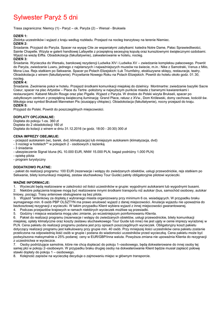 Sylwester Paryż 5 dni Trasa zagraniczna: Niemcy (1) - Paryż – ok. Paryża (2) – Wersal - Bruksela DZIEŃ 1: Zbiórka uczestników i wyjazd z kraju według rozkładu. Przejazd na nocleg tranzytowy na terenie Niemiec. DZIEŃ 2: Śniadanie. Przyjazd do Paryża. Spacer na wyspę Cite ze wspaniałymi zabytkami: katedra Notre Dame, Pałac Sprawiedliwości, Sainte Chapelle. Wizyta w galerii handlowej Lafayette z przepiękną secesyjną kopułą oraz kunsztownymi świątecznymi ozdobami. Wjazd na wieżę Eiffla. Obiadokolacja (fakultatywnie), zakwaterowanie w hotelu, nocleg. DZIEŃ 3: Śniadanie. Wycieczka do Wersalu, barokowej rezydencji Ludwika XIV i Ludwika XV – zwiedzanie kompleksu pałacowego. Powrót do Paryża, zwiedzanie Luwru, jednego z najstarszych i najważniejszych muzeów na świecie, m.in.: Nike z Samotraki, Venus z Milo, Mona Lisa. Rejs statkiem po Sekwanie. Spacer po Polach Elizejskich: Łuk Triumfalny, ekskluzywne sklepy, restauracje, teatry. Obiadokolacja z winem (fakultatywnie). Przywitanie Nowego Roku na Polach Elizejskich. Powrót do hotelu około godz. 01.30, nocleg. DZIEŃ 4: Śniadanie. Zwolnienie pokoi w hotelu. Przejazd środkami komunikacji miejskiej do dzielnicy Montmartre: zwiedzanie bazyliki Sacre Coeur, spacer na plac Artystów – Place du Tertre -położony w najwyższym punkcie miasta z barwnymi kawiarenkami i restauracjami. Kabaret Moulin Rouge oraz plac Pigalle. Wyjazd z Paryża. W drodze do Polski wizyta Brukseli, spacer po zabytkowym centrum z przepiękną świąteczną iluminacją: Grand Place, ratusz z XVw., Dom Królewski, domy cechowe, kościół św. Mikołaja oraz symbol Brukseli Manneken Pis (siusiający chłopiec). Obiadokolacja (fakultatywnie), nocny przejazd do kraju. DZIEŃ 5: Przyjazd do Polski. Powrót do poszczególnych miejscowości. DOPŁATY OPCJONALNE: Dopłata do pokoju 1-os. 360 zł Dopłata do 2 obiadokolacji 160 zł Dopłata do kolacji z winem w dniu 31.12.2016 (w godz. 18:00 - 20:30) 300 zł CENA IMPREZY OBEJMUJE: - przejazd autokarem (wc, barek, dvd, klimatyzacja) lub mniejszym autokarem (klimatyzacja, dvd) - 3 noclegi w hotelach** w pokojach 2 - osobowych z łazienką - 3 śniadania - ubezpieczenie Signal Iduna (KL 10.000 EUR, NNW 15.000 PLN, bagaż podróżny 1.000 PLN) - opiekę pilota - program turystyczny DODATKOWO PŁATNE: - pakiet do realizacji programu: 100 EUR (rezerwacje i wstępy do zwiedzanych obiektów, usługi przewodnickie, rejs statkiem po Sekwanie, bilety komunikacji miejskiej, zestaw słuchawkowy Tour Guide) patnły obligatoryjnie pilotowi wycieczki. WAŻNE INFORMACJE: 1. Wycieczki będą realizowane w zależności od ilości uczestników w grupie: wygodnymi autokarami lub wygodnymi busami. 2. Niektóre połączenia krajowe mogą być realizowane innymi środkami transportu niż autokar (bus, samochód osobowy, autokar liniowy, pociąg). Trasy antenowe obsługiwane są bez pilota. 3. Wyjazd *antenkowy za dopłatą z wybranego miasta organizowany przy minimum 6 os. wsiadających. W przypadku braku wymaganego min. 6 osób PBP OLSZTYN ma prawo anulować wyjazd z danej miejscowości. Anulacja wyjazdu nie upoważnia do bezkosztowej rezygnacji z wycieczki. W takim przypadku Klient wybiera wyjazd z innej miejscowości gwarantowanej. 4. Podczas przejazdów krajowych w ramach niektórych wycieczek możliwe są przesiadki. 5. Godziny i miejsca wsiadania mogą ulec zmianie, po wcześniejszym poinformowaniu Klienta. 6. Pakiet do realizacji programu (rezerwacje i wstępy do zwiedzanych obiektów, usługi przewodnickie, bilety komunikacji miejskiej, opłaty klimatyczne oraz koszty zestawu słuchawkowego Tour Guide lub inne) nie jest ujęty w cenie imprezy wyrażonej w PLN. Cena pakietu do realizacji programu podana jest przy opisach poszczególnych wycieczek. Obligatoryjny koszt pakietu dotyczący realizacji programu jest kalkulowany przy grupie min. 40 osób. Przy mniejszej ilości uczestników cena pakietu zostanie przeliczona na odpowiednią ilość osób w grupie i podana do wiadomości uczestników przed wycieczką. Cena pakietu może być podwyższona maksymalnie o 25% podanej ceny w EUR/GBP/inna waluta. Powyższa zmiana nie upoważnia Klienta do rezygnacji z uczestnictwa w wycieczce. 7. Osoby podróżujące samotnie, które nie chcą dopłacać do pokoju 1–osobowego, będą dokwaterowane do innej osoby tej samej płci w pokoju 2–osobowym. W przypadku braku drugiej osoby na dokwaterowanie Klient będzie musiał zapłacić połowę stawki dopłaty do pokoju 1 – osobowego. 8. Kolejność zapisów na wycieczkę decyduje o zajmowaniu miejsc w głównym transporcie.