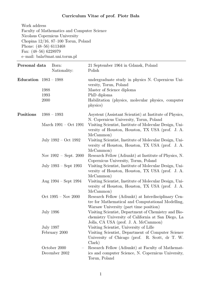 Curriculum Vitae of prof. Piotr Ba la Work address Faculty of