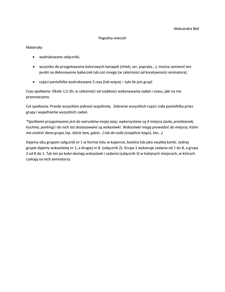 Aleksandra Biel Pogodny wieczór Materiały: • wydrukowane
