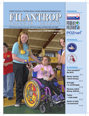 PISMO RUCHU TWÓRCZEGO OSÓB NIEPEŁNOSPRAWNYCH FINANSUJĄ Nr (211) 6 Poznań czerwiec 2012 Nr indeksu 327948 ISSN 1231-8876 Najważniejsza jest radość dziecka – str. 24 i 25 PATRONUJĄ W NUMERZE: „Fura szczęścia” dla WTZ str. 4 Barwy, hymny i tańce Europy str. 11 W kręgle i w cymbergaja str. 20 Narysuj, pokaż dłonią, dotknij… str. 28 FOT. JERZY KOT Taniec – moja pasja str. 33 Senior za ladą i na koncercie str. 40 2 STRONA CZERWIEC 2012 PROTEST Bartosz Arłukowicz Minister Zdrowia Warszawa Karolina K Kasprzak K PPOZNAŃ Zarząd Główny Polskiego Stowarzyszenia Ludzi Cierpiących na Padaczkę stanowczo protestuje przeciwko ponownej podwyżce cen leków przeciwpadaczkowych: leku KEPPRA i leku TOPAMAX Środowisko chorych na padaczkę, w tym szczególnie na padaczkę lekooporną, jest jedną z najuboższych grup społecznych w Polsce. Posiada bowiem najniższe renty rolnicze, najniższe renty z tytułu niezdolności do pracy oraz najniższe emerytury i renty socjalne. Od 1 marca 2012 roku podwyższono cenę leku KEPPRA. Obecnie od 1 maja 2012 roku ponownie planuje się podwyższenie ceny tego leku. Należy zadać pytanie: komu zależy na tym, aby pozbawić pacjentów tych leków i w praktyce wyeliminować je z rynku leków przeciwpadaczkowych, gdyż nie będą realizowane recepty lekarskie. Mając na uwadze Deklarację Parlamentu Europejskiego z 15 września 2011 roku i pismo do Pana Ministra prezesów ILAE i IBE z 1 listopada 2011 roku w sprawie padaczki stanowczo domagamy się wycofania podwyżki cen leków przeciwpadaczkowych, w tym szczególnie leku KEPPRA, który już obecnie jest bardzo drogi dla ubogich pacjentów z padaczką. W sobotnie popołudnie 19 maja wielu mieszkańców Poznania i Wielkopolski przybyło na stadion Ośrodka Przywodnego na Ratajach, przy osiedlu Piastowskim. Cel był wyjątkowy, gdyż tego dnia Wicewojewoda Wielkopolski Przemysław Pacia zorganizował tu I Mecz Charytatywny Piłki Nożnej o Puchar Serc z udziałem wolontariuszy i dziennikarzy. Całkowity dochód przeznaczono na leczenie i rehabilitację dwójki dzieci z rozszczepem kręgosłupa: siedmioletniej Gabrysi Brzostowskiej i dwuletniego Mikołaja Domańskiego. Nie można pozbawiać pacjentów już stosowanej terapii, przynoszącej dobre efekty lecznicze. To zbyt niebezpieczne dla zdrowia osób chorych na padaczkę. Apelujemy do Pana Ministra o korektę podjętych już decyzji dotyczących podwyżki leków przeciwpadaczkowych. Szczególnie lek KEPPRA jest stosowany przez dużą grupę pacjentów. Podwyższenie ceny preparatu spowoduje, że pacjenci nie będą mogli nabyć leku z powodu wysokiej ceny . BIAŁYSTOK, 19 KWIETNIA 2012 ROKU TADEUSZ ZARĘBSKI PREZES ZARZĄDU GŁÓWNEGO POLSKIEGO STOWARZYSZENIA LUDZI CIERPIĄCYCH NA PADACZKĘ DZIEŃ DAWCY SZPIKU W POZNANIU 4 mililitry dla życia iepokojąco wzrasta liczba chorych na nowotwory krwi. Co drugi pacjent zakwalifikowany do przeszczepu szpiku nie znajduje dawcy. Często w pogoni za własnymi sprawami nie zdajemy sobie sprawy, że możemy pomóc w prosty sposób, a tym samym ocalić czyjeś życie. W niedzielę 13 maja w budynku Zespołu Szkół z Oddziałami Integracyjnymi nr 3 przy ul. Powstańców Wielkopolskich 3 Fundacja DKMS Baza Dawców Komórek Macierzystych Polska wraz z Europejskim Forum Studentów AEGEE Poznań zorganizowała Dzień Dawcy Szpiku. Od godziny 11 do 17 Poznaniacy mogli uzyskać niezbędne informacje na temat przeszczepu szpiku. Rejestracji dawców dokonywano poprzez wypełnienie formularza i pobranie wymazu z jamy ustnej za pomocą specjalnych patyczków. Zainteresowanie przeszło najśmielsze oczekiwania, bo już po niespełna godzinie od rozpoczęcia akcji zgłosiło się blisko 50 dawców. – Celem projektu Dzień Dawcy Szpiku „Podaruj innym cząstkę siebie” jest promocja wiedzy w zakresie dawstwa szpiku w celu zwiększenia świadomości społecznej oraz uzyskanie szansy na znalezienie zgodnych, nie FOT. KAROLINA KASPRZAK N O godzinie 14 nastąpiło oficjalne otwarcie imprezy. Dzieci otrzymały upominki od darczyńców, które sprawiły wiele radości. Ekipy wolontariuszy składały się z przedstawicieli Hospicjum Palium, Drużyny Szpiku, Pocztowych Krwinek i firmy ENEA. Rozegrano trzy mecze – każdy po 15 minut. Pierwsi na boisko wyszli dziennikarze TVP Poznań i redakcji „Przewodnika Katolickiego”. Zagrali przeciwko wolontariuszom z Czerwonych Krwinek. Wygrali dziennikarze 2:1. Emocji nie brakowało. W Kandydatów na dawców nie brakowało. spokrewnionych dawców dla wszystkich pacjentów poprzez rejestrację jak największej ilości potencjalnych dawców. Projekt ma promować i przekazywać rzetelną wiedzę na temat dawstwa szpiku, by wyeliminować mity na ten temat. Chodzi o uświadomienie ludziom, że każdy może być bohaterem i pomagać innym. Zarejestrować może się każdy zdrowy człowiek pomiędzy 18 a 55 rokiem życia, ważący minimum 50 kg (bez dużej nadwagi). Rejestracja polega na pobraniu 4 mililitrów krwi i zajmuje tylko chwilę. Na podstawie pobranej krwi staną określa się cechy zgodności antygenowej, a jeśli okaże się, że kod genetyczny dawcy zgadza się z kodem genetycznym chorego, wtedy dochodzi do przeszczepu. Wszyscy, którzy chcą się zarejestrować powinni mieć ze sobą dokument tożsamości z nr PESEL – informował organizator. W Polsce zarejestrowanych jest 300.000 potencjalnych dawców, z czego ponad 221.000 to dawcy zarejestrowani w Fundacji DKMS Polska. W przeciągu dwóch lat działalności Fundacji DKMS Polska aż 168 osób oddało swoje komórki macierzyste, dając tym samym nadzieję na nowe życie osobom chorym na białaczkę i inne schorzenia układu krwiotwórczego. KAROLINA KASPRZAK Michałek Domański z mamą i wolontariuszkami. STRONA CZERWIEC 2012 3 I MECZ CHARYTATYWNY PIŁKI NOŻNEJ WICEWOJEWODY WIELKOPOLSKIEGO Dla chorych dzieci Wolontariusze Drużyny Szpiku przygotowują się do rozgrywek. Siedmioletnia Gabrysia Brzostowska (z lewej)