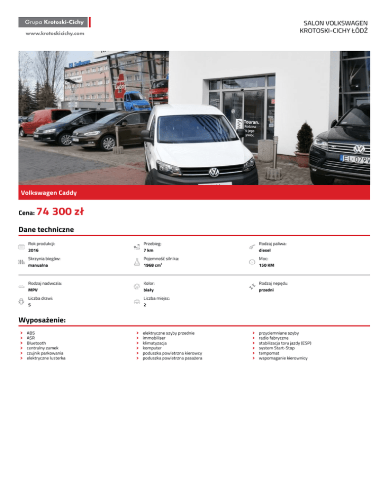 SALON VOLKSWAGEN KROTOSKI-CICHY ŁÓDŹ Volkswagen Caddy Cena: 74 300 zł Dane techniczne Rok produkcji: Przebieg: Rodzaj paliwa: 2016 7 km diesel Skrzynia biegów: Pojemność silnika: Moc: manualna 1968 cm3 150 KM Rodzaj nadwozia: Kolor: Rodzaj nepędu: MPV biały przedni Liczba drzwi: Liczba miejsc: 5 2 Wyposażenie: ABS ASR Bluetooth centralny zamek czujnik parkowania elektryczne lusterka elektryczne szyby przednie immobiliser klimatyzacja komputer poduszka powietrzna kierowcy poduszka powietrzna pasażera przyciemniane szyby radio fabryczne stabilizacja toru jazdy (ESP) system Start-Stop tempomat wspomaganie kierownicy