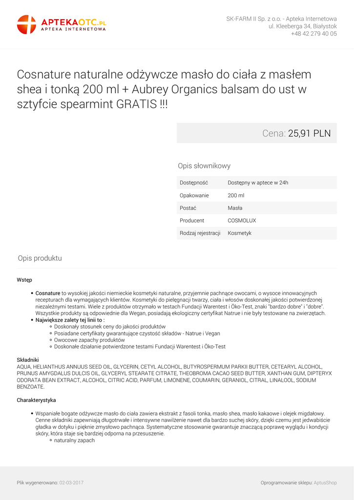SK-FARM II Sp. z o.o. - Apteka Internetowa ul. Kleeberga 34, Białystok +48 42 279 40 05 Cosnature naturalne odżywcze masło do ciała z masłem shea i tonką 200 ml + Aubrey Organics balsam do ust w sztyfcie spearmint GRATIS !!! Cena: 25,91 PLN Opis słownikowy Dostępność Dostępny w aptece w 24h Opakowanie 200 ml Postać Masła Producent COSMOLUX Rodzaj rejestracji Kosmetyk Opis produktu Wstęp Cosnature to wysokiej jakości niemieckie kosmetyki naturalne, przyjemnie pachnące owocami, o wysoce innowacyjnych recepturach dla wymagających klientów. Kosmetyki do pielęgnacji twarzy, ciała i włosów doskonałej jakości potwierdzonej niezależnymi testami. Wiele z produktów otrzymało w testach Fundacji Warentest i Öko-Test, znaki "bardzo dobre" i "dobre". Wszystkie produkty są odpowiednie dla Wegan, posiadają ekologiczny certyfikat Natrue i nie były testowane na zwierzętach. Największe zalety tej linii to : Doskonały stosunek ceny do jakości produktów Posiadane certyfikaty gwarantujące czystość składów - Natrue i Vegan Owocowe zapachy produktów Doskonałe działanie potwierdzone testami Fundacji Warentest i Öko-Test Składniki AQUA, HELIANTHUS ANNUUS SEED OIL, GLYCERIN, CETYL ALCOHOL, BUTYROSPERMUM PARKII BUTTER, CETEARYL ALCOHOL, PRUNUS AMYGDALUS DULCIS OIL, GLYCERYL STEARATE CITRATE, THEOBROMA CACAO SEED BUTTER, XANTHAN GUM, DIPTERYX ODORATA BEAN EXTRACT, ALCOHOL, CITRIC ACID, PARFUM, LIMONENE, COUMARIN, GERANIOL, CITRAL, LINALOOL, SODIUM BENZOATE. Charakterystyka Wspaniałe bogate odżywcze masło do ciała zawiera ekstrakt z fasoli tonka, masło shea, masło kakaowe i olejek migdałowy. Cenne składniki zapewniają długotrwałe i intensywne nawilżenie nawet dla bardzo suchej skóry, dzięki czemu jest jedwabiście gładka w dotyku i pięknie zmysłowo pachnąca. Systematyczne stosowanie gwarantuje znaczącą poprawę wyglądu i kondycji skóry, która staje się bardziej odporna na przesuszenie. naturalny zapach Plik wygenerowano: 02-03-2017 Oprogramowanie sklepu: AptusShop SK-FARM II Sp. z o.o. - Apteka Internetowa ul. Kleeberga 34, Białystok +48 42 279 40 05 bez parabenów, bez glikolu, bez sztucznych barwników bez silikonu bez Phenoxyethanolu bez PEG i SLS bez składników GMO fizjologiczne pH hypoalergiczne Kluczowe składniki: masło shea jest wspaniałym składnikiem o działaniu odżywczym, regenerującym i natłuszczającym. Zapobiega procesom starzenia, odmładza skórę dzięki dużej zawartości naturalnych witamin i kwasów tłuszczowych. masło kakaowe ma właściwości przeciwutleniające, które powstrzymują procesy starzenia, zapewniają doskonała ochronę przed szkodliwymi czynnikami zewnętrznymi, chronią przed przenikaniem z otoczenia toksyn, powodujących różnorodne podrażnienia i miejscowe stany zapalne skóry. Masło posiada również doskonałe właściwości nawilżające, pozwalające zapobiegać nadmiernemu przesuszeniu, zmiękcza wszelkie stwardnienia i zrogowacenia. olej ze słodkich migdałów jest szczególnie zalecany dla skóry wrażliwej, dzięki swoim właściwościom wygładzającym, nawilżającym, uspakajającym, chroni i leczy najbardziej wrażliwe skóry. Jest szczególnie polecany przeciw swędzeniu i zaczerwienieniom. Olejek migdałowy jest uważany za bogate źródło substancji przeciwstarzeniowych, ponieważ ma zdolność wypełniania zmarszczek. Nawilża skórę czyniąc ją bardziej miękką, pomaga pozbyć się zmarszczek w sposób naturalny. Olej migdałowy zawiera szereg naturalnych substancji odżywczych, takich jak proteiny, sole mineralne oraz witaminy A, E, D i z grupy B. Witaminy A i E zaliczane są do „witamin młodości”, które pozytywnie wpływają na jędrność i elastyczność skóry, opóźniając procesy starzenia. Witamina D chroni skórę od negatywnych czynników zewnętrznych, zaś witaminy z grupy B zapobiegają odwodnieniu komórek. Olej migdałowy zawiera również duże ilości kwasu linolowego i oleinowego, które zmiękczają naskórek i wzmacniają lipidową barierę ochronną skóry. ekstrakt z fasoli tonka nadaje skórze ciepłą woń wanilii i karmelu z lekką nutą zapachu goździków, gorzkich migdałów i cynamonu. Polecany do codziennego stosowania po kąpieli. Stosowanie Po kąpieli, wmasować okrężnymi ruchami w skórę całego ciała. Odpowiednie do wszystkich typów skóry. Produkt przebadany dermatologicznie wolny od syntetycznych substancji zapachowych, barwników i konserwantów. Informacje dodatkowe W razie pytań lub wątpliwości służymy Państwu pomocą pod adresem [email protected]. Plik wygenerowano: 02-03-2017 Powered by TCPDF (www.tcpdf.org) Oprogramowanie sklepu: AptusShop