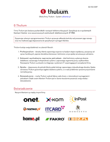 02/03/2017 Oferta firmy Thulium - System callcenter.pl O Thulium Firma Thulium jest dostawcą a u tor s k ich rozwiązań telekomunikacyjnych. Specjalizuje się w s y s te m a ch Con ta ct Ce n te r oraz zaawansowanych ce n tr a l a ch te l e fon icz n y ch I P PB X . Dysponując własnym oprogramowaniem Thulium sprawuje całkowitą kontrolę nad procesem jego rozwoju oraz ma możliwość jego dopasowania do specyficznych wymagań klientów. Thulium buduje swoją działalność na czterech filarach: 1. Pr ofe s jon a l iz m - doradcy klienta zapewniają wsparcie na każdym etapie współpracy, począwszy od spraw handlowych, poprzez doradztwo biznesowe i techniczne, aż po opiekę serwisową po wdrożeniu. 2. G otow oś ć w y ch od z e n ia n a p r z e ciw p otr z e b om - dział techniczny wykonuje zlecenia dodatkowe, rozszerzając funkcjonalność systemu i poprawiając ergonomię pracy użytkowników. Rozwiązania Thulium są otwarte na integrację z systemami IT wspomagającymi zarządzanie firmą. 3. O p ie k a – dopasowany do potrzeb klienta pakiet obsługi, zapewniający indywidualnego doradcę. Opieka serwisowa Thulium gwarantuje ciągłość działania systemu, a w razie problemów sprawne przywrócenie normalnej pracy. 4. D oś w ia d cz e n ie – markę Thulium wybrali liderzy wielu branż, z różnorodnymi wymaganiami i potrzebami. Dzięki swoim klientom Thulium jest w stanie nieustannie poszerzać swoją wiedzę i doświadczenie. Doświadczenie Naszymi klientami są między innymi firmy Wycena wybranego pakietu C e na\ P ak i e t P ak i e t P o dst aw o w y P ak i e t Opt y m al ny P ak i e t R o z sz e rz o ny Cena jednostkowa bez rabatu 99 zł netto 119 zł netto 169 zł netto Miesięczna cena pakietu 15 licencji 1335 zł netto 1605 zł netto 2280 zł netto W tym rabat 150 zł netto (10%) 180 zł netto (10%) 255 zł netto (10%) Porównanie Pakietów Pakiet po dstawo wy Ka m p a n ie i k ol e jk i Moduł Centrali Moduł Infolinii Moduł Kampanii IVR Preview dialer Progressive dialer Nagrywanie rozmów Czat Ocena rozmów Predictive dialer Oddzwanianie Call blending Funkcja nieobecności w Centrali Zaawansowane funkcje IVR Wykrywanie fax i sekretarek Z a r z ą d z a n ie k l ie n ta m i CC CRM i pełna historia kontaktu Wysyłanie e-mail i SMS* He l p D e s k Obsługa zgłoszeń e-mail i SMS* Z a r z ą d z a n ie a g e n ta m i Zrzuty ekranów agentów A PI Dostęp do API W s p a r cie s e r w is ow e Wsparcie e-mailowe i telefoniczne 8-16 Wsparcie w sytuacjach krytycznych 8-21 Pakiet o ptymalny Pakiet r o z sz er z o ny Opis funkcjonalności Ka m p a n ie i k ol e jk i Moduł Centrali Zarządzanie użytkownikami, uprawnieniami, numerami wewnętrznymi, kontami SIP Provisioning wybranych telefonów IP Obsługa połączeń, transfer połączeń Routing połączeń Moduł Infolinii Kolejkowanie połączeń oczekujących w ramach kolejek Zarządzanie kolejkami (dodawania, usuwanie, ustawiania dostępnych parametrów) Przydzielanie agentów do kolejek z priorytetami Różne polityki dystrybucji rozmów Obsługa komunikatów do kolejek: w czasie oczekiwania, w godzinach pracy/p poza godzinami Godziny pracy kolejek Raporty kolejek, konsultantów w kolejkach Moduł Kampanii Zarządzanie kampaniami wychodzącymi (dodawanie, klonowanie, edycja) Import bazy z pliku CSV Definiowanie parametrów kampanii takich jak: termin rozpoczęcia/zakończenia kampanii, wybór dialera, statusy kampanii, statusy automatyczne, Interwał czasu dla kolejnych połączeń, struktura rekordów bazy danych. Przydzielanie agentów do kampanii Raporty kampanii IVR Możliwość dynamicznego zarządzania IVR – dodawanie, usuwanie, aktywowanie/ deaktywowanie poszczególnych gałęzi. Możliwe wgranie komunikatów głosowych IVR Raporty z drzewa IVR. Preview dialer Konsultantowi prezentowany jest ekran z danymi klienta. Po zapoznaniu się z danymi klienta konsultant klika “Połącz”, a dialer wybiera numer klienta i łączy go z konsultantem. Najczęściej dialery Preview umożliwiają zdefiniowanie maksymalnego czasu, jaki konsultant ma na zapoznanie się z danymi klienta, po upływie tego czasu połączenie jest zestawiane automatycznie. Progressive dialer Dialer wybiera numer klienta i łączy go z konsultantem. W trakcie wybierania numeru konsultantowi prezentowany jest ekran z danymi klienta. Dla standardowych akcji typu: klient nie odbiera, błędny numer telefonu, itp. można zdefiniować status kontaktu, który zostanie ustawiony automatycznie. Progressive Dialer pozwala zdefiniować maksymalny czas, jaki konsultant ma na wprowadzenie notatki i ustawienie statusu kontaktu. Po tym czasie konsultant otrzymuje kolejne połączenie. Nagrywanie rozmów Nagrywanie rozmów zalogowanych konsultantów z możliwością ich odszukania przez www po wielu kryteriach takich jak: agent, data, numer telefonu, data połączenia, długość nagrania Nagrania do formatu WAV, Ogg lub MP3 Dostęp do nagranych rozmów przez WWW Możliwość wyszukiwania nagrań według zadanych kryteriów 20 GB przestrzeni na przechowywanie nagrań w standardzie Czat Komponent na stronę www. Predefiniowane przywitanie typu: Dzień dobry, masz pytanie? Porozmawiaj z nami. Możliwość wyboru tematu rozmowy przez klienta Kolejki czatowe, priorytet kolejki Priorytet konsultana w kolejce czat Historia czatu w karcie klienta Transfer czatu do innych konsultantów Ocena rozmów Ocenianie nagranych rozmów (widoczne na liście rozmów oraz w karcie klienta) Komentarz do nagrania Predictive dialer Dialer stara się przewidzieć ilu konsultantów będzie dostępnych w najbliższym czasie. Dialer prowadzi również statystykę odbieralności połączeń – ile połączeń jest odbieranych, ile zajętych lub nikt nie odbiera, ile numerów jest błędnych. Na podstawie odbieralności połączeń oraz przewidywanej ilości dostępnych konsultantów dialer stara się zestawić tyle połączeń, aby na każdego wolnego konsultanta przypadło jed