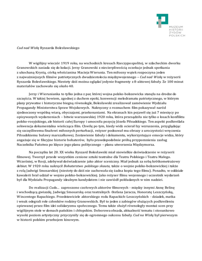 Cud nad Wisłą Ryszarda Bolesławskiego W wigilijny wieczór 1919 roku, na wschodnich kresach Rzeczypospolitej, w szlacheckim dworku Granowskich zasiada się do kolacji. Jerzy Granowski z niecierpliwością oczekuje jednak spotkania z ukochaną Krystą, córką włościanina Macieja Wierunia. Ten miłosny wątek rozpoczyna jeden z najważniejszych filmów patriotycznych dwudziestolecia międzywojennego – Cud nad Wisłą w reżyserii Ryszarda Bolesławskiego. Niestety dziś można oglądać jedynie fragmenty z 8-aktowej fabuły. Ze 100 minut materiałów zachowało się około 40. Jerzy i Wierunianka to tylko jedna z par, której wojna polsko-bolszewicka stanęła na drodze do szczęścia. W takiej bowiem, zgodnej z duchem epoki, konwencji melodramatu patriotycznego, w którym plany prywatne i historyczne biegną równolegle, Bolesławski zrealizował zamówienie Wydziału Propagandy Ministerstwa Spraw Wojskowych. Nakręcony z rozmachem film pokazywał naród zjednoczony wspólną wiarą, obyczajami, przekonaniami. Na ekranach kin pojawił się już 7 miesięcy po opisywanych wydarzeniach – bitwie warszawskiej 1920 roku, która przesądziła nie tylko o losach konfliktu polsko-rosyjskiego, ale historii całej Europy i umocniła pozycję Józefa Piłsudskiego. Ten aspekt podkreślała sekwencja dokumentalna wieńcząca film. Chwilę po tym, kiedy widz ocierał łzy wzruszenia, przyglądając się szczęśliwemu finałowi miłosnych perturbacji, reżyser podsuwał mu obrazy z uroczystości wręczenia Piłsudskiemu buławy marszałkowej. Zestawienie fabuły i dokumentu, wykorzystujące emocje widza, który angażuje się w fikcyjne historie bohaterów, było prawdopodobnie próbą przypomnienia zasług Naczelnika Państwa po klęsce jego planu politycznego – planu utworzenia Międzymorza. Na początku lat 20. XX wieku Ryszard Bolesławski miał niewielkie doświadczenie w reżyserii filmowej. Tworzył przede wszystkim cenione sztuki teatralne dla Teatru Polskiego i Teatru Małego. Wcześniej, w Rosji, zdobywał doświadczenie jako aktor sceniczny. Miał jednak za sobą krótkometrażowy debiut. W 1920 roku nakręcił Bohaterstwo polskiego skauta, także o wojnie polsko-bolszewickiej i także z rolą Jadwigi Smosarskiej (niestety do dziś nie zachowała się żadna kopia tego filmu). Ponadto, w oddziale kawalerii brał udział w wojnie polsko-bolszewickiej. Jako reżyser filmu wojennego i uczestnik wydarzeń był dla Wydziału Propagandy idealnym kandydatem i nie zawiódł pokładanych w nim nadziei. Do realizacji Cudu… zaproszono czołowych aktorów filmowych - między innymi Annę Belinę i wschodzącą gwiazdę, Jadwigę Smosarską oraz teatralnych -Stefana Jaracza, Honoratę Leszczyńską, Wincentego Rapackiego. Przedstawiciele aktorskiego rodu Rapackich-Leszczyńskich - dziadek, matka i wnuk odegrali role członków rodziny Granowskich. Był to jeden z zabiegów służących podkreśleniu opiewanej przez film idei solidaryzmu społecznego. Temu także służył równoległy montaż scen przy wigilijnym stole w domach pańskim i chłopskim. Doborowa obsada, aktualność tematu i stosunkowo wysoki poziom artystyczny przyczyniły się do ogromnego sukcesu fabuły. Cud na Wisłą był pierwszym w historii polskim przebojem kinowym. Jeszcze przed premierą Cudu… Bolesławski wyjechał jednak z kraju. Prawdopodobnie przed wyjazdem nie widział nawet jego ostatecznej wersji. Nie potrafił odnaleźć się w warszawskim środowisku filmowym. Przez Berlin i Paryż dotarł do Hollywood, gdzie kręcił kasowe przeboje z Gretą Garbo, Marleną Dietrich i Clarkiem Gable’em. Jego tworzone za oceanem filmy zyskały miano kina artystycznego dla koneserów, zaś kadry z Cudu wciąż wykorzystywane jako quasi-dokument z bitwy warszawskiej. Opublikował także popularny do dziś podręcznik – Lekcje gry aktorskiej. Zmarł na zawał serca u szczytu zdolności twórczych w 1937 roku.