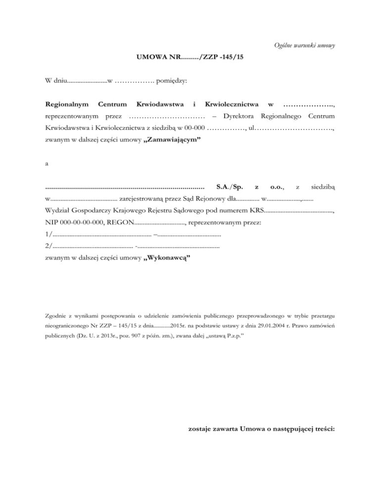 Ogólne warunki umowy UMOWA NR........./ZZP -145/15 W dniu........................w ……………. pomiędzy: Regionalnym Centrum Krwiodawstwa i Krwiolecznictwa w ……………….., reprezentowanym przez ………………………… – Dyrektora Regionalnego Centrum Krwiodawstwa i Krwiolecznictwa z siedzibą w 00-000 ……………, ul…………………………., zwanym w dalszej części umowy ,,Zamawiającym” a ................................................................................ S.A./Sp. z o.o., z siedzibą w........................................ zarejestrowaną przez Sąd Rejonowy dla.............. w....................,....... Wydział Gospodarczy Krajowego Rejestru Sądowego pod numerem KRS........................................., NIP 000-00-00-000, REGON.............................., reprezentowanym przez: 1/........................................................... –...................................... 2/................................................ -................................................. zwanym w dalszej części umowy ,,Wykonawcą” Zgodnie z wynikami postępowania o udzielenie zamówienia publicznego przeprowadzonego w trybie przetargu nieograniczonego Nr ZZP – 145/15 z dnia............2015r. na podstawie ustawy z dnia 29.01.2004 r. Prawo zamówień publicznych (Dz. U. z 2013r., poz. 907 z późn. zm.), zwana dalej „ustawą P.z.p.” zostaje zawarta Umowa o następującej treści: § 1. PRZEDMIOT UMOWY 1. Przedmiotem umowy jest przeprowadzenie badania sprawozdania finansowego Zamawiającego za rok 2015 sporządzonego na dzień 31.12.2015r. zgodnie z ustawą z dnia 29 września 1994 roku o rachunkowości (Dz. U. z 2013r., poz.330, z późn.zm.) w celu wydania opinii o prawidłowości i rzetelności przedstawionych w sprawozdaniu finansowym informacji istotnych dla oceny wyników działalności gospodarczej, wyniku finansowego oraz sytuacji majątkowej i finansowej Zamawiającego. Dokonanie oceny zgodności sprawozdania finansowego z wymagającymi zastosowania zasadami rachunkowości oraz oceny prawidłowości prowadzonych ksiąg rachunkowych. 2. Przedmiot umowy zawiera: 2.1. Badanie wstępne: zapoznanie się z jednostką, ewidencją księgową, kontrolą wewnętrzną oraz metodami wyceny składników majątku 2.2. Badanie podstawowe: bezpośredni udział biegłego rewidenta w przeprowadzanej przez Zamawiającego inwentaryzacji, w związku ze sporządzaniem sprawozdania finansowego za 2015r., dokonanie przeglądu i analizy istotnych pozycji sprawozdania, a także udokumentowanie danych zawartych w sprawozdaniu finansowym, opracowanie raportu z badania zgodnie z normami Krajowej Rady Biegłych Rewidentów. Wydanie niezależnej opinii biegłego rewidenta dotyczącej wyników finansowych osiągniętych przez Zamawiającego 3. Badanie zostanie przeprowadzone stosownie do: 3.1. Przepisów rozdziału 7 ustawy z dnia 29 września 1994roku o rachunkowości (Dz. U. z 2013r., poz. 330 z późn. zm.) 3.2. Ustawy z dnia 30 sierpnia 1991r. o zakładach opieki zdrowotnej (Dz. U. z 2007r. Nr 14, poz. 89, z późn. zm.), 3.3. Ustawy z dnia 15 kwietnia 2011r. o działalności leczniczej (Dz. U. 2015r., poz.618 z późn. zm.). 3.4. Właściwych przepisów rozdziału 6 ustawy z dnia 7 maja 2009 r o biegłych rewidentach i ich samorządzie, podmiotach uprawnionych do badania sprawozdań finansowych oraz nadzorze publicznym (Dz. U. z 2009r. Nr 77, poz.649 z późn. zm.) 3.5. Krajowego standardu rewizji finansowej nr 1 do uchwały z d 16 lutego 2010r. Krajowej Rady Biegłych Rewidentów i stosowania niektórych postanowień międzynarodowych standardów rewizji finansowej IFAC. 2 4. Celem badania sprawozdania finansowego jest wyrażenie przez biegłego rewidenta pisemnej opinii wraz z raportem o tym, czy sprawozdanie finansowe jest zgodne z wymagającymi zastosowania zasadami (polityką) rachunkowości oraz czy rzetelnie i jasno przedstawia sytuację majątkową i finansową, jak też wynik finansowy Zamawiającego 5. W ramach badania określonego w pkt. 1 § 1 Wykonawca dokona sprawdzenia prawidłowości rozliczeń z budżetem tylko w takim zakresie, jaki jest niezbędny do osiągnięcia celu badania. § 2. WARTOŚĆ PRZEDMIOTU UMOWY 1. Strony ustalają, iż wartość umowy, wyniesie brutto.…………………………................ PLN (słownie:..............................................................). 2. Wartość umowy, o której mowa w ust. 1 w sposób jednoznaczny obejmuje wszelkie koszty i obciążenia powstające w wyniku realizacji przedmiotu zamówienia w tym podatek VAT(.......%). § 3. WARUNKI PŁATNOŚCI 1. Płatność będzie zrealizowana w PLN, po dostarczeniu Zamawiającemu przez Wykonawcę opinii wraz z raportem z badania sprawozdania finansowego, faktury VAT i podpisanego oryginału Protokołu Zdawczo-Odbiorczego (wzór Protokołu stanowi Załącznik nr 1 do Umowy), w terminie …….... od daty doręczenia, na rachunek bankowy wskazany na fakturze. 2. Za termin zapłaty faktury przyjmuje się datę złożenia w banku Zamawiającego dyspozycji zapłaty. 3. Koszty obsługi bankowej powstałe w banku Zamawiającego pokrywa Zamawiający, koszty obsługi powstałe poza bankiem Zamawiającego pokrywa Wykonawca. 4. Cena jednostkowa netto nie podlega zmianie przez cały czas trwania umowy. 5. W przypadku stwierdzenia przez Zamawiającego braku realizacji obowiązków, o których mowa w § 6 ust.1 i § 6 ust. 7 umowy, Zamawiający nie dokona płatności, o czym powiadomi pisemnie Wykonawcę. 3 § 4. TERMIN REALIZACJI ZAMÓWIENIA 1. Wykonawca zobowiązany jest zrealizować przedmiot Umowy do 10 maja 2016 roku. 2. Wykonawca zobowiązuje się przekazać przedmiot zamówienia do Zamawiającego na podstawie Protokołu Zdawczo–Odbiorczego, podpisanego przez upoważnionych pracowników Zamawiającego i Wykonawcy, sporządzonego u Wykonawcy. § 5. OBOWIĄZKI ZAMAWIAJĄCEGO 1. Przekazanie Wykonawcy harmonogramu prac związanych ze sp