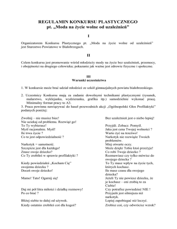 REGULAMIN KONKURSU PLASTYCZNEGO pt. „Moda na życie wolne od uzależnień” I Organizatorem Konkursu Plastycznego pt. „Moda na życie wolne od uzależnień” jest Starostwo Powiatowe w Białobrzegach. II Celem konkursu jest promowanie wśród młodzieży mody na życie bez uzależnień, przemocy, i obojętności na drugiego człowieka; pokazanie jak ważne jest zdrowie fizyczne i społeczne. III Warunki uczestnictwa 1. W konkursie może brać udział młodzież ze szkół gimnazjalnych powiatu białobrzeskiego. 2. Uczestnicy Konkursu mają za zadanie dowolnymi technikami plastycznymi (rysunek, malarstwo, wyklejanka, wydzieranka, grafika itp.) samodzielnie wykonać pracę. Minimalny format pracy to A3. 3. Praca powinna nawiązywać do haseł przewodnich akcji „Ogólnopolski Głos Profilaktyki” podanych poniżej: Zwolnij – nie musisz biec! Nie uciekaj od problemu. Rozwiąż go! To Ty wybierasz! Myśl racjonalnie. Myśl! Ile trwa życie ? Co to jest odpowiedzialność ? Narkotyk = samotność. Szczęście jest dla każdego! Znasz swoje dziecko? Co Ty zrobiłeś w sprawie profilaktyki ? Kiedy powiedziałeś „Kocham Cię” swojemu dziecku ? Doceń swoje dziecko! Mamo! Tato! Ogarnij się! Daj mi pół litra miłości i działkę rozmowy! Po co brać ? Bliżej siebie to dalej od używek. Kiedy ostatnio zrobiłeś coś dla kogoś? Bez uzależnień jest o niebo lepiej! Przyjdź. Zobacz. Pomyśl. Jaka jest cena Twojej wolności ? Warto żyć na trzeźwo! Narkotyk nie rozwiąże Twoich problemów. Miej otwarte oczy. Może dzięki Tobie ktoś przeżyje! Co robi Twoje dziecko ? Rozmawiasz czy tylko mówisz do swojego dziecka ? To Ty masz wpływ na życie tych, których kochasz. Ile masz czasu dla swojego dziecka? Jeżeli Ty nie powiesz dziecku, że je kochasz – oni zrobią to za Ciebie! Czy potrafisz powiedzieć NIE ! Przyjaźń jest silniejsza niż narkotyk. Lepiej zapobiegać niż leczyć. Zrobisz coś, czy odwrócisz wzrok? Podaj dalej dobrą wiadomość! Myśl na trzeźwo! Życie masz tylko jedno! Baw się z kumplami, nie z narkotykami! Gdzie jest teraz Twoje dziecko? Nie krzycz, przytul! Dołącz, poczuj, podaj dalej! Miałeś kontakt z dopalaczem? Dziś jest właśnie taka noc kiedy warto wszystko przemyśleć. Jesteś potrzebny! Możesz wzruszać! Pomóż zwyciężyć innym! Reaguj, wspieraj, rozmawiaj. Zawsze jest nadzieja. Uwolnij serce! Bez narkotyków i dopalaczy. Życie bez uzależnień! Żyj bez przemocy! Staraj się pomagać innym! Co jest najważniejsze? A co będzie dalej? Piwo, fajki i narkotyki to złe nawyki! Życie nie po to jest by brać! Czy znasz kumpli swoich dzieci? Uśmiechnij się! Miałeś kontakt z narkotykiem? A jak nie przestaniesz? Jesteś po to aby żyć! Możesz kochać! Możesz odkrywać! Nie żyj wirtualnie! Masz szansę! Wygraj życie! Nie rezygnuj z marzeń! Żyj wolny! Moda na życie! Trzeźwy świat! Żyj bez agresji! To Ty! Ty wybierasz 4. Szkoła może zgłosić dowolną ilość wykonanych prac, jednak autorem zgłoszonej pracy może być tylko 1 osoba. 5. Warunkiem zakwalifikowania pracy do Konkursu jest jej dostarczenie wraz z prawidłowo wypełnioną i podpisaną kartą zgłoszenia, którą należy nakleić na odwrocie pracy konkursowej (załącznik do Regulaminu). IV Termin i warunki dostarczenia prac 1. Termin dostarczenia prac upływa dnia 27 maja 2015 r. Prace należy dostarczyć bezpośrednio do Wydziału Edukacji, Zdrowia, Kultury i Sportu Starostwa Powiatowego (II piętro, pokój nr 25), Pl. Zygmunta Starego 9, 26 - 800 Białobrzegi. 2. Prace dostarczone po terminie nie będą oceniane. 3. Organizator nie zwraca dostarczonych prac. V Zasady przyznawania nagród 1. Rozstrzygnięcie Konkursu nastąpi w dniu 28 maja 2015 r., wyniki zostaną podane na stronie internetowej Organizatora: www.bialobrzegipowiat.pl w zakładce Aktualności oraz wysłane do mediów lokalnych z poszanowaniem ochrony dóbr osobistych dziecka. 2. O wyłonieniu zwycięzców Konkursu decyduje powołana przez Organizatora Komisja Konkursowa. 3. Decyzje Komisji są ostateczne i nieodwołalne. 4. Prace niespełniające warunków regulaminowych nie będą oceniane przez Komisję. 5. Spośród zakwalifikowanych prac Komisja wybierze dziesięć prac. 6. Autorzy trzech najlepszych prac otrzymają nagrody rzeczowe i dyplomy, pozostali uczestnicy dyplomy. 7. Szkoły do których uczęszczają autorzy zwycięskich prac zostaną powiadomione telefonicznie. 8. Nagrody zostaną wręczone na podsumowaniu akcji „Ogólnopolski Głos Profilaktyki”, które odbędzie się w dniu 1 czerwca 2015 r. w Hali sportowej przy ul. Reymonta 13A w Białobrzegach. 9. Regulamin wraz ze wzorem karty zgłoszeniowej i zgody na upublicznianie danych, zamieszczony jest na stronie internetowej Organizatora www.bialobrzegipowiat.pl w zakładce Aktualności. IV Ustalenia dodatkowe 1. Autorzy prac przenoszą na Organizatora nieograniczone prawa autorskie do swoich prac. W tym celu autor pracy składa stosowne oświadczenie, podpisane również przez rodzica lub opiekuna prawnego, zamieszczone w karcie zgłoszeniowej. 2. Organizator zastrzega sobie prawo do wykorzystania w materiałach edukacyjnych, informacyjnych i promocyjnych wszystkich prac dostarczonych na Konkurs. 3. Niniejszy regulamin jest jedynym dokumentem określającym zasady Konkursu. 4. Wszelkie sprawy nieuregulowane niniejszym regulaminem rozstrzyga Organizator.