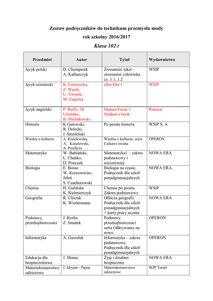 Zestaw podręczników do technikum przemysłu mody rok szkolny 2016/2017 Klasa 102 t Przedmiot Autor Język polski D. Chemperek A. Kalbarczyk Język niemiecki K. Łuniewska, Z. Wąsik, U. Tworek, M. Zagórna Język angielski Historia Wiedza o kulturze Matematyka Biologia Chemia Geografia Tytuł Wydawnictwo Zrozumieć tekst – zrozumieć człowieka cz. 1.1, 1.2 alles klar 1 WSIP P. Reilly, M. Umińska, B. Michałowski K.Gutowski, R. Dolecki, J. Smoleński Matura Focus 1 Student`s book Pearson Po prostu historia WSiP S. A. A. Kisielewska, A. Kisielewski, A. Prochyra Wiedza o kulturze, seria Ciekawi świata OPERON Matematyka1 – zakres podstawowy i rozszerzony Biologia na czasie. Podręcznik dla szkół ponadgimnazjalnych NOWA ERA Chemia po prostu. Zakres podstawowy Oblicza geografii. Podręcznik dla szkół ponadgimnazjalnych + karty pracy ucznia Podstawy przedsiębiorczości seria Odkrywamy na nowo Informatyka – zakres podstawowy. Podręcznik dla szkół ponadgimnazjalnych Żyję i działam bezpiecznie WSiP W. Babiański, L. Chańko, D. Ponczek E. Bonar W. KrzeszowiecJeleń S. Czachorowski H. Gulińska K. Kuśmierczyk R. Uliszak K. Wiedermann Podstawy przedsiębiorczości J. Korba Z. Smutek Informatyka A. Gawełek Edukacja dla J. Słoma bezpieczeństwa Materiałoznawstwo J. Idryjan - Pajon odzieżowe Materiałoznawstwo odzieżowe WSiP NOWA ERA NOWA ERA OPERON OPERON NOWA ERA SOP Toruń Technologia wytwarzania odzieży M. Bily- Czopowa, K. Mierowska Krój i modelowanie odzieży lekkiej WSiP E. Stark B. Tymolewska Modelowanie form odzieży damskiej Projektowanie i stylizacja ubiorów E. FiałkowskaRękawek STOWARZYSZENIE OŚWIATOWCÓW POLSKICH Podstawy projektowania odzieży WSiP I. UlawskaBryszewska, M. Czurkowa H. Czyżewska Konstrukcja i modelowanie form odzieży Bezpieczeństwo i higiena pracy Wykonywanie Z.Lipke-Skrawek wyrobów odzieżowych Wychowanie T. Król, M. Ryś do życia w rodzinie Religia ks. T. Śmiech, E. Kondrak Rysunek zawodowy do szkół odzieżowych Krawiectwo podręcznik technologii WSiP WSiP Techniki szycia. Wędrując ku dorosłości Na drodze do dojrzałej wiary RUBIKON JEDNOŚĆ UWAGA: ZAKUP PODRĘCZNIKA DO NAUCZANIA JĘZYKÓW OBCYCH PO UZGODNIENIU GRUPY JĘZYKOWEJ