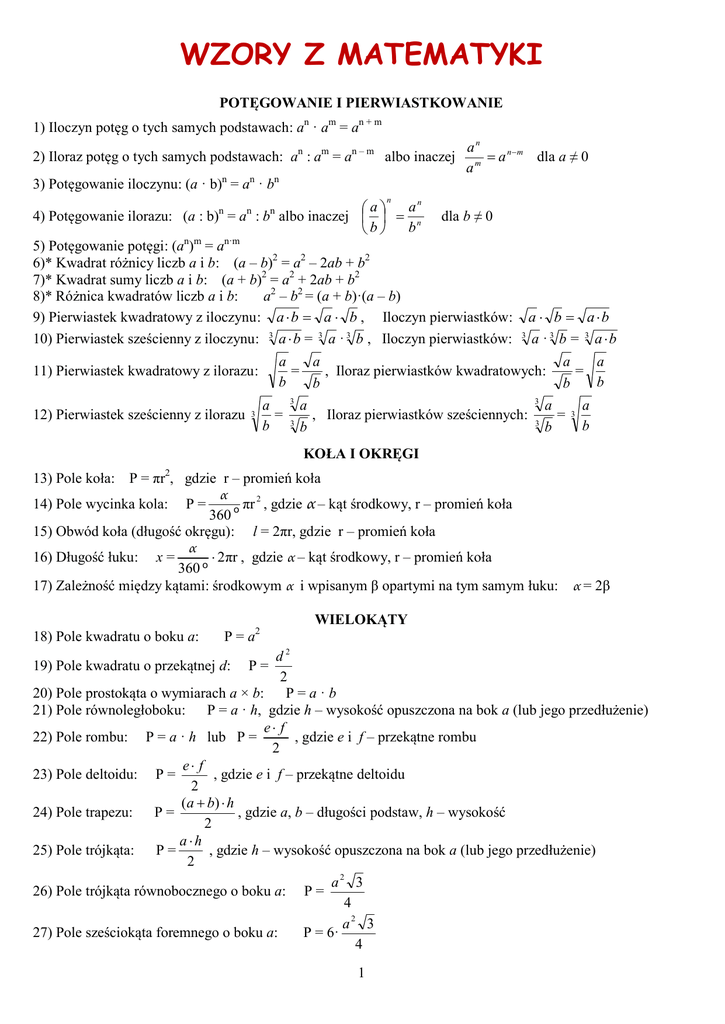 WZORY Z MATEMATYKI POTĘGOWANIE I PIERWIASTKOWANIE 1) Iloczyn potęg o tych samych podstawach: an · am = an + m n m n–m 2) Iloraz potęg o tych samych podstawach: a : a = a 3) Potęgowanie iloczynu: (a · b)n = an · bn an albo inaczej m a nm dla a ≠ 0 a n an a 4) Potęgowanie ilorazu: (a : b) = a : b albo inaczej n dla b ≠ 0 b b n m n·m 5) Potęgowanie potęgi: (a ) = a 6)* Kwadrat różnicy liczb a i b: (a – b)2 = a2 – 2ab + b2 7)* Kwadrat sumy liczb a i b: (a + b)2 = a2 + 2ab + b2 8)* Różnica kwadratów liczb a i b: a2 – b2 = (a + b)·(a – b) 9) Pierwiastek kwadratowy z iloczynu: a b a b , Iloczyn pierwiastków: 10) Pierwiastek sześcienny z iloczynu: 3 a b = 3 a · 3 b , Iloczyn pierwiastków: n n n 3 a b a b a · 3 b = 3 a b a a = , Iloraz pierwiastków kwadratowych: b b 11) Pierwiastek kwadratowy z ilorazu: 12) Pierwiastek sześcienny z ilorazu 3 a = b 3 3 a , Iloraz pierwiastków sześciennych: b 3 3 a a = b b a = b 3 a b KOŁA I OKRĘGI 2 13) Pole koła: P = πr , gdzie r – promień koła α πr 2 , gdzie α – kąt środkowy, r – promień koła 14) Pole wycinka kola: P = 360 o 15) Obwód koła (długość okręgu): l = 2πr, gdzie r – promień koła α 2πr , gdzie α – kąt środkowy, r – promień koła 16) Długość łuku: x = 360 o 17) Zależność między kątami: środkowym α i wpisanym β opartymi na tym samym łuku: α = 2β 18) Pole kwadratu o boku a: P = a2 WIELOKĄTY d2 2 20) Pole prostokąta o wymiarach a × b: P = a · b 21) Pole równoległoboku: P = a · h, gdzie h – wysokość opuszczona na bok a (lub jego przedłużenie) e f 22) Pole rombu: P = a · h lub P = , gdzie e i f – przekątne rombu 2 e f 23) Pole deltoidu: P = , gdzie e i f – przekątne deltoidu 2 ( a b) h 24) Pole trapezu: P = , gdzie a, b – długości podstaw, h – wysokość 2 ah 25) Pole trójkąta: P = , gdzie h – wysokość opuszczona na bok a (lub jego przedłużenie) 2 a2 3 26) Pole trójkąta równobocznego o boku a: P = 4 a2 3 27) Pole sześciokąta foremnego o boku a: P = 6· 4 19) Pole kwadratu o przekątnej d: P= 1 28) Obwód kwadratu o boku a: Ob = 4a 29) Obwód prostokąta o wymiarach a × b: Ob = 2a + 2b 30) Suma kątów w trójkącie o kątach α, β, γ: α + β + γ = 180 a 3 31) Wysokość trójkąta równobocznego o boku a: h= 2 32) Przekątna w kwadracie o boku a: d = a 2 33) Twierdzenie Pitagorasa: a2 + b2 = c2, gdzie a i b – przyprostokątne, c – przeciwprostokątna 34) Przekątne w sześciokącie foremnym o boku a: dłuższa d1 = 2a, krótsza d2 = a 3 WIELOKĄTY I OKREGI 35) Promień okręgu wpisanego w trójkąt równoboczny o boku a: 36) Promień okręgu wpisanego w kwadrat o boku a: r= r= a 3 6 1 a 2 37) Promień okręgu wpisanego w sześciokąt foremny o boku a: r= a 3 2 38) Promień okręgu opisanego na trójkącie równobocznym o boku a: R = a 2 2 40) Promień okręgu opisanego na sześciokącie foremnym o boku a: 39) Promień okręgu opisanego na kwadracie o boku a: a 3 3 R= 41) Miara kąta wewnętrznego w wielokącie foremnym o n kątach: R=a α n (n 3) 2 FIGURY PRZESTRZENNE ( n 2 ) 180 n 42) Liczba przekątnych w wielokącie o n bokach: lp = 43) Objętość sześcianu o krawędzi a: V = a3 44) Objętość prostopadłościanu o wymiarach a × b × c: V = a·b·c 45) Objętość dowolnego graniastosłupa: V = Pp · H. gdzie Pp – pole podstawy, H – wysokość graniastosłupa 45’) Objętość graniastosłupa prawidłowego trójkątnego o krawędzi podstawy a i wysokości graniastosłupa H: a2 3 V= ·H 4 1 46) Objętość dowolnego ostrosłupa: V = Pp · H. gdzie Pp – pole podstawy, H – wysokość ostrosłupa 3 46’) Objętość ostrosłupa prawidłowego czworokątnego o krawędzi podstawy a i wysokości ostrosłupa H: 1 V = a2 · H 3 47) Objętość walca: V = πr2·H 1 48) Objętość stożka: V = πr2·H 3 49) Pole powierzchni całkowitej czworościanu foremnego o krawędzi a: Pc = a 2 3 50) Pole powierzchni całkowitej sześcianu o krawędzi a: Pc = 6a 2 51) Pole powierzchni całkowitej prostopadłościanu o wymiarach a × b × c: P = 2ab + 2ac + 2bc 52) Pole powierzchni całkowitej dowolnego graniastosłupa: Pc = 2Pp + Pb, gdzie Pp – pole podstawy, Pb – pole powierzchni bocznej 52’) Pole powierzchni całkowitej graniastosłupa prawidłowego czworokątnego o krawędzi podstawy a i wysokości H: Pc = 2a2 + 4aH 53) Pole powierzchni całkowitej dowolnego ostrosłupa: Pc = Pp + Pb, gdzie Pp – pole podstawy, Pb – pole powierzchni bocznej 2 53’) Pole powierzchni całkowitej ostrosłupa prawidłowego sześciokątnego o krawędzi podstawy a ah a2 3 i wysokości H: Pc = 6· + 6· 4 2 54) Pole powierzchni bocznej walca: Pb = 2πrH, gdzie r – promień podstawy, H – wysokość walca 55) Pole powierzchni bocznej stożka: Pb = πrl, gdzie l – tworząca stożka, r – promień podstawy 56) Pole powierzchni całkowitej walca: Pc = 2πr2 + 2πrH, gdzie r – promień podstawy, H – wysokość walca 57) Pole powierzchni całkowitej stożka: Pc = πr2 + πrl 58) Przekątna sześcianu o krawędzi a: p = a 3 59) Przekątna prostopadłościanu o wymiarach a × b × c: p = a 2 b2 c2 4 60) Objętość kuli: V = R 3 , gdzie R – promień kuli 3 61) Pole powierzchni całkowitej kuli: P = 4πR2, gdzie R – promień kuli INNE WZORY 62)* Sześcian różnicy liczb a i b: (a – b)3 = a3 – 3a2b + 3ab2 – b3 63) *Sześcian sumy liczb a i b: (a + b)3 = a3 + 3a2b + 3ab2 + b3 64) *Długość odcinka AB, gdy A = (x1; y1), B = (x2; y2): |AB| = ( x2 x1 ) 2 ( y2 y1 ) 2 65) *Współrzędne wektora AB gdy A = (x1; y1), B = (x2; y2): AB = [ x2 x1 ; y2 y1 ] 1 66) *Objętość stożka ściętego: V = π(R2 + Rr + r2)·H 3 67) *Pole powierzchni bocznej stożka ściętego: Pb = π(R + r)·l a3 2 68) Objętość czworościanu foremnego o krawędzi a: V= 12 69) Wzór ogólny funkcji liniowej: y = ax + b x x y y2 70) *Współrzędne środka S odcinka AB, gdy A = (x1; y1), B = (x2; y2): S = 1 2 ; 1 2 2 * - wzory ponadprogramowe, nieobowiąz