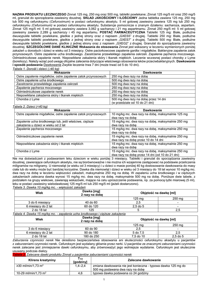 NAZWA PRODUKTU LECZNICZEGO Zinnat 125 mg, 250 mg oraz 500 mg, tabletki powlekane; Zinnat 125 mg/5 ml oraz 250 mg/5 ml, granulat do sporządzania zawiesiny doustnej. SKŁAD JAKOŚCIOWY I ILOŚCIOWY Jedna tabletka zawiera 125 mg, 250 mg lub 500 mg cefuroksymu (Cefuroximum) w postaci cefuroksymu aksetylu. 5 ml gotowej zawiesiny zawiera 125 mg lub 250 mg cefuroksymu (Cefuroximum) w postaci cefuroksymu aksetylu. Substancje pomocnicze o znanym działaniu: sacharoza, aspartam. Zinnat 125 mg/5 ml: 5 ml gotowej zawiesiny zawiera 3,062 g sacharozy i 21 mg aspartmamu. Zinnat 250 mg/5 ml: 5 ml gotowej zawiesiny zawiera 2,289 g sacharozy i 45 mg aspartamu. POSTAĆ FARMACEUTYCZNA Tabletki 125 mg: Białe, podłużne dwuwypukłe tabletki powlekane, gładkie z jednej strony oraz z napisem „GXES5” z drugiej. Tabletki 250 mg: Białe, podłużne dwuwypukłe tabletki powlekane, gładkie z jednej strony oraz z napisem „GXES7” z drugiej. Tabletki 500 mg: Białe, podłużne dwuwypukłe tabletki powlekane, gładkie z jednej strony oraz z napisem „GXEG2” z drugiej. Granulat do sporządzania zawiesiny doustnej. SZCZEGÓŁOWE DANE KLINICZNE Wskazania do stosowania Zinnat jest wskazany w leczeniu wymienionych poniżej zakażeń u dorosłych i dzieci w wieku od 3 miesięcy. Ostre paciorkowcowe zapalenie gardła i migdałków. Bakteryjne zapalenie zatok przynosowych. Ostre zapalenie ucha środkowego. Zaostrzenie przewlekłego zapalenia oskrzeli. Zapalenie pęcherza moczowego. Odmiedniczkowe zapalenie nerek. Niepowikłane zakażenia skóry i tkanek miękkich. Leczenie wczesnej postaci choroby z Lyme (boreliozy). Należy wziąć pod uwagę oficjalne zalecenia dotyczące właściwego stosowania leków przeciwbakteryjnych. Dawkowanie i sposób podawania Dawkowanie Zwykle leczenie trwa 7 dni (może trwać od 5 do 10 dni). Tabela 1. Dorośli i dzieci (40 kg) Wskazanie Dawkowanie Ostre zapalenie migdałków, ostre zapalenie zatok przynosowych 250 mg dwa razy na dobę Ostre zapalenie ucha środkowego 500 mg dwa razy na dobę Zaostrzenie przewlekłego zapalenia oskrzeli 500 mg dwa razy na dobę Zapalenie pęcherza moczowego 250 mg dwa razy na dobę Odmiedniczkowe zapalenie nerek 250 mg dwa razy na dobę Niepowikłane zakażenia skóry i tkanek miękkich 250 mg dwa razy na dobę Choroba z Lyme 500 mg dwa razy na dobę przez 14 dni (w przedziale od 10 do 21 dni) Tabela 2. Dzieci (<40 kg) Wskazanie Dawkowanie Ostre zapalenie migdałków, ostre zapalenie zatok przynosowych 10 mg/kg mc. dwa razy na dobę, maksymalnie 125 mg dwa razy na dobę Zapalenie ucha środkowego lub, jeśli właściwe, cięższe 15 mg/kg mc. dwa razy na dobę, maksymalnie 250 mg zakażenia u dzieci w wieku od 2 lat dwa razy na dobę Zapalenie pęcherza moczowego 15 mg/kg mc. dwa razy na dobę, maksymalnie 250 mg dwa razy na dobę Odmiedniczkowe zapalenie nerek 15 mg/kg mc. dwa razy na dobę, maksymalnie 250 mg dwa razy na dobę przez 10 do 14 dni Niepowikłane zakażenia skóry i tkanek miękkich 15 mg/kg mc. dwa razy na dobę, maksymalnie 250 mg dwa razy na dobę Choroba z Lyme 15 mg/kg mc. dwa razy na dobę, maksymalnie 250 mg dwa razy na dobę przez 14 dni (od 10 do 21 dni) Nie ma doświadczeń z podawaniem leku dzieciom w wieku poniżej 3 miesięcy. Tabletki i granulat do sporządzania zawiesiny doustnej, zawierające cefuroksym aksetylu, nie są biorównoważne i nie można ich wzajemnie zastępować na podstawie przeliczenia miligramów na miligramy. U niemowląt (w wieku od 3 miesięcy) i u dzieci o masie poniżej 40 kg dostosowanie dawkowania do masy ciała lub do wieku może być bardziej korzystne. Dawka dla niemowląt i dzieci w wieku od 3 miesięcy do 18 lat wynosi 10 mg/kg mc. dwa razy na dobę w leczeniu większości zakażeń, maksymalnie 250 mg na dobę. W zapaleniu ucha środkowego i w cięższych zakażeniach zalecana dawka wynosi 15 mg/kg mc. dwa razy na dobę, maksymalnie 500 mg na dobę. Poniższe dwie tabele, z podziałem na grupy wiekowe, zawierają wskazówki, mające na celu uproszczenie podawania, np. za pomocą łyżki miarowej (5 ml), leku w postaci zawiesiny wielodawkowej 125 mg/5 ml lub 250 mg/5 ml (jeżeli dostarczono). Tabela 3. Dawka 10 mg/kg mc. - większość zakażeń Dawka [mg] Wiek Objętość na dawkę [ml] 2 razy na dobę 125 mg 250 mg 3 do 6 miesięcy 40 do 60 2,5 6 miesięcy do 2 lat 60 do 120 2,5 do 5 2 do 18 lat 125 5 2,5 Tabela 4. Dawka 15 mg/kg mc. - zapalenie ucha środkowego i cięższe zakażenia Dawka [mg] Wiek Objętość na dawkę [ml] 2 razy na dobę 125 mg 250 mg 3 do 6 miesięcy 60 do 90 2,5 6 miesięcy do 2 lat 90 do 180 5 do 7,5 2,5 2 do 18 lat 180 do 250 7,5 do 10 2,5 do 5 Zaburzenia czynności nerek Nie określono bezpieczeństwa stosowania ani skuteczności cefuroksymu aksetylu u pacjentów z zaburzeniami czynności nerek. Cefuroksym jest wydalany głównie przez nerki. U pacjentów ze znacznymi zaburzeniami czynności nerek zalecane jest zmniejszenie dawki cefuroksymu, aby zrównoważyć jego wolniejsze wydalanie. Cefuroksym jest skutecznie usuwany podczas dializy. Tabela 3. Zalecane dawki produktu Zinnat u pacjentów zaburzeniami czynności nerek T1/2 Klirens kreatyniny Zalecane dawkowanie [godziny] 2 ≥30 ml/min/1,73 m 1,4–2,4 zmiana dawkowania nie jest konieczna - typowa dawka 125 mg do 500 mg podawana dwa razy na dobę 10-29 ml/min/1,73 m2 4,6 typowa dawka podawana co 24 godziny 1 <10 ml/min/1,73 m2 Podczas hemodializy 16,8 2–4 typowa dawka podawana co 48 godzin dodatkową, pojedynczą, typową dawkę należy podawać na zakończenie każdej dializy Zaburzenia czynności wątroby Brak danych dotyczących pacjentów z zaburzeniami czynności wątroby. Cefuroksym jest wydalany głównie przez nerki, dlatego uważa się, że występowanie zaburzeń czynności wątroby nie ma wpływu na farmakokinetykę cefuroksymu. Sposób podawania Podanie doustne. Zinnat w postaci tabletek należy przyjmować po posiłku, w celu zapewnienia optymalnego wchłaniania. Tabletek powlekanych Zinnat ni