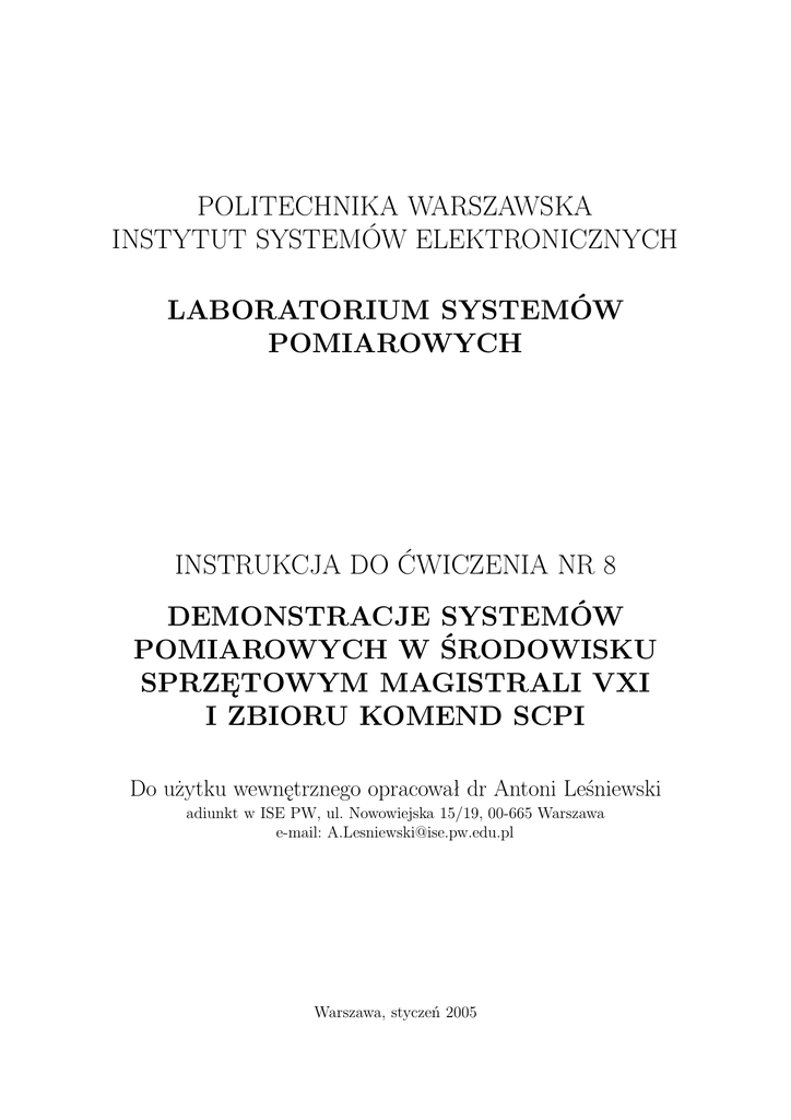 POLITECHNIKA WARSZAWSKA INSTYTUT SYSTEMÓW ELEKTRONICZNYCH LABORATORIUM SYSTEMÓW POMIAROWYCH INSTRUKCJA DO ĆWICZENIA NR 8 DEMONSTRACJE SYSTEMÓW POMIAROWYCH W ŚRODOWISKU SPRZĘTOWYM MAGISTRALI VXI I ZBIORU KOMEND SCPI Do użytku wewnętrznego opracował dr Antoni Leśniewski adiunkt w ISE PW, ul. Nowowiejska 15/19, 00-665 Warszawa e-mail: [email protected] Warszawa, styczeń 2005 1. Cel ćwiczenia Celem ćwiczenia jest pokazanie przydatności graficznego języka VEE1 [AGILENT] w projektowaniu cyfrowego analizatora widma sygnałów kwazistacjonarnych. Przyjmuje się przy tym założenie, że analizator powinien pracować w czasie na bieżąco, a bank analizujących widmo filtrów pasmowych będzie emulowany za pomocą algorytmu FFT. Głównym celem metrologicznym ćwiczenia jest pokazanie, jak należy korzystać ze sterowników przyrządów w rzeczywistych warunkach pomiarowych [WINIECKI ’01], [MIELCZAREK ’99], [HELSEL ’95]. Ćwiczenie jest kontynuacją Ćwiczenia Nr 5 [ĆWICZENIE NR 5]. 2. Opis ćwiczenia W ćwiczeniu wykorzystywane są dwa przyrządy umieszczone w kasecie standardu VXI [IEEE 1155], sterowane poprzez interfejs USB/GPIB z komputera PC. Są to: HP1440 generator sygnału sinusoidalnego, trójkątnego bądź prostokątnego w zakresie częstotliwości do 21 MHz, o programowanej amplitudzie do 10 V, składowej stałej w zakresie ±5 V oraz fazie początkowej w przedziale ±720◦ . HP1410 woltomierz cyfrowy napięcia stałego i zmiennego, omomierz i częstościomierz. Środowisko VEE posiada zbiór obiektów służących do komunikacji z urządzeniami. Znajdują się one w menu I/O. 2.1. Programowe sterowniki przyrządów — — — — Do sterowania przyrządami pomiarowymi służą obiekty czterech typów: sterownik typu Direct I/O (rysunek 1) umożliwiający bezpośrednią komunikację z urządzeniem za pośrednictwem zestawu komend, najczęściej zgodnych ze standardem SCPI (Standard Commands for Programmable Instruments) [SCPI ’94], sterownik typu Plug&play Driver bazujący na zbiorze funkcji zawartych w bibliotece dostarczanej przez producenta urządzenia (zgodnej ze standardową biblioteką VISA (Virtual Instrument Software Architecture)), sterownik typu Panel Driver, dostarczany wraz z VEE, zapewniający sterowanie wszystkimi parametrami przyrządu poprzez panel graficzny, sterownik typu Component Driver umożliwiający projektantowi dostęp do wybranych funkcji (komponentów) przyrządu. gen (hp1440 @ 70911) WRITE TEXT "*IDN?" EOL READ TEXT x STR < Double-Click to Add Transaction > AlphaNumeric HEWLETT-PACKARD,E1440A,0,REV 3.15 x Rysunek 1. Sterownik Direct I/O W przypadku obiektu Direct I/O nie jest potrzebny sterownik programowy przyrządu, natomiast korzystanie z tego obiektu wymaga znajomości komend i sposobu komunikacji z urzadzeniem. Jest to najszybszy, ale też wymagający dużego zasobu wiedzy, sposób programowania przyrządu. Umożliwia dostęp do dowolnych programowalnych parametrów. 1 Visual Engineering Environment 1 Obiekt Plug&play Driver jest sterownikiem programowym zawierającym bibliotekę funkcji służących do sterowania konkretnym przyrządem. Sterownik ten jest dostarczany przez producenta przyrządu. Użycie tego obiektu polega na wywoływaniu odpowiednich standardowych funkcji bibliotecznych. Umożliwia użycie przyrządów dowolnego producenta, szybkość działania jest porównywalna z szybkością obiektu Direct I/O, natomiast jest bardziej uniwersalny, niezależny od platformy sprzętowo-programowej. Obiekt Panel Driver ma postać zbliżoną do płyty czołowej przyrządu pomiarowego. Obiekt ten ukrywa przed użytkownikiem wszystkie szczegóły wymiany danych przez interfejs, wymaga jednak specjalnego sterownika programowego. Sterownik ten zawiera opis graficznej reprezentacji panelu przyrządu oraz definicje komponentów wykonujących operacje oferowane przez urządzenie. Do komponentów możliwy jest dostęp interaktywny za pomocą przycisków i pól wyświetlaczy danych. Dostęp z poziomu programu jest realizowany za pośrednictwem terminali wejściowych i wyjściowych (rysunek 2). Jest to najbardziej naturalny i wygodny dla użytkownika sposób sterowania przyrządem. Real64 Slider gen (hp1440 @ 70911) 500 Reset 1000 900 700 FREQUENCY 500 300 100 Func Freq Ampl Offs Main Sine 500 1 0 Hz Vpp V 0 > deg Phase < 1 Asn 0 Step Fixed Mode Signal OFF Outp AlphaNumeric Error Rysunek 2. Panel Driver Obiekt Component Driver korzysta z tego samego sterownika przyrządu co Panel Driver, jednak tylko w celu dostępu do komponentów (obiekt nie posiada panelu graficznego). Różnica w działaniu tych obiektów polega na tym, że w przypadku obiektu Panel Driver wysyłane są do przyrządu wszystkie rozkazy, które są niezbędne do ustawienia przyrządu w stan odpowiadający graficznemu panelowi sterującemu, natomiast w przypadku obiektu Component Driver programowane są tylko te ustawienia, które odpowiadają terminalom wyjściowym obiektu oraz odczytywane są tylko te komponenty, dla których istnieją terminale wejściowe. Dzięki temu komunikacja za pomocą obiektu Component Driver przebiega szybciej niż poprzez Panel Driver. Poza sterownikami Plug&play, programowe sterowniki przyrządów mogą występować w dowolnej kombinacji. 2.2. Konfiguracja Przed rozpoczęciem pracy z urządzeniem należy dokonać konfiguracji programu VEE. Konfiguracja sterowników rozpoczyna się od wybrania listy przyrządów z głównego menu I/O ⇒ InstrumentManager.... Następnie trzeba wybrać z menu Instrument pozycję Add i wpisać dane przyrządu: Name: nazwę przyrządu, np. generator, 2 Interface: wybrać opcję GPIB, Address: wpisać 70911 (pierwsza cyfra oznacza adres karty interfejsu swobodnego sterownika systemowego (interface select code), dwie następne – adres przyrządu na szynie GPIB – w tym przypadku kasety VXI, a dwie ostatnie określają adres wtórny przyrządu, tzn. adres generatora w kasecie VXI), Gateway: wpisać chopin0 (j