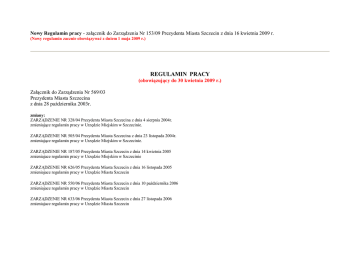 Nowy Regulamin pracy - załącznik do Zarządzenia Nr 153/09 Prezydenta Miasta Szczecin z dnia 16 kwietnia 2009 r. (Nowy regulamin zacznie obowiązywać z dniem 1 maja 2009 r.) REGULAMIN PRACY (obowiązujący do 30 kwietnia 2009 r.) Załącznik do Zarządzenia Nr 569/03 Prezydenta Miasta Szczecina z dnia 28 października 2003r. zmiany: ZARZĄDZENIE NR 328/04 Prezydenta Miasta Szczecina z dnia 4 sierpnia 2004r. zmieniające regulamin pracy w Urzędzie Miejskim w Szczecinie. ZARZĄDZENIE NR 505/04 Prezydenta Miasta Szczecina z dnia 23 listopada 2004r. zmieniające regulamin pracy w Urzędzie Miejskim w Szczecinie. ZARZĄDZENIE NR 187/05 Prezydenta Miasta Szczecin z dnia 14 kwietnia 2005 zmieniajace regulamin pracy w Urzędzie Miejskim w Szczecinie ZARZĄDZENIE NR 626/05 Prezydenta Miasta Szczecin z dnia 16 listopada 2005 zmieniajace regulamin pracy w Urzędzie Miasta Szczecin ZARZĄDZENIE NR 550/06 Prezydenta Miasta Szczecin z dnia 10 października 2006 zmieniajace regulamin pracy w Urzędzie Miasta Szczecin ZARZĄDZENIE NR 633/06 Prezydenta Miasta Szczecin z dnia 27 listopada 2006 zmieniajace regulamin pracy w Urzędzie Miasta Szczecin Spis treści: Rozdział 1 Rozdział 2 Rozdział 3 Rozdział 4 Rozdział 5 Rozdział 6 Rozdział 7 Rozdział 8 Rozdział 9 Rozdział 10 Rozdział 11 Rozdział 12 Rozdział 13 Rozdział 14 Postanowienia ogólne Podstawowe obowiązki pracowników Obowiązki pracodawcy Organizacja pracy Czas pracy Przyjmowanie i obsługa interesantów Urlopy, zwolnienia od pracy, nieobecności w pracy Postanowienia dotyczące bezpieczeństwa i higieny pracy Uprawnienia pracowników związane z rodzicielstwem Wyróżnienia i nagrody Odpowiedzialność porządkowa pracowników Odpowiedzialność materialna pracowników Termin i miejsce wypłaty wynagrodzenia Postanowienia końcowe Załącznik Nr 1 Wzory identyfikatorów imiennych dla pracowników Urzędu Miejskiego oraz Filii Urzędu Miejskiego w Szczecinie Zasady przydzielania pracownikom środków ochrony indywidualnej oraz dostarczania odzieży i obuwia roboczego. I. Tabela norm przydziału środków ochrony indywidualnej oraz odzieży i obuwia roboczego. II. Normy Środków higieny osobistej. III. Zasady wydawania nieodpłatnych profilaktycznych Załącznik Nr 2 Załącznik Nr 3 1 1 3 3 6 7 7 10 11 12 12 14 14 14 Załącznik Nr 4 Załącznik Nr 5 Załącznik Nr 6 Załącznik Nr 7 napojów i posiłków. Zasady przydzielania pracownikom odzieży służbowej. Tabela norm przydziału pracownikom odzieży służbowej. Wykaz prac wzbronionych kobietom. Zasady przydziału pracownikom okularów korygujących wzrok. ROZDZIAŁ 1 POSTANOWIENIA OGÓLNE § 1. Regulamin pracy ustala organizację i porządek w procesie pracy w Urzędzie Miejskim w Szczecinie, zwanym dalej “Urzędem“, w tym rozkład czasu pracy w sposób zapewniający interesantom załatwianie spraw w dogodnym dla nich czasie, oraz związane z tym prawa i obowiązki pracowników i pracodawcy (Urzędu). § 2. 1. Regulamin pracy obowiązuje wszystkich pracowników bez względu na zajmowane stanowisko i wymiar czasu pracy. 2. Regulamin pracy podaje do wiadomości każdego pracownika, przed jego zatrudnieniem, osoba prowadząca sprawy kadrowe w Wydziale Organizacyjnym Urzędu. 3. Fakt zapoznania się z treścią regulaminu pracownik potwierdza w formie pisemnego oświadczenia. § 3. Ilekroć w Regulaminie pracy jest mowa o: 1) pracodawcy - oznacza to Urząd, reprezentowany przez Prezydenta Miasta lub upoważnioną przez niego osobę, 2) pracowniku bez bliższego określenia - oznacza to osobę zatrudnioną w Urzędzie na podstawie wyboru, powołania, mianowania lub umowy o pracę, 3) przepisach bez bliższego określenia - oznacza to przepisy prawa pracy, 4) przepisach wewnętrznych - oznacza to statut Miasta, regulamin organizacyjny Urzędu, zarządzenia Prezydenta Miasta. ROZDZIAŁ 2 PODSTAWOWE OBOWIĄZKI PRACOWNIKÓW § 4. 1. Do podstawowych obowiązków pracownika należy dbałość o wykonywanie zadań publicznych oraz o środki publiczne z uwzględnieniem interesów państwa oraz indywidualnych interesów obywateli, a w szczególności: 1) przestrzeganie prawa, 2) przestrzeganie ustalonych zasad porządku, dyscypliny i czasu pracy ustalonego w Urzędzie, 3) wykorzystywanie czasu pracy na wykonywanie obowiązków służbowych, 4) wykonywanie zadań Urzędu sumiennie, sprawnie i bezstronnie, 5) informowanie organów, instytucji i osób fizycznych oraz udostępnianie dokumentów znajdujących się w posiadaniu Urzędu, jeżeli prawo tego nie zabrania, 6) zachowanie tajemnicy państwowej i służbowej w zakresie przez prawo przewidzianym, 7) stałe pogłębianie wiedzy i podnoszenie kwalifikacji zawodowych, 8) zachowanie uprzejmości i życzliwości w kontaktach ze zwierzchnikami, podwładnymi, współpracownikami oraz w k ontaktach z obywatelami, 9) przestrzeganie przepisów i zasad bezpieczeństwa oraz higieny pracy a także przepisów przeciwpożarowych, 10) sumienny stosunek do mienia Urzędu oraz wszelkich urządzeń i materiałów stanowiących jego własność, 11) wykorzystywanie urządzeń, sprzętu i materiałów zgodnie z ich przeznaczeniem, 12) zachowanie się z godnością w miejscu pracy i poza nim, 13) powstrzymywanie się od wykonywania zajęć, które pozostawałyby w sprzeczności z jego obowiązkami lub mogłyby wywołać podejrzenie o stronniczość lub interesowność. § 5. 1. Pracownik jest obowiązany sumiennie i starannie wypełniać polecenia przełożonego. 2. Jeżeli w przekonaniu pracownika polecenie przełożonego jest niezgodne z prawem, pracownik ten powinien przedstawić mu swoje zastrzeżenia; w razie pisemnego potwierdzenia polecenia powinien je wykonać, zawiadamiając jednocześnie Prezydenta Miasta o zastrzeżeniach. 3. Pracownikowi nie wolno wykonywać poleceń, których wykonanie - według jego przekonania - stanowiłoby przestępstwo lub groziłoby niepowetowanymi stratami. § 6. 1. Pracownik jest obowiązany złożyć oświadczenie