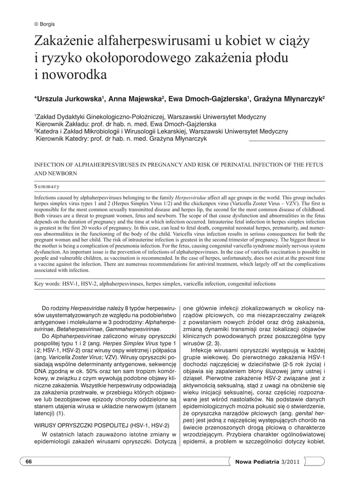 © Borgis Zakażenie alfaherpeswirusami u kobiet w ciąży i ryzyko okołoporodowego zakażenia płodu i noworodka *Urszula Jurkowska1, Anna Majewska2, Ewa Dmoch-Gajzlerska1, Grażyna Młynarczyk2 Zakład Dydaktyki Ginekologiczno−Położniczej, Warszawski Uniwersytet Medyczny Kierownik Zakładu: prof. dr hab. n. med. Ewa Dmoch−Gajzlerska 2 Katedra i Zakład Mikrobiologii i Wirusologii Lekarskiej, Warszawski Uniwersytet Medyczny Kierownik Katedry: prof. dr hab. n. med. Grażyna Młynarczyk 1 Infection of alphaherpesviruses In pregnancy and risk of perinatal infection of the fetus and newborn Summary Infections caused by alphaherpesviruses belonging to the family Herpesviridae affect all age groups in the world. This group includes herpes simplex virus types 1 and 2 (Herpes Simplex Virus 1/2) and the chickenpox virus (Varicella Zoster Virus – VZV). The first is responsible for the most common sexually transmitted disease and herpes lip, the second for the most common disease of childhood. Both viruses are a threat to pregnant women, fetus and newborn. The scope of that cause dysfunction and abnormalities in the fetus depends on the duration of pregnancy and the time at which infection occurred. Intrauterine fetal infection in herpes simplex infection is greatest in the first 20 weeks of pregnancy. In this case, can lead to fetal death, congenital neonatal herpes, prematurity, and numerous abnormalities in the functioning of the body of the child. Varicella virus infection results in serious consequences for both the pregnant woman and her child. The risk of intrauterine infection is greatest in the second trimester of pregnancy. The biggest threat to the mother is being a complication of pneumonia infection. For the fetus, causing congenital varicella syndrome mainly nervous system dysfunction. An important issue is the prevention of infections of alphaherpesviruses. In the case of varicella vaccination is possible in people and vulnerable children, as vaccination is recommended. In the case of herpes, unfortunately, does not exist at the present time a vaccine against the infection. There are numerous recommendations for antiviral treatment, which largely off set the complications associated with infection. Key words: HSV-1, HSV-2, alphaherpesviruses, herpes simplex, varicella infection, congenital infections Do rodziny Herpesviridae należy 8 typów herpeswirusów usystematyzowanych ze względu na podobieństwo antygenowe i molekularne w 3 podrodziny: Alphaherpesvirinae, Betaherpesvirinae, Gammaherpesvirinae. Do Alphaherpesvirinae zaliczono wirusy opryszczki pospolitej typu 1 i 2 (ang. Herpes Simplex Virus type 1 i 2; HSV-1, HSV-2) oraz wirusy ospy wietrznej i półpaśca (ang. Varicella Zoster Virus; VZV). Wirusy opryszczki posiadają wspólne determinanty antygenowe, sekwencję DNA zgodną w ok. 50% oraz ten sam tropizm komórkowy, w związku z czym wywołują podobne objawy kliniczne zakażenia. Wszystkie herpeswirusy odpowiadają za zakażenia przetrwałe, w przebiegu których objawowe lub bezobjawowe epizody choroby oddzielone są stanem utajenia wirusa w układzie nerwowym (stanem latencji) (1). Wirusy opryszczki pospolitej (HSV-1, HSV-2) W ostatnich latach zauważono istotne zmiany w epidemiologii zakażeń wirusami opryszczki. Dotyczą 66 one głównie infekcji zlokalizowanych w okolicy narządów płciowych, co ma niezaprzeczalny związek z powstaniem nowych źródeł oraz dróg zakażenia, zmianą dynamiki transmisji oraz lokalizacji objawów klinicznych powodowanych przez poszczególne typy wirusów (2, 3). Infekcje wirusami opryszczki występują w każdej grupie wiekowej. Do pierwotnego zakażenia HSV-1 dochodzi najczęściej w dzieciństwie (2-5 rok życia) i objawia się zapaleniem błony śluzowej jamy ustnej i dziąseł. Pierwotne zakażenie HSV-2 związane jest z aktywnością seksualną, stąd z uwagi na obniżenie się wieku inicjacji seksualnej, coraz częściej rozpoznawane jest wśród nastolatków. Na podstawie danych epidemiologicznych można pokusić się o stwierdzenie, że opryszczka narządów płciowych (ang. genital herpes) jest jedną z najczęściej występujących chorób na świecie przenoszonych drogą płciową o charakterze wrzodziejącym. Przybiera charakter ogólnoświatowej epidemii, a problem w szczególności dotyczy kobiet. Nowa Pediatria 3/2011 Zakażenie alfaherpeswirusami u kobiet w ciąży i ryzyko okołoporodowego zakażenia płodu i noworodka Mają one większe predyspozycje do nabywania chorób przenoszonych drogą płciową z uwagi na budowę anatomiczną narządów płciowych. Mężczyźni mniej dotkliwie odczuwają dyskomfort związany z objawami choroby, toteż nieświadomi zakażenia stają się źródłem infekcji dla partnerek. Należy dodać, że prawdopodobieństwo wystąpienia choroby jest ponad sześciokrotnie wyższe u kobiet aktywnych seksualnie, ryzyko to wzrasta u osób preferujących stosunki oro-genitalne (4, 5). Genital herpes może być wywoływany przez oba typy wirusa. Udział HSV-1 zauważono w 1994 roku i od tego czasu przypisuje się mu coraz większe znaczenie w etiologii choroby. W ostatnich latach w Europie obserwowany jest wzrost zakażeń typem 1. W niektórych krajach może on odpowiadać za 50% pierwotnych zakażeń z objawami zlokalizowanymi na narządach płciowych (3, 5, 6). W latach 1972-2001 w Wielkiej Brytanii zaobserwowano wśród kobiet ponad dziewięciokrotny, a u mężczyzn dwukrotny wzrost liczby nowych zakażeń wirusem opryszczki w okolicach narządów płciowych. Od 1993 do 2000 roku w Anglii i Walii, w klinikach leczących choroby przenoszone drogą płciową wykrywano rocznie około 15 000 przypadków. W 2001 roku rozpoznano 17 850 nowych infekcji, najwięcej w grupie 20-24-latków. Na podstawie danych National Disease and Therapeutic Index (NDTI) stwierdzono, że genital herpes dotyka rocznie 50 na 10 000 dorosłych osób w USA (2, 7, 8). Niestety faktyczne dane o liczbie zakażeń or