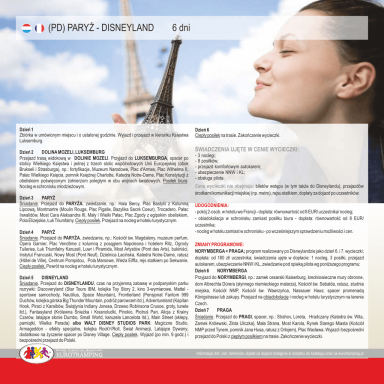 (PD) PARYŻ - DISNEYLAND 6 dni Dzień 1 Zbiórka w umówionym miejscu i o ustalonej godzinie. Wyjazd i przejazd w kierunku Księstwa Luksemburg. Dzień 2 DOLINA MOZELI, LUKSEMBURG Przejazd trasą widokową w DOLINIE MOZELI. Przyjazd do LUKSEMBURGA, spacer po stolicy Wielkiego Księstwa i jednej z trzech stolic wspólnotowych Unii Europejskiej (obok Brukseli i Strasburga), np.: fortyfikacje, Muzeum Narodowe, Plac d'Armes, Plac Wilhelma II, Pałac Wielkiego Księcia, pomnik Księżnej Charlotte, Katedra Notre-Dame, Plac Konstytucji z obeliskiem poświęconym żołnierzom poległym w obu wojnach światowych. Posiłek biura. Nocleg w schronisku młodzieżowym. Dzień 3 PARYŻ Śniadanie. Przejazd do PARYŻA, zwiedzanie, np.: Hala Bercy, Plac Bastylii z Kolumną Lipcową, Montmartre (Moulin Rouge, Plac Pigalle, Bazylika Sacré Coeur), Trocadero, Pałac Inwalidów, Most Cara Aleksandra III, Mały i Wielki Pałac, Plac Zgody z egipskim obeliskiem, Pola Elizejskie, Łuk Triumfalny. Ciepły posiłek. Przejazd na nocleg w hotelu turystycznym. Dzień 4 PARYŻ Śniadanie. Przejazd do PARYŻA, zwiedzanie, np.: Kościół św. Magdaleny, muzeum perfum, Opera Garnier, Plac Vendôme z kolumną z posągiem Napoleona i hotelem Ritz, Ogrody Tuileries, Łuk Triumfalny Karuzeli, Luwr i Piramida, Most Artystów (Pont des Arts), bukiniści, Instytut Francuski, Nowy Most (Pont Neuf), Dzielnica Łacińska, Katedra Notre-Dame, ratusz (Hôtel de Ville), Centrum Pompidou, Pola Marsowe, Wieża Eiffla, rejs statkiem po Sekwanie. Ciepły posiłek. Powrót na nocleg w hotelu turystycznym. Dzień 5 DISNEYLAND Śniadanie. Przejazd do DISNEYLANDU, czas na przyjemną zabawę w podparyskim parku rozrywki: Discoveryland (Star Tours IBM, kolejka Toy Story 2, kino 3-wymiarowe, Mattel sportowe samochody, Nautilius, Space Mountain), Frontierland (Pensjonat Fantom 999 Duchów, kolejka górska Big Thunder Mountain, podróż parowcem itd.), Adventureland (Kapitan Hook, Piraci z Karaibów, Świątynia Indiany Jonesa, Drzewo Robinsona Crusoe, groty, tunele itd.), Fantasyland (Królewna Śnieżka i Krasnoludki, Pinokio, Piotruś Pan, Alicja z Krainy Czarów, latające słonie Dumbo, Small World, karuzela Lancelota itd.), Main Street (sklepy, pamiątki, Wielka Parada) albo WALT DISNEY STUDIOS PARK: Magiczne Studio, Armageddon - efekty specjalne, kolejka Rock'n'Roll, Świat Animacji, Latające Dywany; dodatkowo na życzenie spacer po Disney Village. Ciepły posiłek. Wyjazd (po min. 9 godz.) i bezpośredni przejazd do Polski. Dzień 6 Ciepły posiłek na trasie. Zakończenie wycieczki. ŚWIADCZENIA UJĘTE W CENIE WYCIECZKI: - 3 noclegi; - 8 posiłków; - przejazd komfortowym autokarem; - ubezpieczenie NNW i KL; - obsługa pilota. Cena wycieczki nie obejmuje: biletów wstępu (w tym także do Disneylandu), przejazdów środkami komunikacji miejskiej (np. metro), rejsu statkiem, dopłaty za dojazd po uczestników. UDOGODNIENIA: - pokój 2-osob. w hotelu we Francji - dopłata: równowartość od 8 EUR/ uczestnika/ nocleg; - obiadokolacja w schronisku zamiast posiłku biura - dopłata: równowartość od 8 EUR/ uczestnika; - nocleg w hotelu zamiast w schronisku - po wcześniejszym sprawdzeniu możliwości i cen. ZMIANY PROGRAMOWE: NORYMBERGA + PRAGA; program realizowany po Disneylandzie jako dzień 6. i 7. wycieczki; dopłata: od 180 zł/ uczestnika; świadczenia ujęte w dopłacie: 1 nocleg, 3 posiłki, przejazd autokarem, ubezpieczenie NNW i KL, zwiedzanie pod opieką pilota wg poniższego programu: Dzień 6 NORYMBERGA Przyjazd do NORYMBERGI, np.: zamek cesarski Kaiserburg, średniowieczne mury obronne, dom Albrechta Dürera (słynnego niemieckiego malarza), Kościół św. Sebalda, ratusz, studnia miejska, Kościół NMP, Kościół św. Wawrzyńca, Nassauer Haus; spacer promenadą Königstrasse lub zakupy. Przejazd na obiadokolację i nocleg w hotelu turystycznym na terenie Czech. Dzień 7 PRAGA Śniadanie. Przejazd do PRAGI, spacer, np.: Strahov, Loreta, Hradczany (Katedra św. Wita, Zamek Królewski, Złota Uliczka), Mała Strana, Most Karola, Rynek Starego Miasta (Kościół NMP przed Tynem, pomnik Jana Husa, ratusz z Orlojem), Plac Wacława. Wyjazd i bezpośredni przejazd do Polski z ciepłym posiłkiem na trasie. Zakończenie wycieczki. Informacje dot. cen, terminów, dopłat za dojazd dostępne w dodatku do katalogu oraz na eurotramping.pl