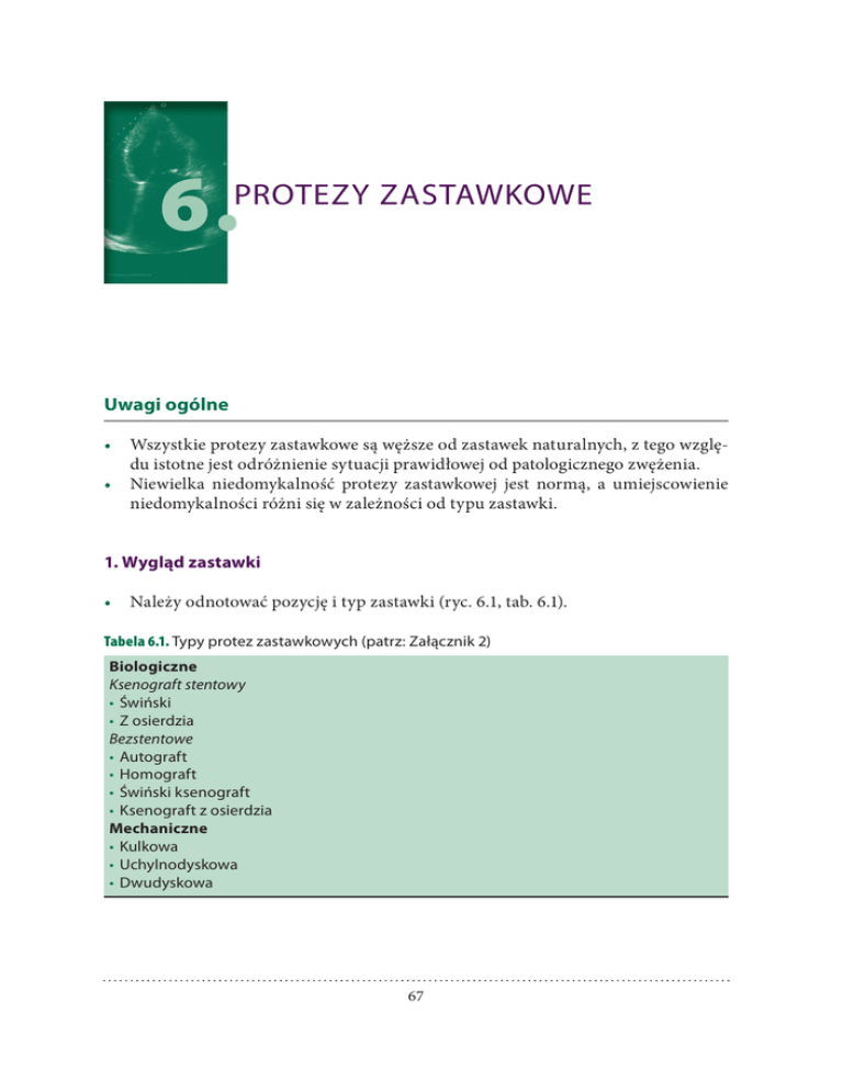 6. PROTEZY ZASTAWKOWE Uwagi ogólne • • Wszystkie protezy zastawkowe są węższe od zastawek naturalnych, z tego względu istotne jest odróżnienie sytuacji prawidłowej od patologicznego zwężenia. Niewielka niedomykalność protezy zastawkowej jest normą, a umiejscowienie niedomykalności różni się w zależności od typu zastawki. 1. Wygląd zastawki • Należy odnotować pozycję i typ zastawki (ryc. 6.1, tab. 6.1). Tabela 6.1. Typy protez zastawkowych (patrz: Załącznik 2) Biologiczne Ksenograft stentowy • Świński • Z osierdzia Bezstentowe • Autograft • Homograft • Świński ksenograft • Ksenograft z osierdzia Mechaniczne • Kulkowa • Uchylnodyskowa • Dwudyskowa 67 ECHOKARDIOGRAFIA. Praktyczny podręcznik wykonywania i opisywania badania a b c d Rycina 6.1. Obraz echokardiograficzny protez zastawkowych. (a) Ksenograft świński ze stentem wszczepiony w ujście aortalne w projekcji przymostkowej w osi krótkiej. (b) Zastawka kulkowa w pozycji mitralnej w projekcji 4-jamowej. (c) Uchylno-dyskowa zastawka w pozycji aortalnej, w projekcji przymostkowej, w osi długiej. (d) Powiększony obraz dwudyskowej zastawki mechanicznej w pozycji mitralnej, w projekcji 4-jamowej. • Czy proteza się przemieszcza? W pozycji aortalnej jest to zawsze spowodowane dużym rozejściem się szwu (zazwyczaj > 30% obwodu pierścienia protezy). W pozycji mitralnej może to wynikać z pozostawienia płatków naturalnej zastawki. Jeśli wszczepiona proteza jest zastawką biologiczną • • Czy płatki zastawki są pogrubiałe (> 3 mm grubości)? Czy ruch płatków jest prawidłowy, czy jest ograniczony (sugeruje zwężenie) lub zwiększony (sugeruje rozerwanie)? Zwiększona ruchomość może być wynikiem zarówno wypadania płatka, jak również obecności płatka cepowatego albo segmentu (wykazującego ruchomość w zakresie 180°). 68 Protezy zastawkowe • • W przypadku niedawno wszczepionej (do 6 miesięcy wstecz) zastawki bezstentowej może wystąpić poszerzenie opuszki aorty spowodowane obrzękiem bądź krwiakiem. Czasami można to pomylić z ropniem w badaniu przezprzełykowym. Czy obecna jest oddzielna echogeniczna masa (wegetacja lub rozerwany płatek)? Jeśli wszczepiona proteza jest zastawką mechaniczną • • • • Czy element zamykający [dysk(i) lub kulka] otwiera się szybko i całkowicie? Jeśli są dwa dyski, czy otwierają się i zamykają symetrycznie? – Niewielkie różnice czasowe podczas zamykania się dysków mogą być czasami widoczne w przypadku zastawki wszczepionej w ujście mitralne. – Trzepotanie dysków zastawki dwudyskowej jest normą. Czy obecna jest oddzielna echogeniczna masa związana z zastawką? – Należy rozważyć skrzeplinę bądź wegetację. – Jeśli jest cienka, może to być pasmo tkanki łącznej, które jest zjawiskiem normalnym. Intensywne spontaniczne echa w jamie LV są zjawiskiem prawidłowym u osób ze sztuczną zastawką mitralną. 2. Czy jest obecna niedomykalność lub cechy upośledzonego przepływu? • Interpretacja zależy od miejsca wszczepienia zastawki (patrz str. 70-76). 3. Funkcja LV i RV oraz ciśnienie w PA • • Hiperkinetyczna LV jest objawem ciężkiej niedomykalności protezy zastawkowej w ujściu aortalnym lub mitralnym. Hiperkinetyczna RV sugeruje ciężką niedomykalność protezy po prawej stronie serca. Wzrost ciśnienia w PA może być objawem upośledzonego przepływu krwi przez sztuczną zastawkę mitralną. 4. Kiedy potrzebne jest TEE (tab. 6.2) • TTE i TEE są metodami uzupełniającymi się, a TEE rzadko wykonuje się bez wcześniejszego przeprowadzenia TTE. Chociaż obrazowanie przezprzełykowe jest zazwyczaj potrzebne do uwidocznienia wegetacji i ropni w okolicy tylnej części opuszki aorty, ropnie w okolicy części przedniej mogą być lepiej widoczne w TTE. 69