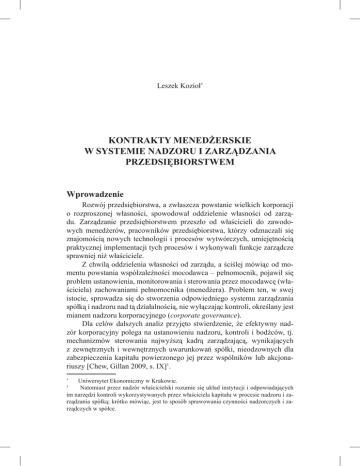 Leszek Kozioł* 5,2 KONTRAKTY MENEDŻERSKIE W SYSTEMIE NADZORU I ZARZĄDZANIA PRZEDSIĘBIORSTWEM Wprowadzenie Rozwój przedsiębiorstwa, a zwłaszcza powstanie wielkich korporacji o rozproszonej własności, spowodował oddzielenie własności od zarządu. Zarządzanie przedsiębiorstwem przeszło od właścicieli do zawodowych menedżerów, pracowników przedsiębiorstwa, którzy odznaczali się znajomością nowych technologii i procesów wytwórczych, umiejętnością praktycznej implementacji tych procesów i wykonywali funkcje zarządcze sprawniej niż właściciele. Z chwilą oddzielenia własności od zarządu, a ściślej mówiąc od momentu powstania współzależności mocodawca – pełnomocnik, pojawił się problem ustanowienia, monitorowania i sterowania przez mocodawcę (właściciela) zachowaniami pełnomocnika (menedżera). Problem ten, w swej istocie, sprowadza się do stworzenia odpowiedniego systemu zarządzania spółką i nadzoru nad tą działalnością, nie wyłączając kontroli, określany jest mianem nadzoru korporacyjnego (corporate governance). Dla celów dalszych analiz przyjęto stwierdzenie, że efektywny nadzór korporacyjny polega na ustanowieniu nadzoru, kontroli i bodźców, tj. mechanizmów sterowania najwyższą kadrą zarządzającą, wynikających z zewnętrznych i wewnętrznych uwarunkowań spółki, nieodzownych dla zabezpieczenia kapitału powierzonego jej przez wspólników lub akcjonariuszy [Chew, Gillan 2009, s. IX]1. Uniwersytet Ekonomiczny w Krakowie. Natomiast przez nadzór właścicielski rozumie się układ instytucji i odpowiadających im narzędzi kontroli wykorzystywanych przez właściciela kapitału w procesie nadzoru i zarządzania spółką; krótko mówiąc, jest to sposób sprawowania czynności nadzorczych i zarządczych w spółce. * 1 362 Leszek Kozioł Liczne badania tego problemu pozwoliły sformułować tezę, że organizacja, która przestrzega zasad dobrego nadzoru, często osiąga lepsze wyniki, jest lepiej postrzegana, cieszy się zaufaniem i dobrą reputacją. Potwierdzają to m.in. badania La Porty, który twierdzi, że w krajach lepiej chroniących akcjonariuszy, rynki finansowe są bardziej rozwinięte, a firmy mają zdecydowanie większe możliwości dostępu do zewnętrznego finansowania i lepsze warunki rozwoju [Haski 2003, s. 6]. Krótko tę kwestię ujmując, można postawić tezę, że zbudowanie prawidłowych systemów nadzoru korporacyjnego jest ważną przesłanką rozwoju przedsiębiorstw i poprawy ich produktywności. Mechanizmy nadzorcze, kontrolne i narzędzia motywacji Charakteryzując różnorodne instytucje nadzoru korporacyjnego nie sposób pominąć te z nich, które wynikają z otoczenia korporacji. Wybrane, ważniejsze z nich to: uwarunkowania polityczne, regulacje prawne i przepisy opisujące rolę i zakres odpowiedzialności osób prowadzących interesy spółki lub innych podmiotów gospodarczych, regulacje prawne i przepisy tworzące ramy działania organów nadzorujących, np. zgromadzenia wspólników, rynek finansowy, a zwłaszcza rynek akcji i obligacji, rynek kontroli przedsiębiorstw, szczególnie fuzje i przejęcia, rynek usług menedżerskich jako mechanizm weryfikujący talenty menedżerskie, konkurencja na rynku produktów. Kultura nadzoru korporacyjnego rozumiana jako corporate governance wyrażona została także w różnych kodeksach dobrych praktyk, uwzględniono ją również w standardach zaaprobowanych przez Radę OECD. Są one sformułowane na tyle ogólnie, że można w ich ramach umieścić każdy model spółki akcyjnej spotykany w ustawodawstwie OECD. Równocześnie nie mają one charakteru bezwzględnie obowiązującego. Ich celem jest dostarczenie wzorców do uregulowań państwowych Wspomniane mechanizmy nadzoru korporacyjnego tworzą zbiór ograniczeń o negatywnym charakterze, zawierają bowiem długą listę zakazów, nakazów, zaleceń, a nawet sankcji karnych – natomiast nie pomieszczono w nim bodźców o pozytywnym charakterze, stymulujących agenta do zachowań funkcjonalnych względem oczekiwań i celów mocodawcy. Z tych właśnie względów spora liczba badaczy zajmujących się tą tematyką problem nadzoru korporacyjnego rozumie jako teorię bodźców ekonomicznych (zachęt materialnych). Najważniejszy sposób rozwiązania tego problemu Kontrakty menedżerskie w systemie nadzoru i zarządzania... 363 polegałby na sporządzeniu kontraktu dotyczącego rezultatów działalności, byłby zatem oparty na efektach (outcome based) powiązanych z systemem bodźców [Laffant, Martimort 2002, s. 1-5; Krafft, Ravix 1998, s. 245-246]. Krótko mówiąc, problem nadzoru powinien być rozwiązany, zdaniem tych autorów, w płaszczyźnie proefektywnościowych kontraktów (incentive contracts). Sumując powyższe uwagi, klasyczny problem nadzoru korporacyjnego, ze zwróceniem uwagi szczególnie na efektywność nadzoru właścicielskiego, sprowadzałby się do znalezienia odpowiedzi na poniższe pytania: 1. Jak skonstruować system bodźców skłaniający pełnomocnika do jak najbardziej skutecznego realizowania celów mocodawcy, a jednocześnie zniechęcający go do realizacji własnych celów? 2. W jaki sposób i w jakim zakresie mocodawca może skutecznie sterować i monitorować działania pełnomocnika pod kątem wywiązywania się przez niego z wyznaczonych mu zadań i przewidywanych efektów? Obie podane kwestie, a raczej obydwa aspekty nadzoru korporacyjnego wydają się jednakowo ważne. Ich rozwiązywanie okazuje się zadaniem skomplikowanym, budzącym sporo kontrowersji, a w przypadku sektora publicznego nawet politycznych emocji. Teoretyczne podstawy kontraktów menedżerskich Wśród licznych koncepcji zarządzania i interpretacji pojęcia nadzoru korporacyjnego, uwzględniających w szczególności tematykę kontraktów menedżerskich, należałoby wymienić teorię praw własności, kontraktowe ujęcie przedsiębiorstwa, teorię stewarda, teorię bodźc