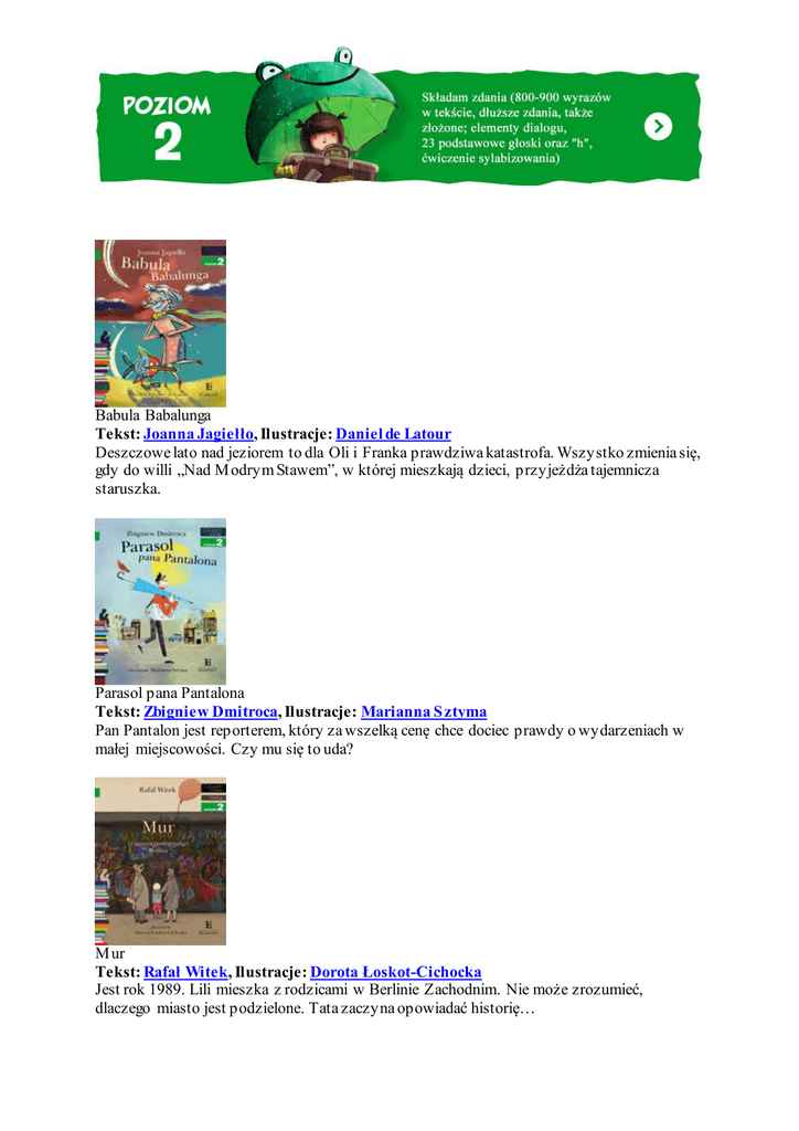 Babula Babalunga Tekst: Joanna Jagiełło, Ilustracje: Daniel de Latour Deszczowe lato nad jeziorem to dla Oli i Franka prawdziwa katastrofa. Wszystko zmienia się, gdy do willi „Nad M odrym Stawem”, w której mieszkają dzieci, przyjeżdża tajemnicza staruszka. Parasol pana Pantalona Tekst: Zbigniew Dmitroca, Ilustracje: Marianna S ztyma Pan Pantalon jest reporterem, który za wszelką cenę chce dociec prawdy o wydarzeniach w małej miejscowości. Czy mu się to uda? M ur Tekst: Rafał Witek, Ilustracje: Dorota Łoskot-Cichocka Jest rok 1989. Lili mieszka z rodzicami w Berlinie Zachodnim. Nie może zrozumieć, dlaczego miasto jest podzielone. Tata zaczyna opowiadać historię… Historia pewnego statku Tekst: Zofia S tanecka, Ilustracje: Joanna Rusinek „Historia pewnego statku” to opowieść o pierwszym rejsie transatlantyku „Titanic” w roku 1912, zakończonym dramatyczną katastrofą. Wchodzimy na statek i podziwiamy jego rozmiary i przepych wraz z ośmioletnią Ewą Hart, postacią autentyczną, która płynęła z rodzicami tym statkiem i udało jej się uratować. Wielkie emocje i powiew historii! Tytus w cyrku Tekst: Joanna Olech, Ilustracje: Joanna Olech Tytus to pies-detektyw. Bardzo sprytny pies-detektyw. Potrafi rozwiązać najtrudniejszą zagadkę kryminalną! Historia ta pełna jest akcji, przygód i zaskakujących faktów! Robot Robert Tekst: Zofia S tanecka, Ilustracje: Emilia Dziubak Robot Robert ciężko pracuje w fabryce pana Polikarpa. Jest zmęczony. Kiedy udaje się na urlop, odkrywa jednak coś bardzo zaskakującego… Oko w oko z diplodokiem Tekst: Joanna Jagiełło, Ilustracje: Joanna Rusinek Bruno jest mały, słaby, a na dodatek nosi okulary grube jak denka od szklanek. W 1A nikt za nim nie przepada. Pewnego dnia cała klasa wybiera się na wycieczkę do Gadolandu, wielkiego parku, w którym zgromadzono szkielety dinozaurów. M rożące krew w żyłach odkrycie, którego dokona tu mały Bruno, raz na zawsze odmieni jego los! Bigos z M amutka Tekst: Małgorzata S trękowska-Zaremba, Ilustracje: Marianna Oklejak W horrorze musi wydarzyć się coś przerażającego, a w horrorku? Sprawdźcie. Zdradzę jedynie, że spotkacie wesołego M amutka, jego niezbyt odważnych przyjaciół, Wronę Bez Ogona i hipopotama Hlipa, oraz okropnego łobuza Łysego Tłuka, który nosi wielki kij i gar na bigos. Walizka pana Hanumana Tekst: Rafał Witek, Ilustracje: Emilia Dziubak Tej wiosny jest wyjątkowo brzydka pogoda, pada deszcz i wieje wiatr. Daria trochę się nudzi. Wszystko zmieni się, kiedy przez miasto przejedzie tabor cyrkowy, zostawiając za sobą tajemniczą starą walizkę. Tytus - superpies Tekst: Joanna Olech, Ilustracje: Joanna Olech Tytus to pies-detektyw. Bardzo sprytny pies-detektyw, zwany nawet superpsem. Potrafi rozwiązać najtrudniejszą zagadkę kryminalną i – co więcej – bardzo lubi to robić! Historia tego śledztwa pełna jest akcji, przygód i zaskakujących faktów! Skarb Arubaby Tekst: Małgorzata S trzałkowska, Ilustracje: Mikołaj Kamler Wciągający niczym najlepsze powieści Verne’a „Skarb Arubaby” to najprawdziwsza przygodówka, w której jest wszystko, co znaleźć się powinno w klasyce tego gatunku. Wakacje Tomka i Oli spędzane w starym wiejskim domku wujka Anatola przynoszą ciąg niezwykłych zdarzeń, których kulminacją jest odnalezienie skarbu legendarnego wodza piratów. M aja na tropie jaja Tekst: Rafał Witek, Ilustracje: Emilia Dziubak Papudze uciekło złote jajo! I co terrraz? – martwi się papuga. Na szczęście u jej boku dzielnie kroczy kilkuletnia M aja, obiecując odnalezienie cennej zguby. Wespół z dzielną załogą statku docierają na bezludną wyspę, by zamiast jaja odnaleźć coś zupełnie innego… Tadek i spółka Tekst: Joanna Olech, Ilustracje: Dorota Łoskot-Cichocka Tadek Damradek, Natalka Pytalka, Romek Wiadomek, Tereska Bezpieska czy Franek Tyranek… Joannie Olech udało się zgromadzić iście doborową gromadkę! Na szczęście to urwisy nie tylko urocze , ale i niezwykle rezolutne.