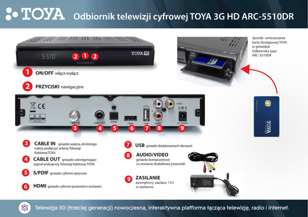 Odbiornik telewizji cyfrowej TOYA 3G HD ARC-5510DR 2 1 1 ON/OFF włącz-wyłącz 2 PRZYCISKI nawigacyjne 2 3 3 Sposób umieszczania karty dostępowej TOYA w gnieździe Odbiornika typu ARC-5510DR 4 CABLE IN gniazdo wejścia, do którego należy podłączyć antenę Telewizji Kablowej TOYA. 4 CABLE OUT gniazdo udostępniające sygnał analogowy Telewizji Kablowej TOYA. 5 S/PDIF gniazdo cyfrowe optyczne. 6 HDMI gniazdo cyfrowe (przewód w zestawie). 5 6 7 8 9 7 USB gniazdo dedykowanych akcesorii. 8 AUDIO/VIDEO gniazdo kompozytowe (w zestawie dodatkowy przewód). 9 ZASILANIE zewnętrzny zasilacz 12V w zestawie. Telewizja 3G (trzeciej generacji) nowoczesna, interaktywna platforma łącząca telewizję, radio i Internet. Odbiornik telewizji cyfrowej TOYA 3G HD ARC-5510DR Telewizja 3G Wysoki standard jakości obrazu i dźwięku