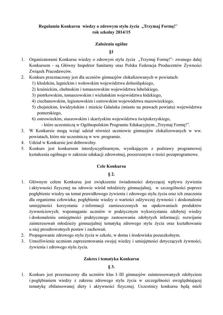 Regulamin Konkursu wiedzy o zdrowym stylu życia „Trzymaj Formę!” rok szkolny 2014/15 Założenia ogólne §1 1. 2. 3. 4. 5. Organizatorami Konkursu wiedzy o zdrowym stylu życia „Trzymaj Formę!”- zwanego dalej Konkursem - są Główny Inspektor Sanitarny oraz Polska Federacja Producentów Żywności Związek Pracodawców. Konkurs przeznaczony jest dla uczniów gimnazjów zlokalizowanych w powiatach: 1) kłodzkim, legnickim i wołowskim województwa dolnośląskiego, 2) kraśnickim, chełmskim i tomaszowskim województwa lubelskiego, 3) piotrkowskim, tomaszowskim i wieluńskim województwa łódzkiego, 4) ciechanowskim, legionowskim i ostrowskim województwa mazowieckiego, 5) chojnickim, kwidzyńskim i mieście Gdańsku (miasto na prawach powiatu) województwa pomorskiego, 6) ostrowieckim, staszowskim i skarżyskim województwa świętokrzyskiego, - które uczestniczą w Ogólnopolskim Programie Edukacyjnym „Trzymaj Formę!”. W Konkursie mogą wziąć udział również uczniowie gimnazjów zlokalizowanych w ww. powiatach, które nie uczestniczą w ww. programie. Udział w Konkursie jest dobrowolny. Konkurs jest konkursem interdyscyplinarnym, wynikającym z podstawy programowej kształcenia ogólnego w zakresie edukacji zdrowotnej, poszerzonym o treści pozaprogramowe. Cele Konkursu § 2. 1. 2. 3. Głównym celem Konkursu jest zwiększenie świadomości dotyczącej wpływu żywienia i aktywności fizycznej na zdrowie wśród młodzieży gimnazjalnej, w szczególności poprzez pogłębienie wiedzy na temat prawidłowego żywienia i zdrowego stylu życia oraz ich znaczenia dla organizmu człowieka; pogłębienie wiedzy o wartości odżywczej żywności i doskonalenie umiejętności korzystania z informacji zamieszczonych na opakowaniach produktów żywnościowych; wspomaganie uczniów w praktycznym wykorzystaniu zdobytej wiedzy i doskonaleniu umiejętności praktycznego zastosowania zdobytych informacji; rozwijanie zainteresowań młodzieży gimnazjalnej tematyką zdrowego stylu życia oraz kształtowanie u niej prozdrowotnych postaw i zachowań. Propagowanie zdrowego stylu życia w szkole, w domu i środowisku pozaszkolnym. Umożliwienie uczniom zaprezentowania swojej wiedzy i umiejętności dotyczących żywności, żywienia i zdrowego stylu życia. Zakres i tematyka Konkursu § 3. 1. Konkurs jest przeznaczony dla uczniów klas I–III gimnazjów zainteresowanych zdobyciem i pogłębianiem wiedzy z zakresu zdrowego stylu życia w szczególności uwzględniającej tematykę zbilansowanej diety i aktywności fizycznej. Uczestnicy konkursu będą mieli 2. możliwość wykazania się na wszystkich jego etapach umiejętnościami i wiedzą wynikającą z podstawy programowej kształcenia ogólnego w zakresie edukacji zdrowotnej na III etapie edukacyjnym, poszerzoną o treści pozaprogramowe. Tematyka konkursu obejmuje: 1) Żywienie zgodne z zasadami zbilansowanej diety: a) grupy produktów żywnościowych i ich wartość odżywcza, b) podstawowe składniki odżywcze i ich rola dla organizmu człowieka, c) dobowe zapotrzebowanie na energię i składniki odżywcze, d) aktualne zalecenia żywieniowe, e) najczęstsze błędy żywieniowe i ich następstwa; 2) Aktywność fizyczna: a) rodzaje aktywności fizycznej, b) znaczenie aktywności fizycznej dla zdrowia, c) wydatek energetyczny przy różnych formach aktywności fizycznej, d) pożądana aktywność fizyczna dla dzieci i młodzieży oraz możliwości jej zwiększenia w życiu codziennym; 3) Wybrane elementy edukacji konsumenckiej: a) prawa konsumenta, b) znakowanie produktów żywnościowych. Struktura organizacyjna § 4. 1. 2. 3. 4. 5. Pracami organizacyjnymi i merytorycznymi związanymi z przeprowadzeniem Konkursu kieruje Komitet Organizacyjny powołany przez organizatorów Konkursu z siedzibą w Polskiej Federacji Producentów Żywności Związek Pracodawców, adres: ul. Chałubińskiego 8, 00-613 Warszawa. W skład Komitetu Organizacyjnego wchodzą: 1) Główny Inspektor Sanitarny; 2) Dyrektor Generalny Polskiej Federacji Producentów Żywności Związku Pracodawców; 3) Prezes Rady Krajowej Federacji Konsumentów. Komitet Organizacyjny powołuje Komisję Konkursową. Komisja Konkursowa odpowiada za przeprowadzenie Konkursu oraz za poziom merytoryczny konkursu, a w szczególności: 1) opracowuje zadania dla poszczególnych etapów Konkursu; 2) przygotowuje klucze odpowiedzi oraz ustala wytyczne dotyczące sprawdzania i oceniania prac, w tym szczegółową punktację za każdy element rozwiązania; 3) ocenia rozwiązania zadań pierwszego, drugiego i trzeciego etapu Konkursu i na ich podstawie kwalifikuje uczestników na poszczególnych etapach konkursu; 4) w ciągu dziesięciu dni po zakończeniu każdego z etapów konkursu przygotowuje protokół z wykazem uczniów zakwalifikowanych do następnego etapu; 5) ustala listę finalistów; 6) ustala listę laureatów. W skład Komisji Konkursowej wchodzą: 1) Przedstawiciel Departamentu Promocji Zdrowia, Biostatystyki i Analiz w Głównym Inspektoracie Sanitarnym; 2) Przedstawiciel Polskiej Federacji Producentów Żywności Związku Pracodawców; 3) Członek Rady Naukowej PFPŻ ZP. Przebieg konkursu §5. 1. 2. 3. 4. 5. 6. 7. 8. 9. 10. 11. 12. 13. Konkurs przeprowadzany jest w trzech etapach: I etap - szkolny, II etap - powiatowy, III etap międzywojewódzki. Terminarz Konkursu zawarty jest w załączniku nr 1 do niniejszego Regulaminu. Warunkiem wzięcia udziału w Konkursie przez uczniów danej szkoły, jest zgłoszenie placówki przez dyrektora szkoły do Komitetu Organizacyjnego. Zgłoszenia dokonuje się za pośrednictwem formularza dostępnego na stronie internetowej Ogólnopolskiego Programu Edukacyjnego „Trzymaj Formę!” www.trzymajforme.pl Szkoły zgłaszają się do udziału w konkursie nie później niż sześć tygodni przed terminem I etapu konkursu, określonym w załączniku nr 1 do niniejszego Regulaminu. Zgłoszenie następuje poprzez wypełnienie formularza or