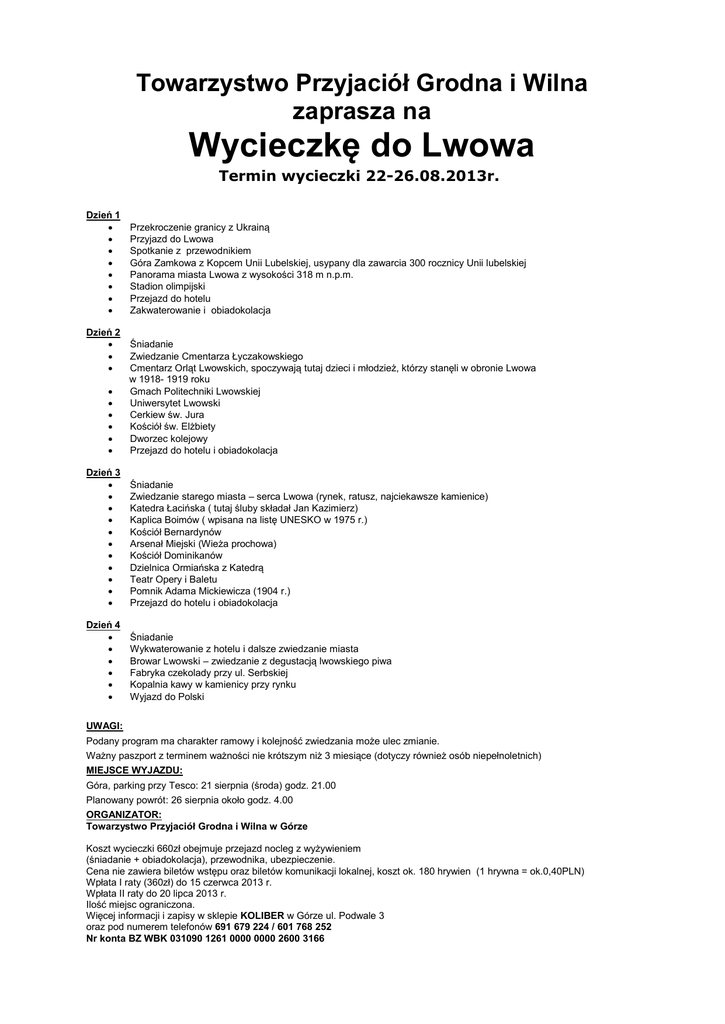 Towarzystwo Przyjaciół Grodna i Wilna zaprasza na Wycieczkę do Lwowa Termin wycieczki 22-26.08.2013r. Dzień 1 Przekroczenie granicy z Ukrainą Przyjazd do Lwowa Spotkanie z przewodnikiem Góra Zamkowa z Kopcem Unii Lubelskiej, usypany dla zawarcia 300 rocznicy Unii lubelskiej Panorama miasta Lwowa z wysokości 318 m n.p.m. Stadion olimpijski Przejazd do hotelu Zakwaterowanie i obiadokolacja Dzień 2 Śniadanie Zwiedzanie Cmentarza Łyczakowskiego Cmentarz Orląt Lwowskich, spoczywają tutaj dzieci i młodzież, którzy stanęli w obronie Lwowa w 1918- 1919 roku Gmach Politechniki Lwowskiej Uniwersytet Lwowski Cerkiew św. Jura Kościół św. Elżbiety Dworzec kolejowy Przejazd do hotelu i obiadokolacja Dzień 3 Śniadanie Zwiedzanie starego miasta – serca Lwowa (rynek, ratusz, najciekawsze kamienice) Katedra Łacińska ( tutaj śluby składał Jan Kazimierz) Kaplica Boimów ( wpisana na listę UNESKO w 1975 r.) Kościół Bernardynów Arsenał Miejski (Wieża prochowa) Kościół Dominikanów Dzielnica Ormiańska z Katedrą Teatr Opery i Baletu Pomnik Adama Mickiewicza (1904 r.) Przejazd do hotelu i obiadokolacja Dzień 4 Śniadanie Wykwaterowanie z hotelu i dalsze zwiedzanie miasta Browar Lwowski – zwiedzanie z degustacją lwowskiego piwa Fabryka czekolady przy ul. Serbskiej Kopalnia kawy w kamienicy przy rynku Wyjazd do Polski UWAGI: Podany program ma charakter ramowy i kolejność zwiedzania może ulec zmianie. Ważny paszport z terminem ważności nie krótszym niż 3 miesiące (dotyczy również osób niepełnoletnich) MIEJSCE WYJAZDU: Góra, parking przy Tesco: 21 sierpnia (środa) godz. 21.00 Planowany powrót: 26 sierpnia około godz. 4.00 ORGANIZATOR: Towarzystwo Przyjaciół Grodna i Wilna w Górze Koszt wycieczki 660zł obejmuje przejazd nocleg z wyżywieniem (śniadanie + obiadokolacja), przewodnika, ubezpieczenie. Cena nie zawiera biletów wstępu oraz biletów komunikacji lokalnej, koszt ok. 180 hrywien (1 hrywna = ok.0,40PLN) Wpłata I raty (360zł) do 15 czerwca 2013 r. Wpłata II raty do 20 lipca 2013 r. Ilość miejsc ograniczona. Więcej informacji i zapisy w sklepie KOLIBER w Górze ul. Podwale 3 oraz pod numerem telefonów 691 679 224 / 601 768 252 Nr konta BZ WBK 031090 1261 0000 0000 2600 3166