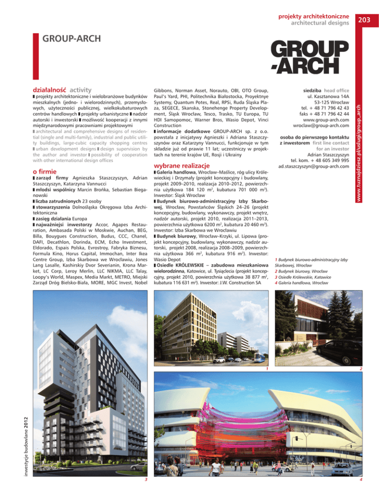 projekty architektoniczne architectural designs 203 działalność activity projekty architektoniczne i wielobranżowe budynków mieszkalnych (jedno- i wielorodzinnych), przemysłowych, użyteczności publicznej, wielkokubaturowych centrów handlowych projekty urbanistyczne nadzór autorski i inwestorski możliwość kooperacji z innymi międzynarodowymi pracowniami projektowymi architectural and comprehensive designs of residential (single and multi-family), industrial and public utility buildings, large-cubic capacity shopping centres urban development designs design supervision by the author and investor possibility of cooperation with other international design offices o firmie zarząd firmy Agnieszka Staszczyszyn, Adrian Staszczyszyn, Katarzyna Vannucci młodsi wspólnicy Marcin Brońka, Sebastian Bieganowski liczba zatrudnionych 23 osoby stowarzyszenia Dolnośląska Okręgowa Izba Architektoniczna zasięg działania Europa najważniejsi inwestorzy Accor, Agapes Restauration, Ambasada Polski w Moskwie, Auchan, BEG, Billa, Bouygues Construction, Budus, CCC, Chanel, DAFI, Decathlon, Dorinda, ECM, Echo Investment, Eldorado, Espais Polska, Evrostroy, Fabryka Biznesu, Formula Kino, Horus Capital, Immochan, Inter Ikea Centre Group, Izba Skarbowa we Wrocławiu, Jones Lang Lasalle, Kashirskiy Dvor Severianin, Krona Market, LC Corp, Leroy Merlin, LLC NIKMA, LLC Talay, Loopy’s World, Maspex, Media Markt, METRO, Miejski Zarząd Dróg Bielsko-Biała, MORE, MGC Invest, Nobel Gibbons, Norman Asset, Norauto, OBI, OTO Group, Paul’s Yard, PHI, Politechnika Białostocka, Proyektnye Systemy, Quantum Potes, Real, RPSi, Ruda Śląska Plaza, SEGECE, Skanska, Stonehenge Property Development, Śląsk Wrocław, Tesco, Trasko, TU Europa, TU HDI Samopomoc, Warner Bros, Wasio Depot, Vinci Construction informacje dodatkowe Group-Arch sp. z o.o. powstała z inicjatywy Agnieszki i Adriana Staszczyszynów oraz Katarzyny Vannucci, funkcjonuje w tym składzie już od prawie 11 lat; uczestniczy w projektach na terenie krajów UE, Rosji i Ukrainy wybrane realizacje Galeria handlowa, Wrocław–Maślice, róg ulicy Królewieckiej i Drzymały (projekt koncepcyjny i budowlany, projekt 2009–2010, realizacja 2010–2012, powierzchnia użytkowa 184 120 m2, kubatura 701 000 m3). Inwestor: Śląsk Wrocław Budynek biurowo-administracyjny Izby Skarbowej, Wrocław, Powstańców Śląskich 24–26 (projekt koncepcyjny, budowlany, wykonawczy, projekt wnętrz, nadzór autorski, projekt 2010, realizacja 2011–2013, powierzchnia użytkowa 6200 m2, kubatura 20 460 m3). inwestor: Izba Skarbowa we Wrocławiu Budynek biurowy, Wrocław–Krzyki, ul. Lipowa (projekt koncepcyjny, budowlany, wykonawczy, nadzór autorski, projekt 2008, realizacja 2008–2009, powierzchnia użytkowa 366 m2, kubatura 916 m3). inwestor: Wasio Depot Osiedle Królewskie – zabudowa mieszkaniowa wielorodzinna, Katowice, ul. Tysiąclecia (projekt koncepcyjny, projekt 2010, powierzchnia użytkowa 38 877 m2, kubatura 116 631 m3). Inwestor: J.W. Construction SA osoba do pierwszego kontaktu z inwestorem first line contact for an investor Adrian Staszczyszyn tel. kom. + 48 605 349 995 [email protected] 1 Budynek biurowo-administracyjny Izby Skarbowej, Wrocław 2 Budynek biurowy, Wrocław 3 Osiedle Królewskie, Katowice 4 Galeria handlowa, Wrocław 2 inwestycje budowlane 2012 1 siedziba head office ul. Kasztanowa 14a 53-125 Wrocław tel. + 48 71 796 42 43 faks + 48 71 796 42 44 www.group-arch.com [email protected] www.tuznajdziesz.pl/uslugi/group_arch GROUP-ARCH 3 4