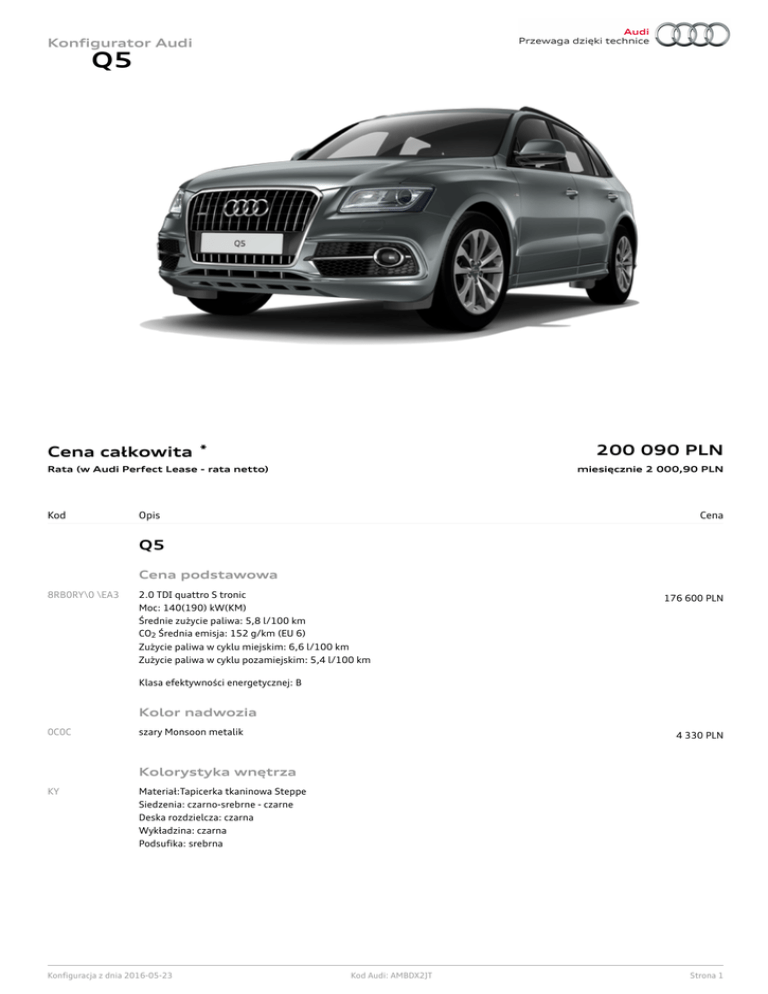 Konfigurator Audi Q5 200 090 PLN Cena całkowita * Rata (w Audi Perfect Lease - rata netto) Kod miesięcznie 2 000,90 PLN Opis Cena Q5 Cena podstawowa 8RB0RY\0 \EA3 2.0 TDI quattro S tronic Moc: 140(190) kW(KM) Średnie zużycie paliwa: 5,8 l/100 km CO2 Średnia emisja: 152 g/km (EU 6) Zużycie paliwa w cyklu miejskim: 6,6 l/100 km Zużycie paliwa w cyklu pozamiejskim: 5,4 l/100 km 176 600 PLN Klasa efektywności energetycznej: B Kolor nadwozia 0C0C szary Monsoon metalik 4 330 PLN Kolorystyka wnętrza KY Materiał:Tapicerka tkaninowa Steppe Siedzenia: czarno-srebrne - czarne Deska rozdzielcza: czarna Wykładzina: czarna Podsufika: srebrna Konfiguracja z dnia 2016-05-23 Kod Audi: AMBDX2JT Strona 1 Q5 Wyposażenie dodatkowe UH2 Asystent podjazdu 400 PLN 8N6 Czujnik zmierzchowy świateł i czujnik deszczu 620 PLN PIH ISOFIX mocowanie fotelika dziecięcego na siedzeniu pasażera z dezaktywacją poduszki powietrznej 400 PLN 1XW Kierownica 3-ramienna, wielofunkcyjna, sportowa, obszyta skórą 6XE Lusterka zewnętrzne, elektrycznie składane i ogrzewane PRF Obręcze kół ze stopu metali lekkich 8Jx18", 5 - ramienne z oponami 235/60 R18 4A3 Ogrzewanie foteli przednich WRV Pakiet promocyjny Comfort PQD Pakiet stylistyczny S line Exterieur 0 PLN 3S2 Relingi dachowe w kolorze czarnym z poprzeczkami 0 PLN 1PD Śruby zabezpieczające koła przed kradzieżą WSY S line selection PNQ System MMI® Navigation plus 0 PLN 1 110 PLN 0 PLN 1 850 PLN 11 030 PLN 140 PLN 3 610 PLN 0 PLN Objaśnienia: Cena może ulec zmianie w zależności od wybranej wersji silnika lub innego wyposażenia dodatkowego. Konfiguracja z dnia 2016-05-23 Kod Audi: AMBDX2JT Strona 2 Q5 Wyposażenie standardowe Pakiety wyposażenia 7HA Podparcia w drzwiach standardowe Nadwozie 8Q3 Automatyczna regulacja zasięgu reflektorów 4ZE Listwy wokół szyb w kolorze czarnym 6XD Lusterka zewnętrzne elektrycznie regulowane i ogrzewane, ze zintegrowanymi kierunkowskazami LED Zastąpione przez: Lusterka zewnętrzne, elektrycznie składane i ogrzewane 6FA Lusterka zewnętrzne w kolorze nadwozia 5SL Lusterko po stronie kierowcy, asferyczne 5RU Lusterko zewnętrzne po stronie pasażera convex 2Z1 Oznaczenia modelu 8BP Reflektory ksenonowe z układem zmywania 3S1 Relingi dachowe w kolorze srebrnym Zastąpione przez: Relingi dachowe w kolorze czarnym z poprzeczkami 8N1 System zmywania przedniej szyby Zastąpione przez: Czujnik zmierzchowy świateł i czujnik deszczu 4GF Szyba przednia termoizolacyjna w odcieniu zielonym 4KC Szyba tylna i szyby boczne z powłoką termoizolacyjną 5J1 Tylny spoiler Zastąpione przez: Spoiler dachowy (zawarty w Pakiet stylistyczny S line Exterieur ) 8X1 Układ zmywania reflektorów 8K4 Światła do jazdy dziennej 8WB Światła przeciwmgielne z przodu 8SK Światła tylne w technice LED 2K1 Wzmocnione zderzaki Zastąpione przez: Wzmocnione zderzaki (zawarty w Pakiet stylistyczny S line Exterieur ) Obręcze i opony 3F1 Koło zapasowe dojazdowe C4T Obręcze kół ze stopu metali lekkich, 8Jx17", 7 - ramienne Konfiguracja z dnia 2016-05-23 Kod Audi: AMBDX2JT Strona 3 Q5 Zastąpione przez: Obręcze kół ze stopu metali lekkich, 8Jx18", 5 - ramienne w stylistyce V (zawarty w Obręcze kół ze stopu metali lekkich 8Jx18", 5 ramienne z oponami 235/60 R18) Q41 Opony 235/65 R17 104 W z obniżonym oporem toczenia Zastąpione przez: Tires 235/60 R18 103W low rolling resistance (zawarty w Obręcze kół ze stopu metali lekkich 8Jx18", 5 - ramienne z oponami 235/60 R18) 1S1 Podnośnik samochodowy 7K1 Wskaźnik kontroli ciśnienia w oponach Wnętrze 5MA Aplikacje dekoracyjne Monometallic platinum lub w odcieniu beżowym dla koloru wnętrza w kolorze pistacjowo-beżowym 1T3 Apteczka i trójkąt ostrzegawczy 0TD Dywaniki welurowe z przodu i z tyłu 7E6 Elektryczna nagrzewnica powietrza 9AK Klimatyzacja automatyczna 2P1 Listwa ochronna krawędzi bagażnika z tworzywa sztucznego Zastąpione przez: Osłona krawędzi bagażnika ze stali szlachetnej (zawarty w Pakiet stylistyczny S line Exterieur ) 7M0 Listwy progowe z tworzywa Zastąpione przez: Listwy progowe z logo S line (zawarty w Pakiet stylistyczny S line Exterieur ) 4L2 Lusterko wewnętrzne 5XK Osłony przeciwsłoneczne dla kierowcy i pasażera 3GD Płaska podłoga przestrzeni bagażowej 6NJ Podsufitka pokryta tkaniną QQ0 Standardowe oświetlenie wnętrza U1A Tablica wskaźników z prędkościomierzem, zegarem, obrotomierzem i licznikiem przebiegu dziennego 6SS Wyłożenie podłogi bagażnika Kierownice 7F9 Gałka dźwigni skrzyni biegów 1MR Kierownica 4-ramienna obszyta skórą Zastąpione przez: Kierownica 3-ramienna, wielofunkcyjna, sportowa, obszyta skórą Komfort siedzeń 9P3 Czujnik kontroli zapięcia pasów bezpieczeństwa Konfiguracja z dnia 2016-05-23 Kod Audi: AMBDX2JT Strona 4 Q5 Q1A Fotele standardowe z przodu 3B3 ISOFIX - mocowanie fotelika dziecięcego dla skrajnych siedzeń z tyłu (z funkcją Top Tether) 6E3 Podłokietnik z przodu 3L3 Regulacja wysokości foteli przednich, manualna 3NC Tylna kanapa z dzielonym i składanym oparciem 3Q1 Zagłówki z tyłu Siedzenia i tapicerki N2K Tapicerka tkaninowa Steppe Bezpieczeństwo i technika 7AL Autoalarm fabryczny 4K4 Centralny zamek sterowany falami radiowymi QZ7 Elektromechaniczne wspomaganie układu kierowniczego UH1 Elektromechaniczny hamulec postojowy Zastąpione przez: Asystent podjazdu 1AT Elektroniczny system stabilizacji toru jazdy (ESC) 1LC Hamulce tarczowe z przodu 1KW Hamulce tarczowe z tyłu 9Q7 Komputer pokładowy z funkcją optymalizacji zużycia paliwa z monochromatycznym wyświetlaczem Zastąpione przez: Komputer pokładowy z wyświetlaczem kolorowym i funkcją optymalizacji zużycia paliwa (zawarty w Pakiet promocyjny Comfort) 4E0 Odblokowanie pokrywy bagażnika z zewnątrz Zastąpione przez: Wspomaganie unoszenia i opuszczania pokrywy bagażnika, elektryczne (zawarty w Pakiet promocyjny Comfort) GH1 Podstawowy mechanizm różnicowy tylnej osi 4UE Poduszki powietrzne Zastąpione przez: Poduszki powietrzne