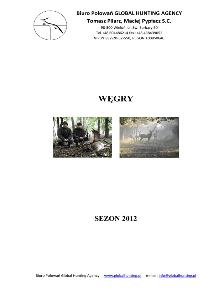 Biuro Polowań GLOBAL HUNTING AGENCY Tomasz Pilarz, Maciej Pypłacz S.C. 98-300 Wieluń, ul. Św. Barbary 50 Tel.+48 604486214 fax.:+48 438439052 NIP:PL 832-20-52-550; REGON 100850646 WĘGRY SEZON 2012 Biuro Polowań Global Hunting Agency www.globalhunting.pl e-mail: [email protected] Polowanie zbiorowe na dziki Polowanie pakietowe na dziki w terenach otwartych 220 km od Budapesztu (rejon Zalakaros). Teren polowania pokryty jest w 50 % lasem. Dominującą zwierzyną jest tu dzik. Grupa 10 myśliwych oddaje przeciętnie 60 -100 strzałów dziennie. Pokoty w zależności od umiejętności myśliwych najczęściej kształtują się w przedziale 20 – 30 dzików. Podczas polowania zbiorowego można pozyskiwać również jelenie – łanie oraz cielęta (odstrzał zwierzyny trofeowej podczas polowań zbiorowych jest na Węgrzech zakazany). Pakiet zawiera 2 dni polowanie na terenach otwartych (nie zagrodowych) Wszystkie niezbędne dokumenty Węgierska licencja myśliwska oraz ubezpieczenie 3 noclegi w kwaterze o standardzie I klasy (pokoje 2 osobowe) Wyżywienie (od kolacji w dniu przyjazdu, do śniadania w dniu odjazdu) Posiłek terenowy w trakcie polowania Transport samochodami podczas polowania Tłumacz podczas polowania (opieka pilota polskiego) Wszystkie pozyskane dziki, łanie oraz cielaki W skład pakietu nie wchodzi: Dopłata do pokoju 1 osobowego – 15 EUR/noc/osobę Pomiar trofeum dla odyńców powyżej 12 cm – 25 EUR/trofeum Ewentualne dostarczenie trofeum do Polski – około 100 EUR/grupę Ewentualny transport z lotniska na kwaterę – ok 100 EUR Napoje oraz napiwki Informacje dodatkowe: Rezerwacja terminu potwierdzona musi zostać przedpłatą w wysokości równowartości 2 500 PLN (przedpłata może zostać zwrócona na 2 miesiące przed początkiem imprezy), pomniejszona o koszty rezygnacji z biletu samolotowego. Wpłaty należy dokonać na konto Biura Polowań Global Hunting Agency w Wieluniu ING Bank Śląski S.A. Oddział w Wieluniu w PLN – w EUR – 17 1050 1937 1000 0090 7337 6007 (w PLN) PL 30 1050 1937 1000 0090 7337 6064 SWIFT - INGBPLPW Każde zwierzę ranne (widoczna farba, ścinka, kości itp.) uznawane jest za pozyskane i musi zostać opłacona w całości. W przypadku alergii na jakiekolwiek pożywienie konieczne jest zgłoszenie tego faktu organizatorowi polowania. Wszelkie płatności związane z organizacją polowania oraz pozyskaną zwierzyną muszą być uregulowane w ostatnim dniu polowania. Biuro Polowań Global Hunting Agency www.globalhunting.pl e-mail: [email protected]