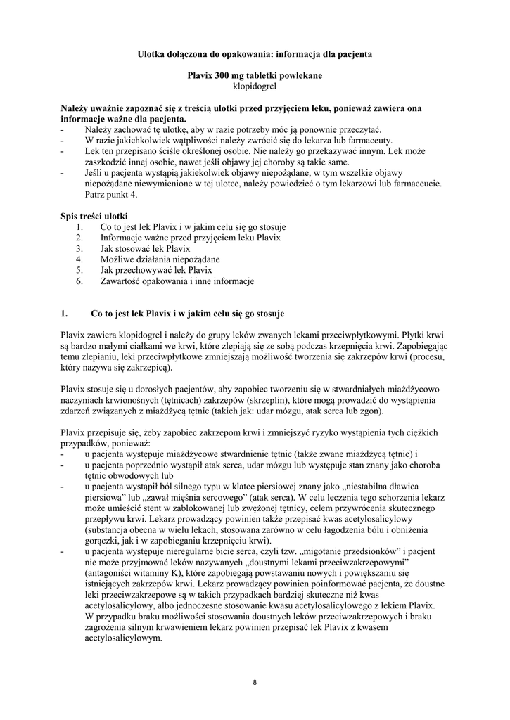 Ulotka dołączona do opakowania: informacja dla pacjenta Plavix 300 mg tabletki powlekane klopidogrel Należy uważnie zapoznać się z treścią ulotki przed przyjęciem leku, ponieważ zawiera ona informacje ważne dla pacjenta. Należy zachować tę ulotkę, aby w razie potrzeby móc ją ponownie przeczytać. W razie jakichkolwiek wątpliwości należy zwrócić się do lekarza lub farmaceuty. Lek ten przepisano ściśle określonej osobie. Nie należy go przekazywać innym. Lek może zaszkodzić innej osobie, nawet jeśli objawy jej choroby są takie same. Jeśli u pacjenta wystąpią jakiekolwiek objawy niepożądane, w tym wszelkie objawy niepożądane niewymienione w tej ulotce, należy powiedzieć o tym lekarzowi lub farmaceucie. Patrz punkt 4. Spis treści ulotki 1. Co to jest lek Plavix i w jakim celu się go stosuje 2. Informacje ważne przed przyjęciem leku Plavix 3. Jak stosować lek Plavix 4. Możliwe działania niepożądane 5. Jak przechowywać lek Plavix 6. Zawartość opakowania i inne informacje 1. Co to jest lek Plavix i w jakim celu się go stosuje Plavix zawiera klopidogrel i należy do grupy leków zwanych lekami przeciwpłytkowymi. Płytki krwi są bardzo małymi ciałkami we krwi, które zlepiają się ze sobą podczas krzepnięcia krwi. Zapobiegając temu zlepianiu, leki przeciwpłytkowe zmniejszają możliwość tworzenia się zakrzepów krwi (procesu, który nazywa się zakrzepicą). Plavix stosuje się u dorosłych pacjentów, aby zapobiec tworzeniu się w stwardniałych miażdżycowo naczyniach krwionośnych (tętnicach) zakrzepów (skrzeplin), które mogą prowadzić do wystąpienia zdarzeń związanych z miażdżycą tętnic (takich jak: udar mózgu, atak serca lub zgon). Plavix przepisuje się, żeby zapobiec zakrzepom krwi i zmniejszyć ryzyko wystąpienia tych ciężkich przypadków, ponieważ: u pacjenta występuje miażdżycowe stwardnienie tętnic (także zwane miażdżycą tętnic) i u pacjenta poprzednio wystąpił atak serca, udar mózgu lub występuje stan znany jako choroba tętnic obwodowych lub u pacjenta wystąpił ból silnego typu w klatce piersiowej znany jako „niestabilna dławica piersiowa” lub „zawał mięśnia sercowego” (atak serca). W celu leczenia tego schorzenia lekarz może umieścić stent w zablokowanej lub zwężonej tętnicy, celem przywrócenia skutecznego przepływu krwi. Lekarz prowadzący powinien także przepisać kwas acetylosalicylowy (substancja obecna w wielu lekach, stosowana zarówno w celu łagodzenia bólu i obniżenia gorączki, jak i w zapobieganiu krzepnięciu krwi). u pacjenta występuje nieregularne bicie serca, czyli tzw. „migotanie przedsionków” i pacjent nie może przyjmować leków nazywanych „doustnymi lekami przeciwzakrzepowymi” (antagoniści witaminy K), które zapobiegają powstawaniu nowych i powiększaniu się istniejących zakrzepów krwi. Lekarz prowadzący powinien poinformować pacjenta, że doustne leki przeciwzakrzepowe są w takich przypadkach bardziej skuteczne niż kwas acetylosalicylowy, albo jednoczesne stosowanie kwasu acetylosalicylowego z lekiem Plavix. W przypadku braku możliwości stosowania doustnych leków przeciwzakrzepowych i braku zagrożenia silnym krwawieniem lekarz powinien przepisać lek Plavix z kwasem acetylosalicylowym. 8 2. Informacje ważne przed przyjęciem leku Plavix Kiedy nie przyjmować leku Plavix • jeśli u pacjenta stwierdzono uczulenie (nadwrażliwość) na klopidogrel lub którykolwiek z pozostałych składników tego leku (wymienionych w punkcie 6), • jeśli u pacjenta występuje stan chorobowy, który obecnie powoduje krwawienie, taki jak: wrzód żołądka lub krwawienie wewnątrz mózgu, • jeśli u pacjenta występuje ciężka choroba wątroby. Jeśli pacjent uważa, że dotyczy go którykolwiek z tych problemów lub ma jakiekolwiek inne wątpliwości, powinien skonsultować się z lekarzem prowadzącym zanim przyjmie lek Plavix. Ostrzeżenia i środki ostrożności Jeśli którakolwiek z sytuacji wymienionych poniżej dotyczy pacjenta, to przed przyjęciem leku Plavix powinien on poinformować o tym lekarza prowadzącego: • jeśli występuje ryzyko krwawienia, takie jak: - stan chorobowy, który powoduje ryzyko wewnętrznego krwawienia (np. wrzód żołądka) zaburzenie krwi usposabiające do wewnętrznego krwawienia (krwawienie wewnątrz tkanek, narządów lub stawów ciała) - ostatnio doznany ciężki uraz - ostatnio przebyty zabieg chirurgiczny (włącznie z zabiegiem stomatologicznym) - planowany w następnych siedmiu dniach zabieg chirurgiczny (włącznie z zabiegiem stomatologicznym) • jeśli u pacjenta stwierdzono zakrzep w tętnicy mózgu (udar niedokrwienny), który wystąpił w ciągu ostatnich siedmiu dni • jeśli u pacjenta występuje choroba nerek lub wątroby • jeśli pacjent miał w przeszłości alergię lub uczulenie na którykolwiek z leków stosowanych w leczeniu tej choroby. Podczas stosowania leku Plavix: • Należy poinformować lekarza, jeśli u pacjenta planowany jest zabieg chirurgiczny (w tym stomatologiczny). • Należy również niezwłocznie poinformować lekarza o występowaniu schorzenia (zwanego zakrzepową plamicą małopłytkową - ang. TTP – Thrombotic Thrombocytopenic Purpura), objawiającego się gorączką i podskórnymi wybroczynami krwawymi, o wyglądzie czerwonych, punktowych plamek występujących z lub bez nie dającego się wyjaśnić uczucia skrajnego zmęczenia, stanem dezorientacji, zażółceniem skóry lub oczu (żółtaczka) (patrz punkt 4 „Możliwe działania niepożądane”). • W przypadku skaleczenia lub zranienia, czas jaki upłynie zanim krwawienie ustanie, może być nieco dłuższy niż zwykle. Jest to związane ze sposobem działania leku, ponieważ zapobiega powstawaniu zakrzepów krwi. Nie sprawia to zwykle kłopotów przy niewielkich skaleczeniach i zranieniach np. skaleczenia w czasie golenia. Tym niemniej, w przypadku wystąpienia krwawienia należy 