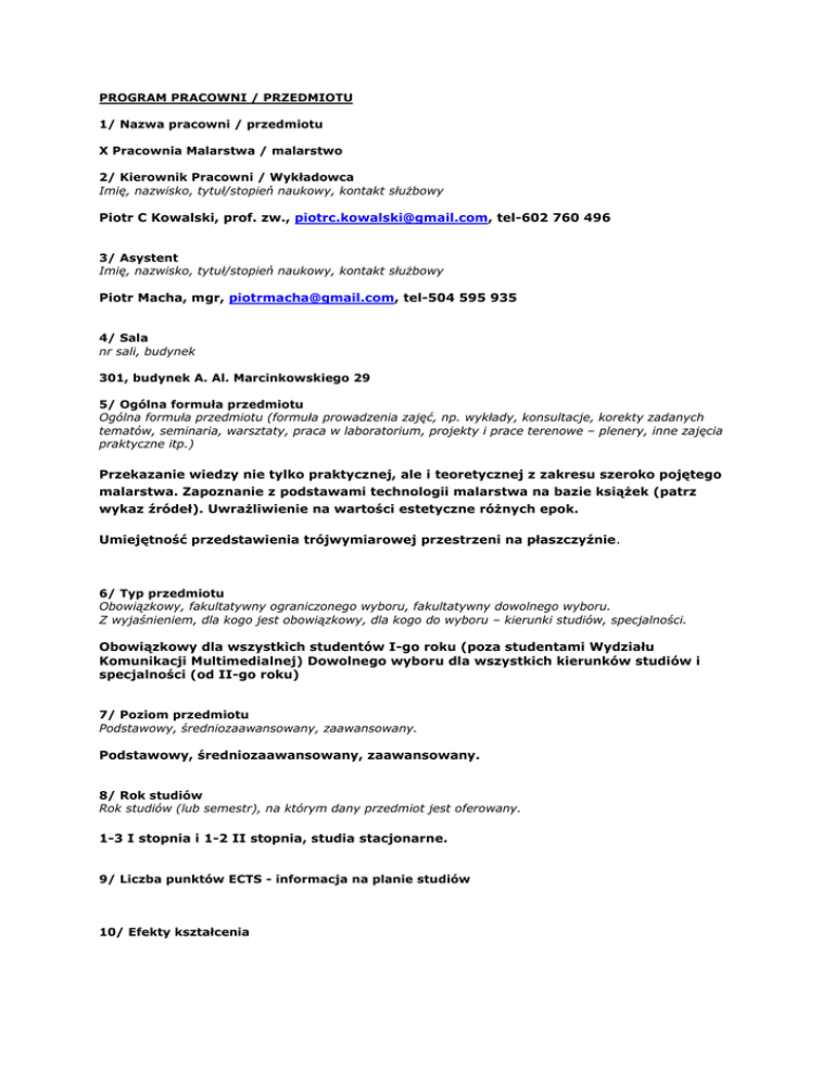 PROGRAM PRACOWNI / PRZEDMIOTU 1/ Nazwa pracowni / przedmiotu X Pracownia Malarstwa / malarstwo 2/ Kierownik Pracowni / Wykładowca Imię, nazwisko, tytuł/stopień naukowy, kontakt służbowy Piotr C Kowalski, prof. zw., [email protected], tel-602 760 496 3/ Asystent Imię, nazwisko, tytuł/stopień naukowy, kontakt służbowy Piotr Macha, mgr, [email protected], tel-504 595 935 4/ Sala nr sali, budynek 301, budynek A. Al. Marcinkowskiego 29 5/ Ogólna formuła przedmiotu Ogólna formuła przedmiotu (formuła prowadzenia zajęć, np. wykłady, konsultacje, korekty zadanych tematów, seminaria, warsztaty, praca w laboratorium, projekty i prace terenowe – plenery, inne zajęcia praktyczne itp.) Przekazanie wiedzy nie tylko praktycznej, ale i teoretycznej z zakresu szeroko pojętego malarstwa. Zapoznanie z podstawami technologii malarstwa na bazie książek (patrz wykaz źródeł). Uwrażliwienie na wartości estetyczne różnych epok. Umiejętność przedstawienia trójwymiarowej przestrzeni na płaszczyźnie. 6/ Typ przedmiotu Obowiązkowy, fakultatywny ograniczonego wyboru, fakultatywny dowolnego wyboru. Z wyjaśnieniem, dla kogo jest obowiązkowy, dla kogo do wyboru – kierunki studiów, specjalności. Obowiązkowy dla wszystkich studentów I-go roku (poza studentami Wydziału Komunikacji Multimedialnej) Dowolnego wyboru dla wszystkich kierunków studiów i specjalności (od II-go roku) 7/ Poziom przedmiotu Podstawowy, średniozaawansowany, zaawansowany. Podstawowy, średniozaawansowany, zaawansowany. 8/ Rok studiów Rok studiów (lub semestr), na którym dany przedmiot jest oferowany. 1-3 I stopnia i 1-2 II stopnia, studia stacjonarne. 9/ Liczba punktów ECTS - informacja na planie studiów 10/ Efekty kształcenia Opis efektów kształcenia ma być zgodny z Krajowymi Ramami Kwalifikacji dla szkolnictwa wyższego i efektami kształcenia zdefiniowanymi dla odpowiedniego obszaru. Opis należy podzielić na 3 oddzielne kategorie: WIEDZĘ, UMIEJĘTNOŚCI, KOMPETENCJE SPOŁECZNE. Jeżeli pracownia funkcjonuje jednocześnie jako kierunkowa oraz uzupełniająca (np. dla studentów z innych wydziałów lub kierunków) i programy tych zajęć różnią się, efekty kształcenia muszą być rozpisane oddzielnie. Wiedza Wykłady poprzedzające ćwiczenie w celu wprowadzenia w realizacje konkretnych tematów. Umożliwienie świadomego wykorzystania wiedzy teoretycznej we własnej twórczości. Konfrontacja z pracami innych. Umiejętności Świadome wykorzystanie zdobytej wiedzy nie tylko praktycznej, ale i teoretycznej z zakresu szeroko pojętego malarstwa. Umiejętność samodzielnego realizowania obrazów w różnych technikach malarskich na różnych podłożach. Wypracowanie indywidualnego języka wypowiedzi przez poszczególnych studentów, poprzez odpowiednią interpretację ćwiczeń i pod kątem ich predyspozycji. Po zakończeniu realizacji danego tematu każdorazowo przeprowadzanie nie tylko indywidualnych korekt, ale i wspólne omawianie prac poprzez analizę porównawczą. Praca w pracowni, w plenerze i samodzielnie w domu. Kompetencje społeczne Studenci zdobywają umiejętność prezentowania swoich prac i porównywania ich z innymi dzięki czemu nabywają także umiejętności samooceny oraz konstruktywnej krytyki w stosunku do działań innych osób. Jeśli dany przedmiot wpisany jest do planu na studiach I i II stopnia - Ankiety muszą być przygotowane oddzielnie. Jeżeli prowadzący może być konsultantem na studiach II stopnia wypełnia Ankietę konsultanta. 11/ Wymagania wstępne W przypadku zaistnienia konieczności wykazania się przez studenta określonymi kompetencjami. Znajomość i rozumienie kluczowych zagadnień dotyczących malarstwa 12/ Treści merytoryczne przedmiotu Jasny i zwięzły opis przedmiotu pozwalający określić jego zakres tematyczny. Uwrażliwienie na specyficzny język wypowiedzi malarstwa. Poznanie różnych konwencji artystycznych występujących na przestrzeni wielu epok (różnice i podobieństwa ). Logiczne powiązanie różnorodnych zjawisk artystycznych i dokonywanie ich krytycznej analizy. Umiejętność przedstawienia trójwymiarowej przestrzeni na płaszczyźnie. Wzbogacanie warsztatu malarskiego poprzez poszukiwanie efektów wyrazowych specyficznych dla danej techniki ( akwarela, gwasz, olej, tempera, akryl, pastele…) poprzez kolor , linię, plamę, fakturę, skalę, kontrast, narzędzie, podłoże, czas, miejsce , temperaturę…Zapoznanie się z literaturą dotyczącą problemów malarstwa ( patrz wykaz źródeł ) Przykładowe tematy na rok 2016/17 : KOŁO BARW - Przeprowadzić wnikliwą analizę kolorów posiadanych farb (oleje, akryle, tempery ..., lub z kolorów znajdujących się na różnych przedmiotach). Ćwiczenie to należy zrealizować na podobraziu w kształcie koła. Format dowolny. JA I JA - W ćwiczeniu tym należy nawiązać dialog z pierwszym (jednym z pierwszych) swoim rysunkiem lub obrazkiem z dzieciństwa. 1:1 ALBO KAMUFLAŻ - Namalować obraz tak, aby w wybranym przez siebie miejscu był niewidoczny, tak aby scalił się z otoczeniem. Malowany obraz powinien przedstawiać konkretny fragment świadomie wybranej rzeczywistości wewnątrz albo na zewnątrz. W tym ćwiczeniu bardzo ważna jest dobra dokumentacja fotograficzna, wykonana zarówno przed realizacją, w trakcie, jak i po jej zakończeniu.Format dowolny, kształt dowolny, technika malarska dowolna np. olej, akryl lub techniki mieszane . LUDZIE, PTAKI, ZWIERZĘTA POWTÓRKA Z HISTORII SZTUKI - Połączyć ze sobą minimum 2 obrazy zaczerpnięte z historii sztuki, szczególnie malarstwa ( format dowolny, technika dowolna, kształt dowolny ). Celem ćwiczenia jest poznanie twórczości innych artystów, oraz problem powtórzenia w historii sztuki zaprezentowany na podstawie dzieł artystów z różnych epok. CODZIENNOŚĆ - Interpretacja tego tematu dowolna, uwzględniająca zarówno miejsce jak i czas. Ćwiczenie to dobierane jest do zainteresowań konkretnych