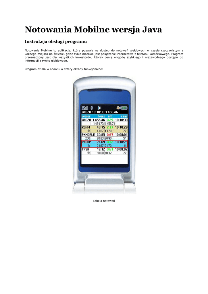 Notowania Mobilne wersja Java Instrukcja obsługi programu Notowania Mobilne to aplikacja, która pozwala na dostęp do notowań giełdowych w czasie rzeczywistym z każdego miejsca na świecie, gdzie tylko możliwe jest połączenie internetowe z telefonu komórkowego. Program przeznaczony jest dla wszystkich inwestorów, którzy cenią wygodę szybkiego i niezawodnego dostępu do informacji z rynku giełdowego. Program działa w oparciu o cztery ekrany funkcjonalne: Tabela notowań Informacje dodatkowe Lista transakcji Wykres waloru Nawigacja w programie Program Notowania Mobilne wersja Java w zależności od rozdzielczości ekranu telefonu, na którym jest instalowany, automatycznie dostosowuje ilość kolumn w Tabeli, tak aby dostarczać jak najwięcej informacji, a jednocześnie zachować czytelność ekranu. Szerokość i układ kolumn (również ich widoczność) może być dowolnie konfigurowana przez użytkownika. Ogólna obsługa programu odbywa się przy użyciu podstawowych klawiszy telefonu: lewy klawisz programowy (przycisk umieszczony pod ekranem telefonu, po lewej stronie) prawy klawisz programowy (analogicznie, po prawej stronie) joystick (czterokierunkowy klawisz nawigacyjny) Szybkie przełączanie pomiędzy ekranami programu możliwe jest przy użyciu klawiszy numerycznych od 1 do 4. Na wybranych ekranach (szczegóły w Pomocy) dostępne są również dodatkowo klawisze: 6, 8 oraz 0. Pomoc do programu Notowania Mobilne Jak zainstalować Notowania Mobilne? Informacje podstawowe Ustawienia parametrów połączenia Nawiązanie połączenia Konfiguracja Tabeli Modyfikacja kolumn w Tabeli Ustawienia Wykresu Pozostałe ustawienia Jak zainstalować Notowania Mobilne? Uruchom w telefonie komórkowym przeglądarkę internetową i otwórz mobilne.pl/dibre/dibrenom.jar. Automatycznie zostanie rozpoczęty proces pobierania pliku instalacyjnego. adres: http://notowania- Dalej postępuj zgodnie z komunikatami jakie będę wyświetlane podczas instalacji. W przypadku niektórych modeli telefonów komórkowych może zostać wyświetlony komunikat informujący o tym, aplikacja nie jest zaufana lub o braku podpisu cyfrowego pobranego pliku. W takiej sytuacji należy pominąć komunikat i kontynuować instalację dalej. Po pomyślnym ukończeniu instalacji, program umieszczony będzie w menu, gdzie dostępne są inne aplikacje telefonu komórkowego. W zależności od modelu telefonu mogą to być grupy o różnych nazwach (np. Aplikacje, Instalacje, Osobiste itp.) Informacje podstawowe Podczas pierwszego startu programu, na ekranie powitalnym zostanie wyświetlony komunikat Dalej, który należy zaakceptować lewym klawiszem nawigacyjnym telefonu. Przy każdym otwarciu programu wyświetlone są etykiety opisujęce klawisze nawigacyjne telefonu, które po kilku sekundach znikają. Ustawienia parametrów połączenia Przed pierwszym połączeniem w programie, należy ustalić parametry połączenia. W tym celu wybierz z menu USTAWIENIA pozycję UŻYTKOWNIK, a następnie wpisz nazwę użytkownika oraz hasło. W polu UŻYTKOWNIK wpisz Twój login, którego używasz do logowania w serwisie BRe Brokers. W polu Hasło wpisz 6 ostatnich cyfr Twojego numeru PESEL. Nawiązanie połączenia Po wybraniu z menu POŁĄCZ następuje nawiązanie połączenia z serwerem. Świadczą o tym komunikaty jakie są wyświetlane w lewym górnym rogu ekranu programu: Łączenie z Bramą #1, Łączenie z (adres IP serwera), Autoryzacja, Inicjalizacja danych, Połączony. Pomyślny proces połączenia potwierdzony jest komunikatem Zalogowany oraz stusem Połączony, który wyświetlony jest w nagłówku okna. Program odbiera dane o notowaniach przez cały czas. Proces ten można przerwać wybierając z menu ROZŁĄCZ. Po zatwierdzeniu polecenia, program zostanie rozłączony, co zostanie potwierdzone komunikatem Rozłączony. Konfiguracja Tabeli Domyślnie pierwszy ekran programu nie zawiera żadnych walorów. Należy je umieścić zgodnie z własnymi potrzebami. Wybierz z menu TABELA pozycję DODAJ WALOR. Lista instrumentów dostępnych w programie podzielona jest na kilka grup. Otwórz na przykład INDEKSY i korzystająć z joysticka zaznacz pozycję WIG20 i umieść w Tabeli zatwierdzając klawiszem OK. Analogicznie postępuj z innymi walorami, tak aby uzupełnić Tabelę o walory, których notowania chcesz obserwować. Korzystając z klawiszy 4 i 6 możesz szybko przewijać kolumny z walorami w lewo i w prawo. Jeżeli potrzebujesz usunąć walor z Tabeli, zaznacz go Wskaźnikiem Pozycji i wybierz z menu TABELA pozycję USUŃ WALOR. Potwierdz ten zamiar klawiszem TAK. Dla każdego waloru można rozwinąć jego ilość wierszy w Tabeli, tak aby prezentowane były w nich kolejne linie ofert. Zaznacz Wskaźnikiem Pozycji interesujący Cię walor i wybierz z menu TABELA pozycję LINIE OFERT WALORU. Masz do dyspozycji do 5 wierszy, w których będą wyświetlane kolejne liniie ofert. To ile będzie z nich wypełnionych notowaniami zależy od warunków oferty dostawcy notowań. Korzystając z klawiszy 8 i 0 możesz szybko przewijać wiersze z walorami w górę lub w dół. Możesz również w szybki sposób ustawić liczbę linii ofert dla wszystkich walorów jednocześnie. Z menu TABELA wybierz LINIE OFERT WSZYSTKICH i wybierz ich liczbę. Zmiana zostanie zastosowana do wszystkich walorów jakie są aktualnie umieszczone w Tabeli. Modyfikacja kolumn w Tabeli Program pozwala na ustawianie widoczności kolumn oraz ich szerokości. W menu TABELA pod pozycją KOLUMNY dostępne są dodatkowe pozycje: SZEROKOŚĆ i USTAWIENIA. Zmiana szerokości możliwa jest po przejściu joystickiem (lewo-prawo) do wybranej kolumny, a następnie również joystickiem jest zwiększana (przycisk do góry) lub zmniejszana (przycisk w dół) szerokość kolumny. Na ekran z ustawieniami ukrywania kolumn należy poruszać się w pionie korzytając z przycisków góra-dól joysticka, a pozycje zaznaczać przysikiem OK joysticka. Kolumny mogą m