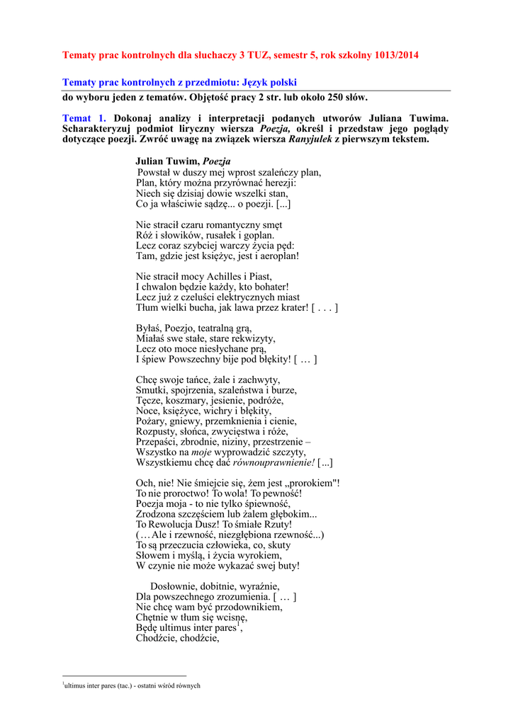 Tematy prac kontrolnych dla słuchaczy 3 TUZ, semestr 5, rok szkolny 1013/2014 Tematy prac kontrolnych z przedmiotu: Język polski do wyboru jeden z tematów. Objętość pracy 2 str. lub około 250 słów. Temat 1. Dokonaj analizy i interpretacji podanych utworów Juliana Tuwima. Scharakteryzuj podmiot liryczny wiersza Poezja, określ i przedstaw jego poglądy dotyczące poezji. Zwróć uwagę na związek wiersza Ranyjulek z pierwszym tekstem. Julian Tuwim, Poezja Powstał w duszy mej wprost szaleńczy plan, Plan, który można przyrównać herezji: Niech się dzisiaj dowie wszelki stan, Co ja właściwie sądzę... o poezji. [...] Nie stracił czaru romantyczny smęt Róż i słowików, rusałek i goplan. Lecz coraz szybciej warczy życia pęd: Tam, gdzie jest księżyc, jest i aeroplan! Nie stracił mocy Achilles i Piast, I chwalon będzie każdy, kto bohater! Lecz już z czeluści elektrycznych miast Tłum wielki bucha, jak lawa przez krater! [ . . . ] Byłaś, Poezjo, teatralną grą, Miałaś swe stałe, stare rekwizyty, Lecz oto moce niesłychane prą, I śpiew Powszechny bije pod błękity! [ … ] Chcę swoje tańce, żale i zachwyty, Smutki, spojrzenia, szaleństwa i burze, Tęcze, koszmary, jesienie, podróże, Noce, księżyce, wichry i błękity, Pożary, gniewy, przemknienia i cienie, Rozpusty, słońca, zwycięstwa i róże, Przepaści, zbrodnie, niziny, przestrzenie – Wszystko na moje wyprowadzić szczyty, Wszystkiemu chcę dać równouprawnienie! [ ...] Och, nie! Nie śmiejcie się, żem jest „prorokiem"! To nie proroctwo! To wola! To pewność! Poezja moja - to nie tylko śpiewność, Zrodzona szczęściem lub żalem głębokim... To Rewolucja Dusz! To śmiałe Rzuty! ( … Ale i rzewność, niezgłębiona rzewność...) To są przeczucia człowieka, co, skuty Słowem i myślą, i życia wyrokiem, W czynie nie może wykazać swej buty! Dosłownie, dobitnie, wyraźnie, Dla powszechnego zrozumienia. [ … ] Nie chcę wam być przodownikiem, Chętnie w tłum się wcisnę, Będę ultimus inter pares1, Chodźcie, chodźcie, 1 ultimus inter pares (tac.) - ostatni wśród równych O, rozmaici, oddzielni, wszyscy współcześni! Muzyka gra marsza! O, żywe, porywające, radosne akordy! Co się dzieje! Co się dzieje! Nauczyłem się cudownej pieśni, Tryumfuję, szaleję z radości, Upiłem się światem Bożym, Pokochałem ostateczną miłością, Za pan brat jestem z nieskończonością! Chodźcie, chodźcie! [...] Julian Tuwim, Ranyjulek Powinienem z wiatrami po ulicach się włóczyć, W tłoku miast, podchmielony, najradośniej się chwiać, Od andrusów, dryndziarzy powinienem się uczyć Gwizdać, kląć, pohukiwać na psiakrew i psiamać! Od rynsztoka do ściany zygzakami się toczyć, Ranyjulek! swobodny, bezpański, jak pies! Sińce łapać na słupach, w zbiegowiskach się tłoczyć, Na parkany wdrapywać się wiosną po bez! I kapelusz dziurawy liliowymi kwiatami Na swą chwałę ustroić i na chwałę swą chlać, I znów w kwiatach się włóczyć po ulicach z wiatrami, Podnieś łeb, gwiazdy łykać i na nogach się chwiać! J. Tuwim, Wiersze wybrane, Wrocław 1986 Temat 2. Analizując podane fragmenty powieści Zofii Nałkowskiej Granica, przedstaw obraz Justyny i jej związku z Zenonem w oczach różnych bohaterów powieści. W kontekście całej powieści wyjaśnij, jakie konsekwencje wynikają z zestawienia odmiennych spojrzeń na bohaterów i relacje między nimi. Fragment 1. Z dawnych czasów pamiętał Zenon niezrozumiałą przy jej zasadach tolerancję matki. Trzymała we dworze rozmaite dziewczyny, które były jawnie kochankami ojca. Często, jakby czemuś na przekór, wychwalała nawet rozmaite ich zalety. Może, iż nie chciała być pomówiona o rzecz tak jej niegodną jak zazdrość. [...] Teraz Justyna była po prostu jej ulubienicą, jej „prawą ręką”. Mówiła o niej z Zenonem, jak gdyby nie raczyła wcale dostrzegać, na co się zanosiło. Zenon pochmurniał i nic nie odpowiadał. Nie chciał już dociekać tej sprawy tak niejasnej, tak niepokojącej. Bez zgody na to korzystał jednak z jej dobrych stron. [...] Pani Żancia mówiła, że na Justynie wcale nie znać gminnego pochodzenia, mówiła: „Skąd ta dziewczyna ma tyle rasy”. Jemu to było wszystko jedno. Nie myślał nawet, czy jest ładna. Ale niczego nie chciałby w niej zmienić, niczego nie potrzebował jej wybaczać. W ruchu, w spoczynku, w każdym geście była w obrębie wyznaczonego sobie celu i życiowego zamierzenia fizycznie doskonała. Gdy stała blisko, chciał ją wziąć do rąk, chciał ją po prostu mieć. A wtedy ona mówiła: „Pan nie jest taki, jak drugi, co to nie da dziewczynie przejść spokojnie”. I opowiadała o Franku Borbockim, który ją prześladował i nie wiadomo co sobie wyobrażał. Bo ona nie jest znów taka głupia. Fragment 2. Siedziała przed nim ta sama i jedna, a Zenon właściwie widział ją coraz to inaczej. Przez chwilę wydawała mu się tylko jakąś cudzą służącą, której poufała obecność jest niewytłumaczona i kłopotliwa. Zaraz później była natrętną kochanką, z którą za wszelką cenę trzeba było zerwać. I wreszcie stawała się Justyną, miłą i dobrą dziewczyną z Boleborzy, której los jednak dotąd żywo go obchodził. I on sam, odpowiednio do tych jej zmiennych jakości, stawał się kolejno kimś innym. Jakąś cząstką siebie pamiętał teraz, jak jeszcze tam 2 mówiła: „Dla ciebie, Zenon, ja poszłabym nie wiem na jakie męki, nic mi nie strach, o nic nie dbam”. [...] I tak rzecz cała ułożyła się ściśle według wiadomego schematu: dziewczyna wiejska i panna z mieszczańskiej kamienicy, narzeczona i kochanka, miłość idealna i zmysły. A przecież wyglądało tak tylko z zewnątrz, jakby przez ironię losu, czysty zbieg okoliczności. Zenon bronił się przed tym skonstatowaniem, czuł na pewno, że istotna prawda jest inna. Przede wszystkim nic nie byłoby się stało, gdyby nie t