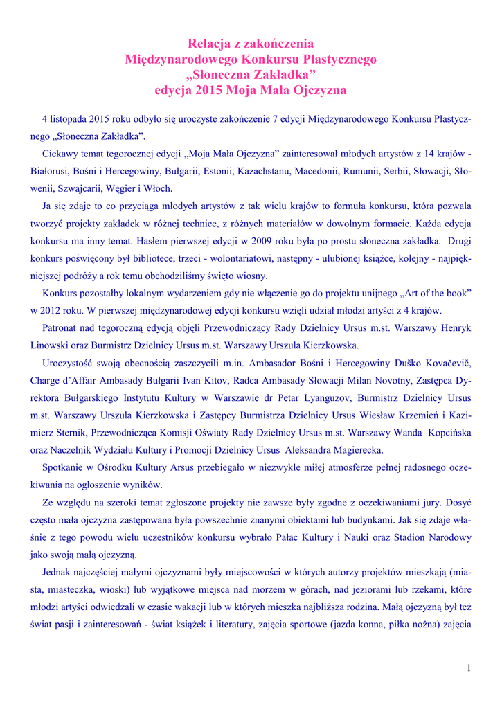 Relacja z zakończenia Międzynarodowego Konkursu Plastycznego „Słoneczna Zakładka” edycja 2015 Moja Mała Ojczyzna 4 listopada 2015 roku odbyło się uroczyste zakończenie 7 edycji Międzynarodowego Konkursu Plastycznego „Słoneczna Zakładka”. Ciekawy temat tegorocznej edycji „Moja Mała Ojczyzna” zainteresował młodych artystów z 14 krajów Białorusi, Bośni i Hercegowiny, Bułgarii, Estonii, Kazachstanu, Macedonii, Rumunii, Serbii, Słowacji, Słowenii, Szwajcarii, Węgier i Włoch. Ja się zdaje to co przyciąga młodych artystów z tak wielu krajów to formuła konkursu, która pozwala tworzyć projekty zakładek w różnej technice, z różnych materiałów w dowolnym formacie. Każda edycja konkursu ma inny temat. Hasłem pierwszej edycji w 2009 roku była po prostu słoneczna zakładka. Drugi konkurs poświęcony był bibliotece, trzeci - wolontariatowi, następny - ulubionej książce, kolejny - najpiękniejszej podróży a rok temu obchodziliśmy święto wiosny. Konkurs pozostałby lokalnym wydarzeniem gdy nie włączenie go do projektu unijnego „Art of the book” w 2012 roku. W pierwszej międzynarodowej edycji konkursu wzięli udział młodzi artyści z 4 krajów. Patronat nad tegoroczną edycją objęli Przewodniczący Rady Dzielnicy Ursus m.st. Warszawy Henryk Linowski oraz Burmistrz Dzielnicy Ursus m.st. Warszawy Urszula Kierzkowska. Uroczystość swoją obecnością zaszczycili m.in. Ambasador Bośni i Hercegowiny Duško Kovačevič, Charge d’Affair Ambasady Bułgarii Ivan Kitov, Radca Ambasady Słowacji Milan Novotny, Zastępca Dyrektora Bułgarskiego Instytutu Kultury w Warszawie dr Petar Lyanguzov, Burmistrz Dzielnicy Ursus m.st. Warszawy Urszula Kierzkowska i Zastępcy Burmistrza Dzielnicy Ursus Wiesław Krzemień i Kazimierz Sternik, Przewodnicząca Komisji Oświaty Rady Dzielnicy Ursus m.st. Warszawy Wanda Kopcińska oraz Naczelnik Wydziału Kultury i Promocji Dzielnicy Ursus Aleksandra Magierecka. Spotkanie w Ośrodku Kultury Arsus przebiegało w niezwykle miłej atmosferze pełnej radosnego oczekiwania na ogłoszenie wyników. Ze względu na szeroki temat zgłoszone projekty nie zawsze były zgodne z oczekiwaniami jury. Dosyć często mała ojczyzna zastępowana była powszechnie znanymi obiektami lub budynkami. Jak się zdaje właśnie z tego powodu wielu uczestników konkursu wybrało Pałac Kultury i Nauki oraz Stadion Narodowy jako swoją małą ojczyzną. Jednak najczęściej małymi ojczyznami były miejscowości w których autorzy projektów mieszkają (miasta, miasteczka, wioski) lub wyjątkowe miejsca nad morzem w górach, nad jeziorami lub rzekami, które młodzi artyści odwiedzali w czasie wakacji lub w których mieszka najbliższa rodzina. Małą ojczyzną był też świat pasji i zainteresowań - świat książek i literatury, zajęcia sportowe (jazda konna, piłka nożna) zajęcia 1 muzyczne, plastyczne, teatralne a także ulubione zwierzęta domowe (koty, psy) oraz ulubione kluby i instytucje kulturalne. Ze względu na dużą ilość nadesłanych projektów jury konkursu oceniało zgłoszone prace w kategorii generalnej i kategorii narodowej w 15 grupach wiekowych i w grupie Specjalnych Ośrodków SzkolnoWychowawczych. Wśród laureatów tegorocznej edycji znaleźli się uczniowie z Ursusa: Ewelina Niedziółka - III miejsce, grupa wiekowa 9 lat, kategoria narodowa, Szkoła Podstawowa Nr 4, Warszawa-Ursus, praca bez tytułu Patrycja Gaust, wyróżnienie, grupa wiekowa 9 lat, kategoria narodowa, Szkoła Podstawowa nr 4, Warszawa-Ursus, tytuł pracy „Krajobraz Polski” Karolina Górecka – wyróżnienie, grupa wiekowa 8 lat, kategoria narodowa, Biblioteka Skorosze, War- szawa-Ursus, tytuł pracy „Pałac Kultury” Wiktoria Jasek, II miejsce, grupa wiekowa 11 lat, kategoria narodowa, SP 4, Warszawa-Ursus, tytuł pracy „Warszawa, Starówka” Claudia Babled, wyróżnienie, grupa wiekowa 12 lat, kategoria narodowa, SP 4, Warszawa-Ursus, tytuł pracy „Park Achera” Anna Kaczkowska, wyróżnienie, grupa wiekowa 14 lat, zgłoszenie indywidualne, kategoria narodowa Warszawa-Ursus, tytuł pracy „Szkoła, harcerstwo, klub pływacki” Czołowe miejsca w konkursie zajęli młodzi artyści z polskich i zagranicznych ośrodków edukacyjnoartystycznych o ustalonej renomie takich jak: DDK Bronowice z Lublina, MDK Żyrardów, Pałac Młodzieży w Warszawie, Zespoły Szkół Plastycznych z Radomia, Zielonej Góry i Koszalina, Galeria Aartystyczna w Ruse w Bułgarii, Pracownia „Mrowisko” z Witebska i Narodowe Centrum Twórczości Dziecięcej i Młodzieżowej z Mińska na Białorusi czy wreszcie Podstawowa Szkoła Artystyczna w Berettyóújfalu na Węgrzech. Również zgłoszenia indywidualne zaowocowały bardzo dobrymi projektami np.: Alicji Rak, Kingi Dudko, Barbary Szymańskiej czy Alicji Pudo. Niezwykle ciekawie zaprezentowali swoją małą ojczyznę artyści z Bośnia i Hercegowiny w postaci cyklu wysmakowanych artystycznie prac graficznych poświęconych różnym scenom z życia codziennego okolicy w której mieszkają. Natomiast uczniowie z międzynarodowych szkół w Kazachstanie, Szwajcarii i Serbii małymi ojczyznami nazwali kraje z których pochodzą. Byli to Amerykanie, Koreańczycy, Japończycy i Rosjanie. Widać było w ich pracach prawdziwe przywiązanie młodych ludzi do ojczystych stron. Niestety poziom artystyczny tych prac był niewystarczający. Największe uznanie jury zdobyła praca Mirosława Nadobnika „Moja Mała Ojczyzna - Sulęcin” za którą autor otrzymał Grand Prix. W opinii jurorów projekt niezwykle pięknie i wyjątkowo trafnie oddaje tematykę konkursu. Artysta swoją małą ojczyznę Sulęcin przedstawił jako glob ziemski i jako miejsce, które dobrze zna i jest mu bliskie. Jury oceniając pracę Mirosława Nadobnika zwróciło uwagę na bardzo dobre malar2 stwo, które połączone z elementami naklejanymi na przestrzennej kuli przyniosło bardzo efektowny rezultat. Praca została nagrod