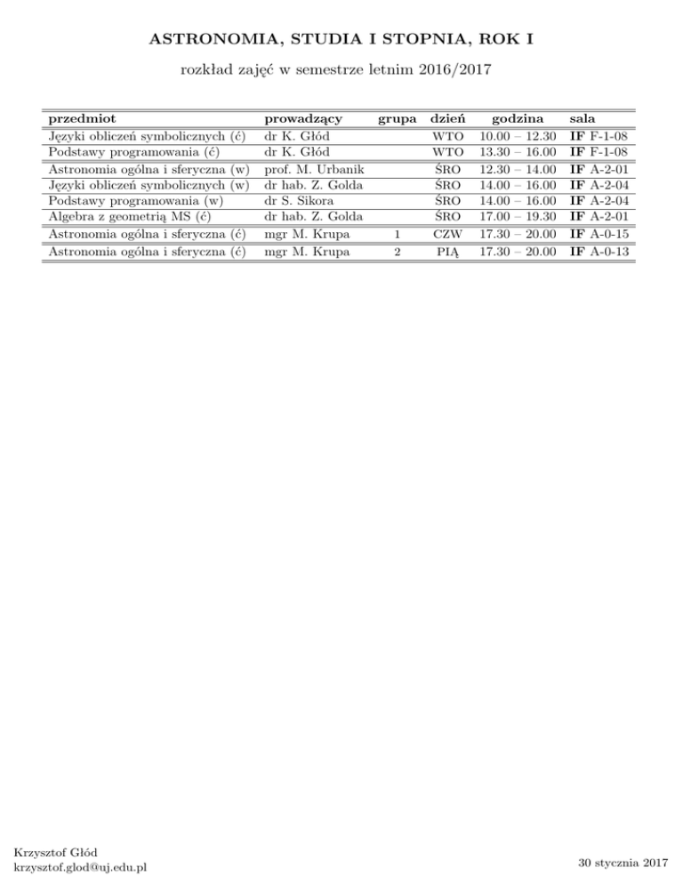 ASTRONOMIA, STUDIA I STOPNIA, ROK I rozkład zajęć w semestrze letnim 2016/2017 przedmiot Języki obliczeń symbolicznych Podstawy programowania (ć) Astronomia ogólna i sferyczna Języki obliczeń symbolicznych Podstawy programowania (w) Algebra z geometrią MS (ć) Astronomia ogólna i sferyczna Astronomia ogólna i sferyczna Krzysztof Głód [email protected] (ć) (w) (w) (ć) (ć) prowadzący grupa dr K. Głód dr K. Głód prof. M. Urbanik dr hab. Z. Golda dr S. Sikora dr hab. Z. Golda mgr M. Krupa 1 mgr M. Krupa 2 dzień WTO WTO ŚRO ŚRO ŚRO ŚRO CZW PIĄ godzina 10.00 – 12.30 13.30 – 16.00 12.30 – 14.00 14.00 – 16.00 14.00 – 16.00 17.00 – 19.30 17.30 – 20.00 17.30 – 20.00 sala IF F-1-08 IF F-1-08 IF A-2-01 IF A-2-04 IF A-2-04 IF A-2-01 IF A-0-15 IF A-0-13 30 stycznia 2017 ASTRONOMIA, STUDIA I STOPNIA, ROK II rozkład zajęć w semestrze letnim 2016/2017 przedmiot Astrofizyka obserwacyjna I (w) Matem. metody fizyki i astrofizyki I (ć) Astrofizyka teoretyczna I (w) Astrofizyka teoretyczna I (ć) Metody numeryczne (ć) Matem. metody fizyki i astrofizyki I (w) Krzysztof Głód [email protected] prowadzący dr hab. W. Waniak dr K. Głód prof. M. Szydłowski prof. M. Szydłowski dr S. Sikora dr hab. Z. Golda grupa dzień PON PON WTO WTO CZW PIĄ godzina 08.00 – 10.00 10.00 – 12.00 14.15 – 15.45 16.00 – 17.30 16.00 – 19.00 14.00 – 16.30 sala IF A-2-07 IF A-2-07 OA FD OA FD IF G-1-10 IF F-1-04 30 stycznia 2017 ASTRONOMIA, STUDIA I STOPNIA, ROK III rozkład zajęć w semestrze letnim 2016/2017 przedmiot Radioastronomia II (ć) Radioastronomia II (w) Astrofizyka obserwacyjna II (w) Astrofizyka teoretyczna II (w) Pracownia astrofizyki obserwacyjnej II (ć) Astrofizyka teoretyczna II (ć) Krzysztof Głód [email protected] prowadzący grupa dr hab. M. Jamrozy dr hab. K. Chyży prof. S. Zoła prof. L. Sokołowski prof. S. Zoła dr hab. W. Waniak mgr M. Pasierb mgr S. Kurowski dr hab S. Szybka dzień ŚRO godzina 14.15 – 15.45 16.00 – 17.30 17.45 – 19.15 08.00 – 10.00 19.00 – 22.00 CZW 10.00 – 12.00 IF A-2-04 PON PON PON WTO sala OA FD OA DSW OA DSW IF A-1-04 OA PK 30 stycznia 2017 ASTRONOMIA, STUDIA II STOPNIA, ROK I rozkład zajęć w semestrze letnim 2016/2017 przedmiot Astr. gwiazd. i pozagal. II (ć) Wsp. met. obs. w astrofizyce (w) Mechanika nieba II (w) Astr. gwiazd. i pozagal. II (w) Wsp. met. obs. w astrofizyce (ć) Mechanika nieba II (ć) Wst. do astrofizyki wys. en. (w) Wst. do astrofizyki wys. en. (ć) Wykład specjalistyczny I (w) Seminarium II (ć) Symulacje komputerowe (w) Symulacje komputerowe (ć) Krzysztof Głód [email protected] prowadzący grupa dr S. Sikora prof. M. Urbanik dr hab. M. Jamrozy dr hab. A. Pollo dr D. Kozieł-Wierzbowska dr hab. W. Waniak prof. M. Ostrowski dr hab. Ł. Stawarz dr hab. G. Siemieniec-Oziębło dr hab. G. Siemieniec-Oziębło dr hab. M. Soida dr hab. M. Soida dzień PON PON PON PON WTO WTO ŚRO ŚRO ŚRO ŚRO CZW CZW godzina 09.00 – 10.30 10.45 – 12.15 12.30 – 14.00 14.15 – 15.45 09.00 – 10.30 10.45 – 12.15 09.00 – 10.30 10.45 – 12.15 12.30 – 14.00 14.15 – 15.45 17.00 – 17.45 17.45 – 20.00 sala OA DSW OA DSW OA DSW OA DSW OA PK OA FD OA DSW OA DSW OA DSW OA DSW IF F-1-08 IF F-1-08 30 stycznia 2017 ASTRONOMIA, STUDIA II STOPNIA, ROK II rozkład zajęć w semestrze letnim 2016/2017 przedmiot Seminarium IV (ć) Wykład monograficzny (w) Wykład specjalistyczny IV (w) Wykład monograficzny (w) Krzysztof Głód [email protected] prowadzący dr hab. K. Chyży dr hab. A. Pollo prof. L. Sokołowski dr S. Sikora grupa dzień PON PON ŚRO CZW godzina 14.15 – 15.45 16.00 – 17.30 16.00 – 18.00 14.00 – 15.30 sala OA FG OA FG IF A-1-04 IF A-1-04 30 stycznia 2017 ASTRONOMIA, STUDIA III STOPNIA rozkład zajęć w semestrze letnim 2016/2017 przedmiot Wykład dla doktorantów (w) Ćwiczenia dla doktorantów (ć) Seminarium dla doktorantów (ć) Krzysztof Głód [email protected] prowadzący grupa dr hab. Ł. Stawarz dr hab. Ł. Stawarz prof. M. Ostrowski dzień WTO WTO PIĄ godzina 09.00 – 10.30 10.45 – 12.15 14.00 – 15.30 sala OA DSW OA DSW OA FG 30 stycznia 2017