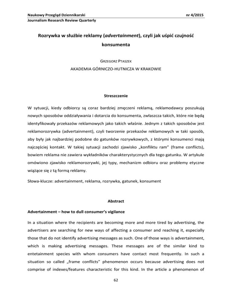 Naukowy Przegląd Dziennikarski Journalism Research Review Quarterly nr 4/2015 Rozrywka w służbie reklamy (advertainment), czyli jak uśpid czujnośd konsumenta GRZEGORZ PTASZEK AKADEMIA GÓRNICZO-HUTNICZA W KRAKOWIE Streszczenie W sytuacji, kiedy odbiorcy są coraz bardziej zmęczeni reklamą, reklamodawcy poszukują nowych sposobów oddziaływania i dotarcia do konsumenta, zwłaszcza takich, które nie będą identyfikowały przekazów reklamowych jako takich właśnie. Jednym z takich sposobów jest reklamorozrywka (advertainment), czyli tworzenie przekazów reklamowych w taki sposób, aby były jak najbardziej podobne do gatunków rozrywkowych, z którymi konsumenci mają najczęściej kontakt. W takiej sytuacji zachodzi zjawisko „konfliktu ram” (frame conflicts), bowiem reklama nie zawiera wykładników charakterystycznych dla tego gatunku. W artykule omówiono zjawisko reklamorozrywki, jej typy, mechanizm odbioru oraz problemy etyczne wiążące się z tą formą reklamy. Słowa-klucze: advertainment, reklama, rozrywka, gatunek, konsument Abstract Advertainment – how to dull consumer’s vigilance In a situation where the recipients are becoming more and more tired by advertising, the advertisers are searching for new ways of affecting a consumer and reaching it, especially those that do not identify advertising messages as such. One of those ways is advertainment, which is making advertising messages. These messages are of the similar kind to entetainment species with whom consumers have contact most frequently. In such a situation so called „frame conflicts” phenomenon occurs because advertising does not comprise of indexes/features characteristic for this kind. In the article a phenomenon of 62 Naukowy Przegląd Dziennikarski Journalism Research Review Quarterly nr 4/2015 advertainment, its models, a perception mechanism and ethical problems connected with this type of advertising are discussed. Keywords: advertainment, advertisement, entertainment, genre, consumer I. CZYNNIKI WPŁYWAJĄCE NA ZMIANĘ PODEJŚCIA DO REKLAMY Przez wiele lat uważano, że konsument, podejmując określone decyzje zakupowe, postępuje w sposób racjonalny i przemyślany. Konsekwencją takiego sposobu myślenia w marketingu było stworzenie modelu (zwanego modelem EKB)1 składającego się z pięciu etapów, przez które przejście gwarantuje konsumentowi sukces decyzyjny: rozpoznanie problemu (wzbudzenie potrzeby konsumenckiej), poszukiwanie informacji (dostępne możliwości wyboru, np. dzięki reklamie), ocena wyboru, decyzja zakupowa oraz ocena postdecyzyjna. W ostatnich kilkunastu latach pod wpływem doniesieo z różnych prac badawczych i naukowych (głównie psychologicznych) racjonalnośd w podejmowaniu decyzji przez konsumentów ustąpiła miejsca nieracjonalności, w której kluczową rolę odgrywają procesy automatycznego przetwarzania informacji, przejawiające się m.in. w stosowaniu heurystyk (skrótów myślowych) w procesach decyzyjnych2. Ten nowy sposób zachowywania się konsumentów ma charakter czysto adaptacyjny, ponieważ ułatwia człowiekowi radzenie sobie z natłokiem informacji, jaka do niego dociera również w związku z rozwijającym się dynamicznie rynkiem produktów i usług3. Konsument działa więc w dużej mierze emocjonalnie, co szybko znalazło swoje odzwierciedlenie w tworzonych reklamach i sposobach przedstawiania produktów. Innym czynnikiem determinującym nowe podejście w reklamie była wzrastająca niechęd i irytacja do przekazów reklamowych, zwłaszcza wśród konsumentów młodego pokolenia, oraz wzrost zaufania do reklamy w nietradycyjnej formie, głównie opartej na działaniach z zakresu marketingu szeptanego4. Badania na temat stosunku konsumentów do reklamy, przeprowadzane co kilka lat na całym świecie, w tym w Polsce, nie pozostawiają złudzeo co 1 Od pierwszych liter jego autorów: Engela, Kollata i Blackwella. D. Kahnemann, Pułapki myślenia. O mysleniu szybkim i wolnym, Poznao 2011 3 K. Stasiuk, D. Maison, Psychologia konsumenta,Warszawa 2014, s. 31 4 The Nielsen Company, “Global Trust in Advertising and Brand Messages”, September 2013, s. 6 2 63 Naukowy Przegląd Dziennikarski Journalism Research Review Quarterly nr 4/2015 do negatywnej oceny reklamy przez jej odbiorców. Z badania „Reklama w internecie” przeprowadzonego w 2013 r. przez portal interaktywnie.com na próbie 2715 internautów wynika, że skrajnie negatywnie uczucia wśród internautów wywołują takie formy reklamy online, jak m.in.: banery wyskakujące, przysłaniające stronę www (93,87%), reklamy wideo (75,37%) oraz reklamy w mediach społecznościowych (56,94%). Niechęd internautów do reklamy w internecie spowodowała, że dużą popularnością wśród użytkowników sieci zaczęły cieszyd się programy internetowe umożliwiające blokadę reklam (np. Adblock). Czynniki technologiczne oraz społeczno-kulturowe (tab. 1) spowodowały, że twórcy reklam zaczęli poszukiwad nowych, bardziej efektywnych form reklamy i sposobów dotarcia do umysłów konsumentów. Czynniki technologiczne Czynniki społeczno-kulturowe wielokanałowośd, urządzenia nagrywające (magnetowidy, nagrywarki cyfrowe, tunery TV z funkcją nagrywania), urządzenia do zdalnej obsługi sprzętu, konwergencja urządzeo (technologiczna), rozwój technologii komunikacyjnoinformacyjnych, programy blokujące reklamy w internecie zmiana modelu odbioru treści (aktywnośd - prosumentyzm), nowy model zachowao konsumenckich, nowe praktyki konsumowania treści medialnych (wielozadaniowośd medialna), rosnąca niechęd i irytacja do przekazów reklamowych (zwłaszcza wśród młodego pokolenia) Tab. 1. Czynniki technologiczne i społeczno-kulturowe warunkujące nowe podejście do reklamy. Oprac. własne. II. CZY REKLAMA MOŻE BYD FORMĄ ROZRYWKI? Zdaniem Denisa McQuaila, Jay Blumlera i J. R. Browna (1972) rozrywka jest jedną z ważniejszych satysfakcji człowieka, jaką uzyskuje za spraw