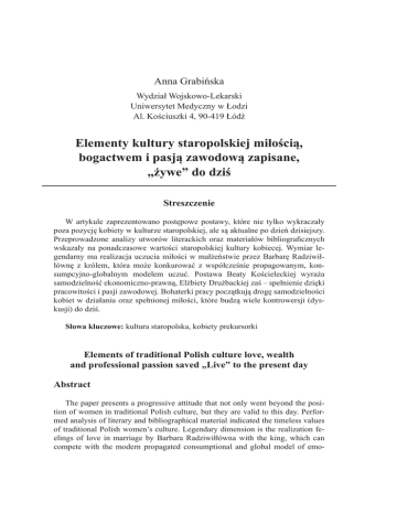 Anna Grabińska Wydział Wojskowo-Lekarski Uniwersytet Medyczny w Łodzi Al. Kościuszki 4, 90-419 Łódź Elementy kultury staropolskiej miłością, bogactwem i pasją zawodową zapisane, „żywe” do dziś Streszczenie W artykule zaprezentowano postępowe postawy, które nie tylko wykraczały poza pozycję kobiety w kulturze staropolskiej, ale są aktualne po dzień dzisiejszy. Przeprowadzone analizy utworów literackich oraz materiałów bibliograficznych wskazały na ponadczasowe wartości staropolskiej kultury kobiecej. Wymiar legendarny ma realizacja uczucia miłości w małżeństwie przez Barbarę Radziwiłłównę z królem, która może konkurować z współcześnie propagowanym, konsumpcyjno-globalnym modelem uczuć. Postawa Beaty Kościeleckiej wyraża samodzielność ekonomiczno-prawną, Elżbiety Drużbackiej zaś – spełnienie dzięki pracowitości i pasji zawodowej. Bohaterki pracy początkują drogę samodzielności kobiet w działaniu oraz spełnionej miłości, które budzą wiele kontrowersji (dyskusji) do dziś. Słowa kluczowe: kultura staropolska, kobiety prekursorki Elements of traditional Polish culture love, wealth and professional passion saved „Live” to the present day Abstract The paper presents a progressive attitude that not only went beyond the position of women in traditional Polish culture, but they are valid to this day. Performed analysis of literary and bibliographical material indicated the timeless values of traditional Polish women’s culture. Legendary dimension is the realization feelings of love in marriage by Barbara Radziwiłłówna with the king, which can compete with the modern propagated consumptional and global model of emo- Anna Grabińska 100 tions. Attitude of Beata Kościelecka expresses economic and legal independence, and Elżbieta Drużbacka fulfillment through hard work and professional passion. Heroines of work initiate the way to independence of women in action and fulfilled love, which are very controversial (disputable) today. Keywords: Old Polish culture, women predecessors Zarys życia kobiet w kulturze staropolskiej Utwory literackie są bardzo dobrym przykładem obrazującym przemiany i wzorce natury politycznej, społecznej i rodzinnej. Tak jak na przestrzeni wieków, tak i w kulturze staropolskiej wzorzec kobiety znajdował umocowanie w panujących stosunkach społecznych, religijnych, obyczajowych oraz wynikających ze struktury życia rodzinnego [1, 8]. Jego podstawę określał przede wszystkim obowiązek zawarcia małżeństwa, dający kobiecie poczucie względnego bezpieczeństwa (prawo do tytułu po mężu), jej zawodem zaś było macierzyństwo. „Nadto czegokolwiek się niewiasta uczy, niech uczy się dla siebie samej lub co najwyżej dla dzieci lub sióstr. Nie godzi się, by stała na czele szkoły, przebywała z mężczyznami lub dysputowała, bo przez to wyzbędzie się wstydliwości i skromności niewieściej”1. Uogólniając, można powiedzieć, że staropolski wzorzec małżeństwa, bez nawiązania głębszych stosunków uczuciowych oraz w poczuciu względnej stabilizacji materialnej, nosił znamię umowy. Alternatywą dla stanu małżeńskiego była realizacja powołania zakonnego. Ważną rolę w kształtowaniu ówczesnej pozycji kobiety odgrywały nie tylko uroda i majętność, ale także energia oraz twórczy rozum, aczkolwiek staropolska edukacja skupia się na nauczaniu chłopców. Dla kobiety niekwestionowanym obowiązkiem, walorem miała być służba mężczyźnie (posłuszeństwo), przy czym im niższy stan miała niewiasta, tym większe posłuszeństwo zobowiązana była wykazać. Ówczesne „ograniczenia dotyczyły w najpoważniejszym stopniu prawa spadkowego, opiekuńczego, małżeńskiego, zdolności sądowej w procesie cywilnym”2 Cyt. za S. Zagórska, Aktualizacja legendy. Życie, posag i problem Halszki z Ostroga, rozprawa doktorska UAM w Poznaniu, Instytut Historii, Poznań 2010, www.repozytorium.amu.edu. pl, s. 67. 2 Ibidem, s. 33. 1 Elementy kultury staropolskiej miłością, bogactwem i pasją zawodową zapisane, „żywe” do dziś 101 oraz działalności politycznej. Dyskryminowane przez przepisy prawne możne kobiety mogły być latami więzione przez mężów we własnych domach, nie uzyskując pomocy nawet ze strony rodziny. W dobrym obyczaju było bicie żon. Mężom zalecano, „kto dobrze kocha, ten tęgo bije”3. Zależne w małżeństwie kobiety miały ograniczony dostęp do majętności, nawet tych, które wniosły do małżeństwa jako posag. W temacie staropolskiej miłości małżeńskiej, reżyserowanej najczęściej przez rodziców na rzecz umocnienia pozycji ekonomiczno-politycznej rodu, rolę kobiety ograniczono do prokreacji i przyjaźni. Najbardziej cenione kobiece wzorce ówczesnych czasów miały bohaterki przedstawione przez Sienkiewicza w Trylogii. Ich umocowanie w kulturze staropolskiej wynikało z bogobojności, nieprzeciętnej urody oraz opiekuńczości. Kobietą bez skazy, wyznającą czyste uczucia, kontrolującą je jest Helena Kurcewiczówna. Na drodze życia Helena jest pełna wiary w ludzi, akceptuje wyznaczonego męża, jest mu całkowicie oddaną oddana [6]. W sferze życia kobiet staropolskich można wskazać dwie główne determinanty, tj. wyraźnie zakreślone normy postępowania oraz ich akceptowalność przez całokształt ówczesnego społeczeństwa. W takich uwarunkowaniach niezwykle trudną, wymagającą dużej odwagi sztuką była realizacja kobiecych pragnień, wykraczających poza tak jasno zakreśloną sferę życia. Kobiety, które łamały panujące normy obyczajowe, były nienawidzone. Spotykało je potępienie, ponieważ zajmowały nienależne im miejce tej sfery. Kobiety staropolskie, ale jakże ponadczasowe Barbara Radziwiłłówna wybór miłości Szczęśliwe i nieszczęśliwe losy królowej do dziś wzbudzają zainteresowanie historyków, ludzi sztuki oraz czytelników [3, 5, 7, 8]. Osąd Barbary w pismach histor